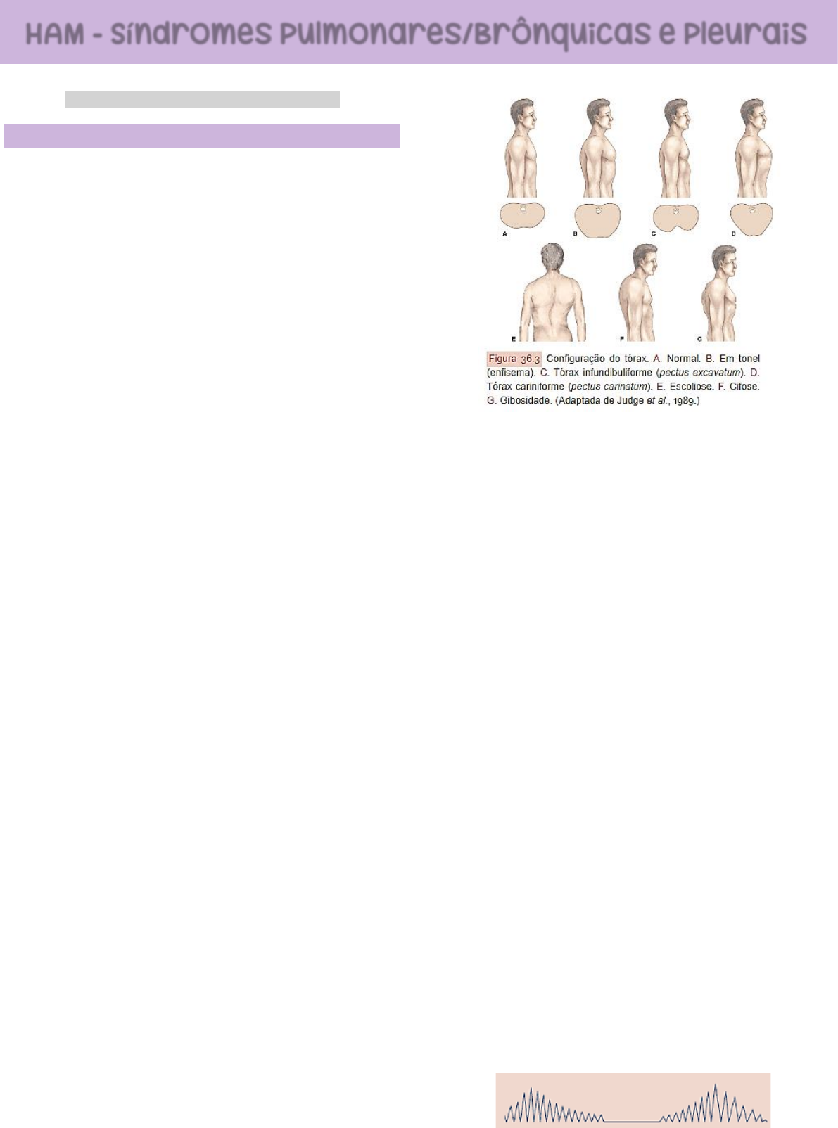 SEMIOLOGIA DO SISTEMA RESPIRATÓRIO INSPEÇÃO O tórax é observado tanto com o paciente sentado como deitado. INSPEÇÃO ESTÁTICA Examinam-se a forma do tórax e suas anomalias estruturais, congênitas ou adquiridas, localizadas ou difusas, simétricas ou não. O sistema muscular deve ser examinado de maneira comparativa, a fim de que se possa surpreender alterações tróficas de grupos musculares. O sinal de Lemos Torres, caracterizado pelo abaulamento dos espaços intercostais durante a expiração, é sinal de derrame pleural. O tórax normal é aquele sem qualquer anormalidade. Tórax chato/plano -> perde a convexidade normal da parede anterior, havendo redução no diâmetro anteroposterior. ❖ É próprio dos indivíduos longilíneos. ❖ Encontrado em alguns pacientes com doença pulmonar crônica. Tórax em tonel/globoso -> aumento exagerado do diâmetro anteroposterior, horizontalização dos arcos costais e abaulamento da coluna dorsal, tornando o tórax mais curto. ❖ É observado nos enfisematosos do tipo soprador rosado. Tórax infundibuliforme (pectus excavatum) -> há uma depressão na parte inferior do esterno e região epigástrica. É de natureza congênita. Tórax cariniforme (pectus carinatum) -> o esterno é proeminente e as costelas horizontalizadas, resultando em tórax que se assemelha ao das aves (tórax de pombo). Pode ser de origem congênita ou adquirida. Tórax cônico/em sino -> é aquele que tem a parte inferior exageradamente alargada, lembrando um tronco de cone ou um sino. ❖ Encontrado nas hepatoesplenomegalias e ascites volumosas. Tórax cifótico -> a principal característica é a curvatura da coluna dorsal, formando uma gibosidade. Pode ser de origem congênita ou resultar da má postura. ❖ TB óssea (mal de Pott), osteomielite ou neoplasias podem ser responsáveis por essa deformidade. Tórax cifoescoliótico -> apresenta, além da cifose, um desvio da coluna para o lado (escoliose). INSPEÇÃO DINÂMICA Observam-se os movimentos respiratórios, suas características e alterações. Como se apresenta o paciente? Está em ortopneia, preferindo, portanto, ser examinado sentado? Sua recusa em deitar-se é um dado que sugere IC. ❖ Taquipneia -> FR > ou igual a 25irm. ❖ Bradipneia -> FR < 8irm. ! Quando não houver sincronismo entre os movimentos respiratórios abdominais e torácicos, suspeitar de fadiga muscular diafragmática. ❖ Pleuropneumopatias -> no início, os movimentos respiratórios deixam de ser simétricos, podendo-se observar redução ou até imobilidade do hemitórax comprometido. ❖ DPOC grave -> a expiração, além de prolongada, é difícil, o que obriga a manter os lábios semicerrados durante a expiração. ❖ Espondilite anquilosante -> ambos os hemitórax pode estar totalmente paralisados. Quanto ao ritmo respiratório, normalmente, a inspiração dura quase o mesmo tempo que a expiração, intercalados por leve pausa. Quando alguma dessas características modifica-se, surgem os ritmos respiratórios anormais: Respiração de Cheyne-Stokes -> ciclo de ventilações que aumentam gradativamente de amplitude e em seguida reduzem também gradativamente de amplitude até um período de apneia. ❖ As causas mais frequentes desse ritmo respiratório são IC grave, AVC, traumatismos cranioencefálicos e síndromes respiratórias. HAM - Síndromes Pulmonares/Brônquicas e Pleurais Respiração de Biot -> respiração de amplitude e frequência variáveis e períodos de apneia. As causas desse ritmo são as mesmas da respiração de Cheyne-Stokes. É sempre patológica. Respiração de Kussmaul -> inspirações profundas seguidas de pausas. É indicativa de acidose metabólica. TIRAGEM Durante a inspiração, em condições de normalidade, os espaços intercostais deprimem-se ligeiramente. Se ocorrer obstrução brônquica, o parênquima correspondente àquele brônquio entra em colapso, provocando a retração dos espaços intercostais. A tiragem pode ser difusa/localizada, isto é, supraclavicular, infraclavicular, intercostal ou epigástrica. Essas áreas retráteis caracterizam a impossibilidade de o pulmão acompanhar o movimento expansivo da caixa torácica, devido à atelectasia subjacente. PALPAÇÃO Complementa a inspeção, avaliando a mobilidade da caixa torácica. Além disso, permite examinar lesões superficiais quanto a forma, volume e consistência. A sensibilidade superficial e profunda, a dor provocada e espontânea ou qualquer outra manifestação dolorosa podem ser avaliadas pela palpação. Além disso, podem ser avaliados temperatura, sudorese, enfisema, linfonodos e nódulos subcutâneos. EXPANSIBILIDADE Expansibilidade dos ápices pulmonares é pesquisada com ambas as mãos espalmadas, de modo que as bordas internas toquem a base do pescoço, os polegares apoiem-se na coluna vertebral e os demais dedos nas fossas supraclaviculares. Expansibilidade das bases pulmonares é pesquisada apoiando-se os polegares nas linhas paravertebrais, enquanto os outros dedos recobrem os últimos arcos costais. ! Em ambas as manobras, o médico fica atrás do paciente sentado. O paciente deve respirar profunda e pausadamente. FRÊMITO TORACOVOCAL (33) Corresponde às vibrações das cordas vocais transmitidas à parede torácica. O paciente deve pronunciar palavras ricas em consoantes (ex.: “trinta e três”). O examinador deve colocar a mão direita espalmada sobre a superfície do tórax, comparando-se a intensidade das vibrações em regiões homólogas. Afecções Pleurais -> são “antipáticas” ao FTV. Isso porque os derrames pleurais líquidos/gasosos, por afastarem o pulmão da parede, dificultam a transmissão das vibrações até a superfície, com redução ou até mesmo abolição do FTV. Condensações Pulmonares -> são “simpáticas” ao FTV. Desde que os brônquios estejam permeáveis, o FTV torna-se mais nítido, uma vez que a consolidação do parênquima facilita a transmissão da voz. ! Es