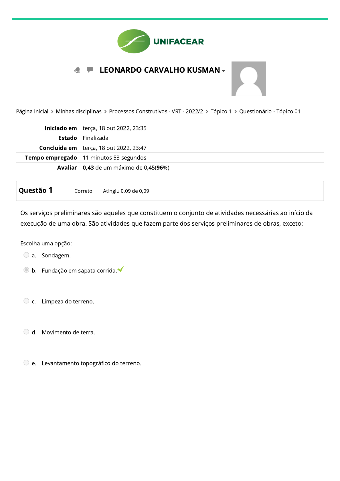 Iniciado em terça, 18 out 2022, 23:35 Estado Finalizada Concluída em terça, 18 out 2022, 23:47 Tempo empregado 11 minutos 53 segundos Avaliar 0,43 de um máximo de 0,45(96%) Questão 1 Correto Atingiu 0,09 de 0,09 Os serviços preliminares são aqueles que constituem o conjunto de atividades necessárias ao início da execução de uma obra. São atividades que fazem parte dos serviços preliminares de obras, exceto: Escolha uma opção: a. Sondagem. b. Fundação em sapata corrida. c. Limpeza do terreno. d. Movimento de terra. e. Levantamento topográ�co do terreno. LEONARDO CARVALHO KUSMAN Página inicial Minhas disciplinas Processos Construtivos - VRT - 2022/2 Tópico 1 Questionário - Tópico 01 https://ava.unifacear.edu.br/ https://ava.unifacear.edu.br/user/view.php?id=11699&course=110495 javascript:void(0) https://ava.unifacear.edu.br/ https://ava.unifacear.edu.br/course/view.php?id=110495§ion=0 https://ava.unifacear.edu.br/course/view.php?id=110495§ion=1 https://ava.unifacear.edu.br/mod/quiz/view.php?id=799711 Questão 2 Correto Atingiu 0,09 de 0,09 Nos serviços de demolição, como medida preventiva, faz-se necessário que: Escolha uma opção: a. as plataformas de retenção de entulhos sejam instaladas em parte do perímetro da obra, durante a sua execução. b. as canalizações de esgoto sejam protegidas ou isoladas logo após o início do trabalho. c. todas as aberturas existentes no piso sejam fechadas e removidos os elementos frágeis imediatamente após o início da demolição de um pavimento. d. as linhas de fornecimento de energia elétrica e de gás sejam desligadas logo após o início do trabalho. e. os entulhos sejam removidos, por gravidade, em calhas fechadas, com inclinação máxima de 45º , �xadas à edi�cação em todos os pavimentos. Questão 3 Correto Atingiu 0,09 de 0,09 A primeira etapa do processo de construção de edifícios e obras civis, após a criação, desenho e aprovação do projeto de uma obra é denominada serviços preliminares. Esta fase trata da preparação do terreno, e envolve uma série de passos como a limpeza e a sondagem do solo, o levantamento topográ�co, a locação da obra, a montagem do barracão e o pedido de ligações provisórias de água e energia elétrica, necessárias para o andamento da obra. A respeito dos serviços preliminares, analise as proposições abaixo: I) Quando uma escavação não puder ser contida apenas com a presença de taludes, deve-se prever o escoramento das paredes do corte. II) Terraplenagem é a movimentação de terra por corte ou aterro de uma determinada área, com o objetivo de torná-la plana e, se necessário ao projeto, horizontal. III) A movimentação de terra por corte é a técnica que permite de�nir qual o tipo de fundação que melhor se adapta ao terreno, de acordo com as características da estrutura. Com os cortes sucessivos do terreno, é possível identi�car, quando necessário, o tipo de contenção mais adequada. Assinale a alternativa correta: Escolha uma opção: a. I e II, corretas. b. II e III, corretas. c. Somente I correta. d. I e III, corretas. e. I, II e III corretas. Questão 4 Correto Atingiu 0,09 de 0,09 O Rebaixamento do Lençol Freático é uma técnica muito empregada na construção de prédios com subsolos.Todo terreno possui um lençol de água no seu subsolo e essa água atrapalha a escavação do terreno pois causa a formação de lama o que dificulta a concretagem. A partir disso, analise as afirmativas abaixo sobre os possíveis motivos para se realizar o rebaixamento do lençol freático em uma edificação. I) Interceptação da água percolada que emerge nos taludes e fundo de escavações. II) Aumentar a estabilidade de taludes e evitar o carreamento de partículas do solo. III) Aumentar a carga lateral em estruturas de escoramento. IV) Melhorar as condições de escavação e reaterro. Assinale a alternativa correta: Escolha uma opção: a. I, II e III corretas. b. II, III e IV corretas. c. I, II, III e IV corretas. d. I, II e IV corretas. e. I e IV corretas. Questão 5 Parcialmente correto Atingiu 0,07 de 0,09 O processo de movimentação de terra, conhecido como terraplenagem, é constituído por algumas operações básicas que ocorrem em sequência ou de forma simultânea. São fases integrantes da movimentação de terra as opções: Escolha uma ou mais: a. escavação. b. descarga com espalhamento. c. limpeza do terreno. d. carga do material escavado. e. remoção com transporte. ◄ Tópico 01 - Conceitos Fundamentais Seguir para... Tópíco 02 - Livro Texto ► https://ava.unifacear.edu.br/mod/resource/view.php?id=799709&forceview=1 https://ava.unifacear.edu.br/mod/resource/view.php?id=799716&forceview=1