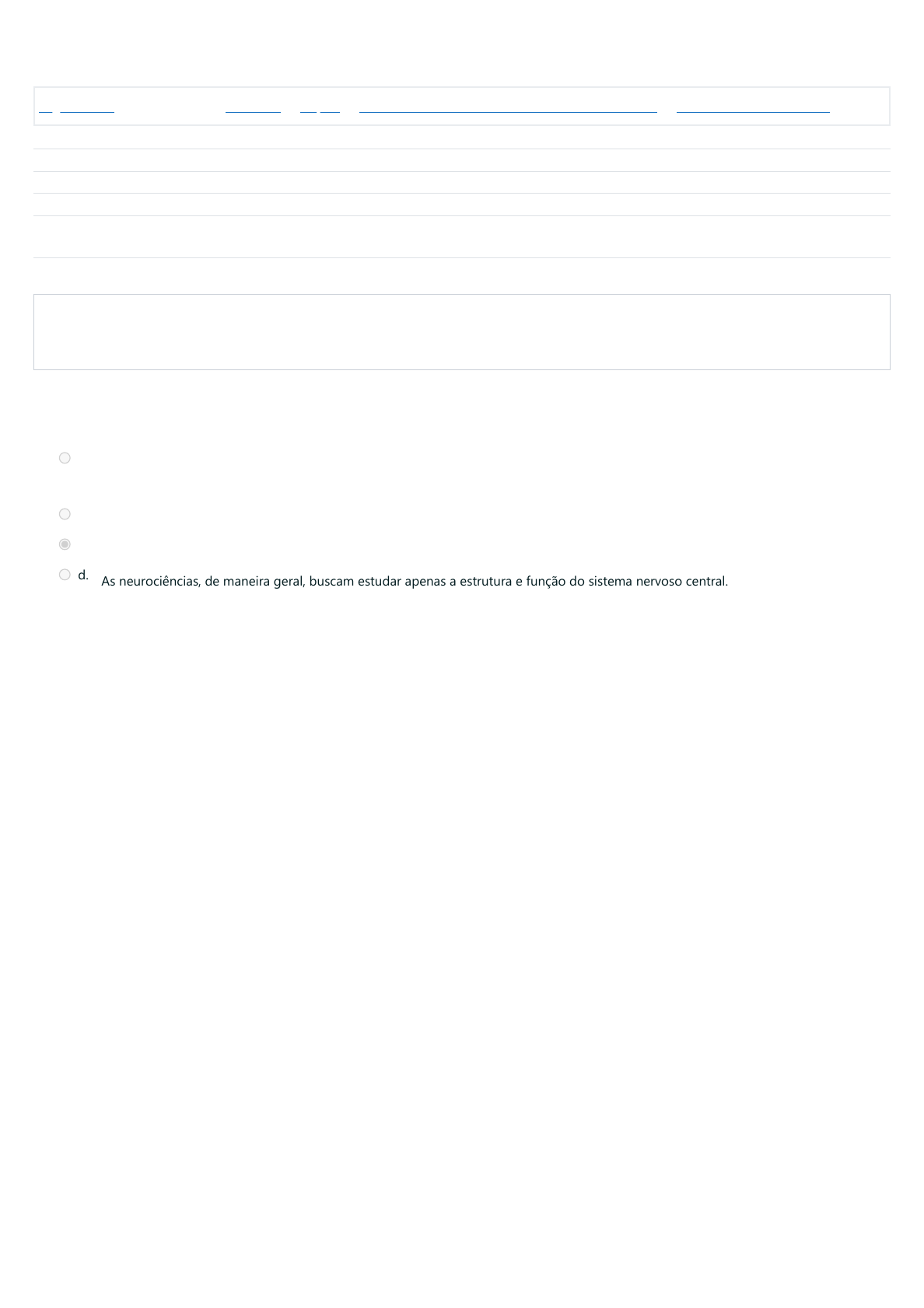 Página inicial / Meus cursos / CVE 2022 / Seções / Conceitos básicos sobre o Sistema Nervoso Central / Questionário da Semana 1 Iniciado em domingo, 20 nov 2022, 07:19 Estado Finalizada Concluída em domingo, 20 nov 2022, 07:20 Tempo empregado 1 minuto 7 segundos Avaliar 6,00 de um máximo de 10,00(60%) Questão 1 Incorreto Atingiu 0,00 de 2,00 A respeito do sistema nervoso, assinale a alternativa INCORRETA: a. Evidências do funcionamento do sistema nervoso central foram obtidas em estudos que envolvem lesões ou danos a determinadas estruturas encefálicas. b. O sistema nervoso central é formado pelo encéfalo e medula espinhal. c. O sistema nervoso periférico é formado por nervos e gânglios. d. As neurociências, de maneira geral, buscam estudar apenas a estrutura e função do sistema nervoso central. Sua resposta está incorreta. A alternativa incorreta é a D, uma vez que a neurociência se volta não apenas para o estudo do sistema nervoso central e sim do sistema nervoso como um todo, incluindo o periférico. A resposta correta é: As neurociências, de maneira geral, buscam estudar apenas a estrutura e função do sistema nervoso central. https://cursosextensao.usp.br/ https://cursosextensao.usp.br/course/view.php?id=3333 https://cursosextensao.usp.br/course/view.php?id=3333 https://cursosextensao.usp.br/course/view.php?id=3333§ion=3 https://cursosextensao.usp.br/mod/quiz/view.php?id=189202 Portaria Grafisa Realce Questão 2 Incorreto Atingiu 0,00 de 2,00 Questão 3 Correto Atingiu 2,00 de 2,00 A respeito dos termos cérebro e encéfalo, assinale a alternativa CORRETA: a. Cérebro e encéfalo são sinônimos. b. O encéfalo é uma parte do cérebro. c. O cérebro é uma parte do encéfalo. d. Os lobos cerebrais não estão localizados no encéfalo. Sua resposta está incorreta. A alternativa correta é a C. Apesar de muitos vídeos e textos (inclusive os disponibilizados neste curso) utilizarem o termo cérebro de uma maneira mais geral, em neuroanatomia, temos que "cérebro" se refere apenas à uma parte do encéfalo, enquanto "encéfalo" (tudo que está localizado dentro da caixa craniana) engloba o cérebro, o cerebelo e o tronco encefálico. A resposta correta é: O cérebro é uma parte do encéfalo. O encéfalo e o comportamento humano estão intimamente interrelacionados, de modo que mudanças no encéfalo podem afetar diretamente o comportamento e vice-versa. Escolha uma opção: Verdadeiro Falso A afirmação acima é verdadeira. Casos clássicos das neurociências como o do paciente H.M. e Phineas Gage exemplificam alterações (lesões) realizadas no encéfalo que proporcionaram mudanças no comportamento. De maneira oposta, certos comportamentos como a realização de atividades físicas (ou leitura) podem proporcionar alterações químicas e físicas (morfológicas) no encéfalo. A resposta correta é 'Verdadeiro'. Portaria Grafisa Realce Portaria Grafisa Realce Questão 4 Correto Atingiu 2,00 de 2,00 Questão 5 Correto Atingiu 2,00 de 2,00 Um dado objeto de conhecimento pode ser estudado em diferentes níveis de análise. No campo das neurociências, entende-se que: a. Pesquisar sobre o funcionamento de estruturas encefálicas em um nível reducionista (exemplo: funcionamento de receptores) é inútil para aplicações cotidianas. b. É possível que o estudo de estruturas encefálicas em um nível reducionista impulsione pesquisas em outros níveis, como por exemplo o nível social. c. Descobertas feitas em um determinado nível de análise em neurociências podem ampliar a compreensão de dados já obtidos em outros níveis (exemplo: a compreensão de funcionamento de receptores pode ser útil para se compreender psicopatologias). d. As alternativas B e C estão corretas. Sua resposta está correta. Tanto B quanto C estão corretas, uma vez que as neurociências utilizam métodos de pesquisa e de análise em diferentes níveis em prol da obtenção de dados mais abrangentes sobre seu tema de interesse. A resposta correta é: As alternativas B e C estão corretas. As neurociências e a educação (ou neuroeducação) são áreas com interesses de estudo em comum. Dentre eles, podemos citar: a. Memória. b. Aprendizagem. c. Efeitos de patologias na forma como o indivíduo aprende e interage com o ambiente. d. A forma como interações humanas afetam a aprendizagem. e. Todas as alternativas estão corretas. Sua resposta está correta. Todos os temas apontados são de interesse comum nas duas áreas, costumando abarcar tanto neurocientistas como educadores. A resposta correta é: Todas as alternativas estão corretas. Portaria Grafisa Realce Portaria Grafisa Realce ◄ PSICOPATOLOGIAS RETRATADAS EM OBRAS DE ARTE Seguir para... https://cursosextensao.usp.br/mod/resource/view.php?id=189530&forceview=1