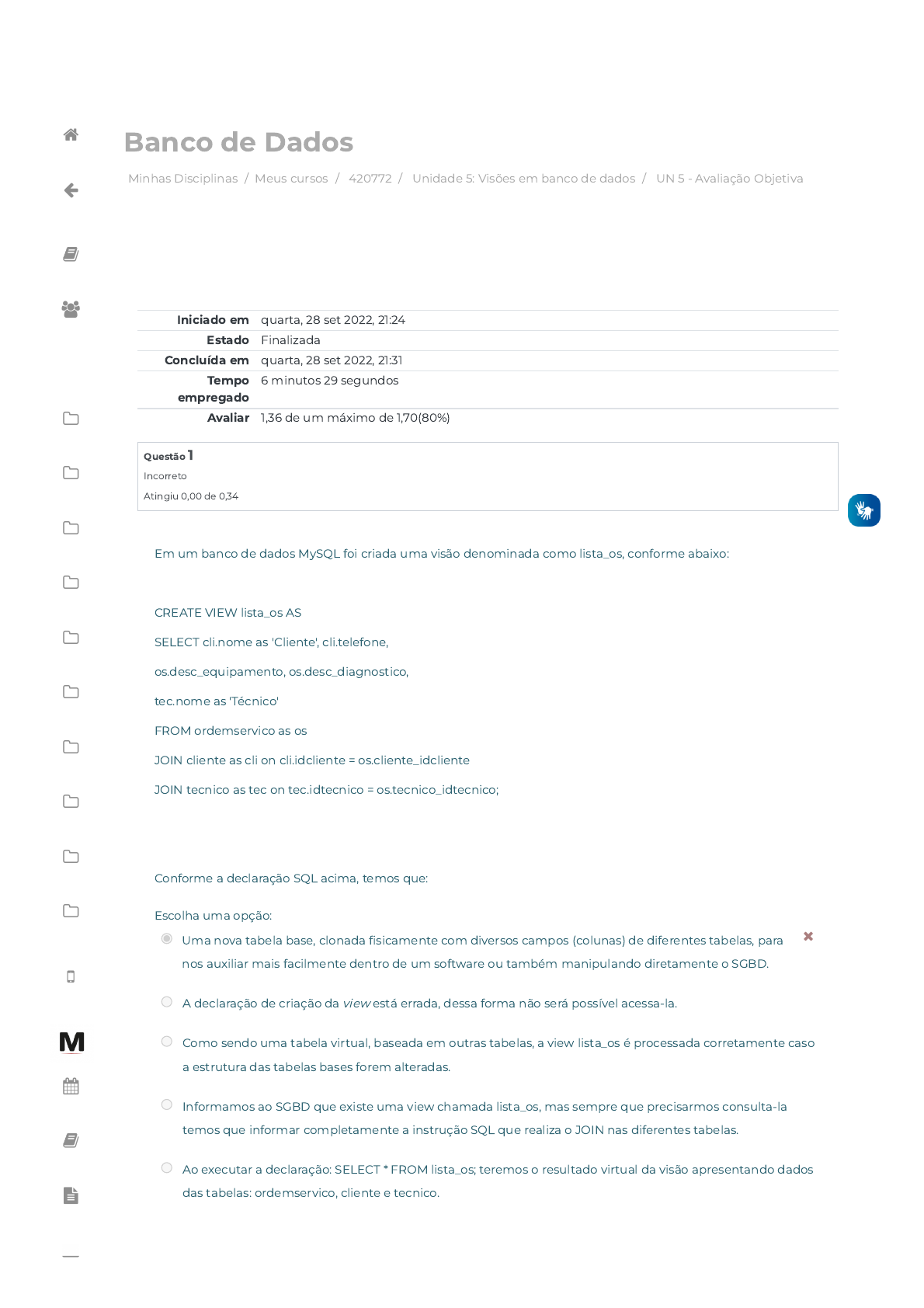 20/11/2022 14:57 UN 5 - Avaliação Objetiva: Revisão da tentativa https://avap.multivix.edu.br/mod/quiz/review.php?attempt=1999785&cmid=1259511 1/5 Minhas Disciplinas / Meus cursos / 420772 / Unidade 5: Visões em banco de dados / UN 5 - Avaliação Objetiva Banco de Dados Iniciado em quarta, 28 set 2022, 21:24 Estado Finalizada Concluída em quarta, 28 set 2022, 21:31 Tempo empregado 6 minutos 29 segundos Avaliar 1,36 de um máximo de 1,70(80%) Questão 1 Incorreto Atingiu 0,00 de 0,34 Em um banco de dados MySQL foi criada uma visão denominada como lista_os, conforme abaixo: CREATE VIEW lista_os AS SELECT cli.nome as 'Cliente', cli.telefone, os.desc_equipamento, os.desc_diagnostico, tec.nome as 'Técnico' FROM ordemservico as os JOIN cliente as cli on cli.idcliente = os.cliente_idcliente JOIN tecnico as tec on tec.idtecnico = os.tecnico_idtecnico; Conforme a declaração SQL acima, temos que: Escolha uma opção: Uma nova tabela base, clonada �sicamente com diversos campos (colunas) de diferentes tabelas, para nos auxiliar mais facilmente dentro de um software ou também manipulando diretamente o SGBD. A declaração de criação da view está errada, dessa forma não será possível acessa-la. Como sendo uma tabela virtual, baseada em outras tabelas, a view lista_os é processada corretamente caso a estrutura das tabelas bases forem alteradas. Informamos ao SGBD que existe uma view chamada lista_os, mas sempre que precisarmos consulta-la temos que informar completamente a instrução SQL que realiza o JOIN nas diferentes tabelas. Ao executar a declaração: SELECT * FROM lista_os; teremos o resultado virtual da visão apresentando dados das tabelas: ordemservico, cliente e tecnico. https://avap.multivix.edu.br/my/ https://avap.multivix.edu.br/course/view.php?id=19141 https://avap.multivix.edu.br/course/view.php?id=19141§ion=6 https://avap.multivix.edu.br/mod/quiz/view.php?id=1259511 https://avap.multivix.edu.br/my/ https://avap.multivix.edu.br/course/view.php?id=19141 https://avap.multivix.edu.br/user/index.php?id=19141 https://avap.multivix.edu.br/course/view.php?id=19141§ion=1 https://avap.multivix.edu.br/course/view.php?id=19141§ion=2 https://avap.multivix.edu.br/course/view.php?id=19141§ion=3 https://avap.multivix.edu.br/course/view.php?id=19141§ion=4 https://avap.multivix.edu.br/course/view.php?id=19141§ion=5 https://avap.multivix.edu.br/course/view.php?id=19141§ion=6 https://avap.multivix.edu.br/course/view.php?id=19141§ion=7 https://avap.multivix.edu.br/course/view.php?id=19141§ion=8 https://avap.multivix.edu.br/course/view.php?id=19141§ion=9 https://avap.multivix.edu.br/course/view.php?id=19141§ion=10 https://avap.multivix.edu.br/hooks/portal/ https://avap.multivix.edu.br/mod/page/view.php?id=1252%2F%22%20target%3D%22_blank https://avap.multivix.edu.br/calendar/view.php/ https://avap.multivix.edu.br/local/staticpage/view.php?page=biblioteca https://portalweb.multivix.edu.br/gabaritos/login.aspx https://multivix.edu.br/office-365/ https://avap.multivix.edu.br/ 20/11/2022 14:57 UN 5 - Avaliação Objetiva: Revisão da tentativa https://avap.multivix.edu.br/mod/quiz/review.php?attempt=1999785&cmid=1259511 2/5 Questão 2 Correto Atingiu 0,34 de 0,34 Em relação às visões (views) em banco de dados arquitetados de forma inteligível, com otimização de relações e projetados para armazenar dados sem redundâncias, as views são ferramentas poderosas principalmente quanto a tempo de retrabalho. Através de views escrevemos as consultas somente uma vez e as armazenamos para acesso sempre que precisar, e logo, quando necessário realizar manutenções nas consultas as fazemos somente em um local. PORQUE Em softwares que precisam sempre recuperar dados em diversas partes, é comum que tenhamos sempre as mesmas consultas. A partir das informações do enunciado e das assertivas apresentadas, assinale a alternativa correta. Escolha uma opção: As duas assertivas são verdadeiras e a segunda não justi�ca a primeira. A primeira assertiva é verdadeira e a segunda é falsa. A primeira assertiva é falsa e a segunda é verdadeira. A primeira e segunda assertivas são falsas. As duas assertivas são verdadeiras e a segunda justi�ca a primeira. https://avap.multivix.edu.br/my/ https://avap.multivix.edu.br/course/view.php?id=19141 https://avap.multivix.edu.br/user/index.php?id=19141 https://avap.multivix.edu.br/course/view.php?id=19141§ion=1 https://avap.multivix.edu.br/course/view.php?id=19141§ion=2 https://avap.multivix.edu.br/course/view.php?id=19141§ion=3 https://avap.multivix.edu.br/course/view.php?id=19141§ion=4 https://avap.multivix.edu.br/course/view.php?id=19141§ion=5 https://avap.multivix.edu.br/course/view.php?id=19141§ion=6 https://avap.multivix.edu.br/course/view.php?id=19141§ion=7 https://avap.multivix.edu.br/course/view.php?id=19141§ion=8 https://avap.multivix.edu.br/course/view.php?id=19141§ion=9 https://avap.multivix.edu.br/course/view.php?id=19141§ion=10 https://avap.multivix.edu.br/hooks/portal/ https://avap.multivix.edu.br/mod/page/view.php?id=1252%2F%22%20target%3D%22_blank https://avap.multivix.edu.br/calendar/view.php/ https://avap.multivix.edu.br/local/staticpage/view.php?page=biblioteca https://portalweb.multivix.edu.br/gabaritos/login.aspx https://multivix.edu.br/office-365/ https://avap.multivix.edu.br/ 20/11/2022 14:57 UN 5 - Avaliação Objetiva: Revisão da tentativa https://avap.multivix.edu.br/mod/quiz/review.php?attempt=1999785&cmid=1259511 3/5 Questão 3 Correto Atingiu 0,34 de 0,34 Em relação a criação de views em banco de dados, da mesma forma que utilizamos a declaração CREATE utilizando DDL em SQL na criação de tabelas físicas de banco de dados, o fazemos para criar views. Assinale a alternativa que apresenta corretamente a sinxtaxe de criação de uma visão básica em banco de dados: Escolha uma opção: CREATE VIEW <nome da VIEW> FROM SELECT <condição> WHERE <nome da tabela>; VIEW CREATE <nome da VIEW> (<nome