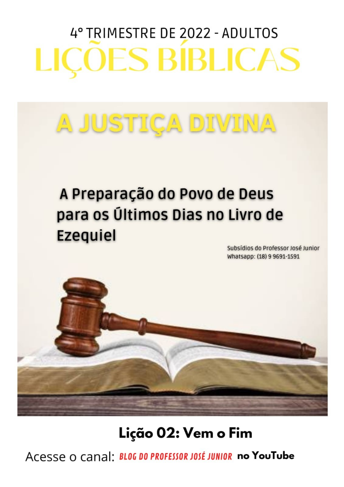Subsídios EBD Andradina 4º Trimestre de 2022 Lição 02: Vem o Fim Professor José Junior Contato: (18) 9 9691- 1591 – só whatsapp Subsídios EBD Andradina 4º Trimestre de 2022 Lição 02: Vem o Fim Texto Áureo: E tu, ó filho do homem, assim diz o Senhor JEOVÁ acerca da terra de Israel: Vem o fim, o fim vem sobre os quatro cantos da terra (Ou seja, “Não tem para onde escapar”. Russel Norman Champlin, notável estudioso das Sagradas Escrituras disse que; esta expressão “Os quatro cantos da terra” se encontra na crença de que a terra tinha o formato chato, retangular, ou era uma planície retangular; com quatro cantos literais.). Ezequiel 7.2 (Ao anunciar a Palavra de Deus Ezequiel está assim cumprindo seu papel de atalaia soando a trombeta na terra de Israel). John B. Taylor (teólogo inglês) disse que; A destruição de Jerusalém era inconcebível à mente israelita. Enquanto Deus fosse Deus, o Templo de Deus e a cidade de Deus ficariam em pé. Esta fora a mensagem de Isaías quando os reis de Judá tinham temido pela segurança da cidade e estavam cogitando pedir a assistência de exércitos pagãos. Agora, porém, a situação era diferente. A confiança de Isaías já não podia ser justificada após 150 anos de apostasia cada vez maior. O povo estava vivendo no passado, mas Deus estava julgando o presente. Seu veredito era que o fim estava iminente. Russel Norman Champlin disse que; A idolatria-adultério-apostasia de Judá receberia, logo, seu devido castigo. A paciência divina se esgotara. A Lei Moral da Colheita segundo a Semeadura escreveria o “fim” de Judá. Yahweh não podia mais tolerar as condições perversas e os corações duros. No início, o pecado talvez pareça agradável e prazenteiro (prazeroso, simpático, alegre), mas concluída a sua trajetória, fica o seu rastro de destruição, angústia e desespero. O único caminho de livramento é a volta para Deus, com arrependimento e fé, Israel aprenderia isso a “duras penas” (muita dificuldade, sofrimento, preço alto). Professor José Junior Contato: (18) 9 9691- 1591 – só whatsapp Subsídios EBD Andradina 4º Trimestre de 2022 Lição 02: Vem o Fim 1 – Sobre a Profecia 1. Introdução (v.v.1,2a). 2. Extensão (v 2b). 3. Quando ? (vv. 3a , 8 a). Daniel Isaac Block (Estudioso canadense do Antigo Testamento) disse que; Dentro da tradição profética, o anúncio “Vem o fim, o fim vem” representa uma fórmula profética padronizada que deveria ter lançado terror sobre qualquer um que a tivesse ouvido (ver Gênesis 6.13; Jeremias 51.13; Lamentações 4.18; Amós 8.1-2). Seu significado é refletido na interpretação de Amós quanto à fruta de verão: “Chegou o fim para o meu povo de Israel! Não os tolerarei” mais!” (Amós 8.2). No caso de Amós, isto significa que o tempo da graça para a nação acabara. Yahweh cessaria de se relacionar com eles com base nas promessas do pacto e traria sobre eles o efeito das maldições (Amós 8.3-14). Ezequiel adapta a fórmula para os próprios propósitos, concentrando-se na terra em vez do povo como objeto da ira de Deus. Declara inicialmente que o fim envolve os quatro cantos da terra, uma figura literária derivada da oficina de alguém que trabalha com roupas e estica uma peça retangular de roupa (veja Deuteronômio 22.12). Em Jó 38.13 a terra é poeticamente comparada a um lençol que é tomado pelas “pontas” e sacudido de maneira que o perverso é lançado fora, assim como migalhas de pão de uma toalha de mesa. Vejamos o que diz Ezequiel 7.3-8; 3.Agora, vem o fim sobre ti, porque enviarei sobre ti a minha ira, e te julgarei conforme os teus caminhos, e trarei sobre ti todas as tuas abominações. 4.E não te poupará o meu olho, nem terei piedade de ti, mas porei sobre ti os teus caminhos, e as tuas abominações estarão no meio de ti; e sabereis que eu sou o SENHOR. 5.Assim diz o Senhor JEOVÁ: Um mal, eis que um só mal vem. Professor José Junior Contato: (18) 9 9691- 1591 – só whatsapp Subsídios EBD Andradina 4º Trimestre de 2022 Lição 02: Vem o Fim 6.Vem o fim, o fim vem, despertou-se contra ti; eis que vem; 7.vem a tua sentença, ó habitante da terra. Vem o tempo; chegado é o dia da turbação, e não da alegria, sobre os montes. 8.Agora, depressa derramarei o meu furor sobre ti ( Daniel Isaac Block disse que; Essa expressão idiomática é derivada de uma imagem de um caldeirão fervendo, cujo conteúdo é derramado sobre uma vítima infeliz ), e cumprirei a minha ira contra ti, e te julgarei conforme os teus caminhos, e porei sobre ti todas as tuas abominações. Ezequiel 7.3-8 Vemos que o profeta Ezequiel foi falar com os judeus que estavam exilados e morando junto ao rio Quebar (Ezequiel 3.11-15) e os destinatários da mensagem eram os moradores de Jerusalém (Ezequiel cap 5). Esta expressão faz referência à destruição de Jerusalém, por causa da apostasia e rebelião do povo de Deus (Veja Ezequiel 7.1-7). Esta “crise” que Israel sofreria ainda com maior intensidade em forma de ruína, tristeza, dor e sofrimento era resultado de “crise” espiritual. Sempre que Israel obedecia a Deus, eles eram protegidos, abençoados, consolados. Mas a terrível desobediência de Israel os poria em condições terríveis. No Israel dos tempos de Ezequiel havia, idolatria, falsos profetas, busca pelos próprios interesses, profanação das coisas sagradas e profunda rejeição à vontade de Deus. Os israelitas queriam a proteção de Deus, mas não queriam obedecer a Deus. Israel estava colhendo os frutos de suas próprias escolhas (Gálatas 6.7). Observando atentamente, vemos que a condição do nosso País (e eu poderia dizer, do mundo inteiro), é muito semelhante as condições do Israel dos dias do profeta Ezequiel. Vemos em nosso País a idolatria, os falsos profetas, a busca pelos próprios interesses, a profanação das coisas sagradas, profunda rejeição à vontade de Deus. Vemos muitas vezes falso