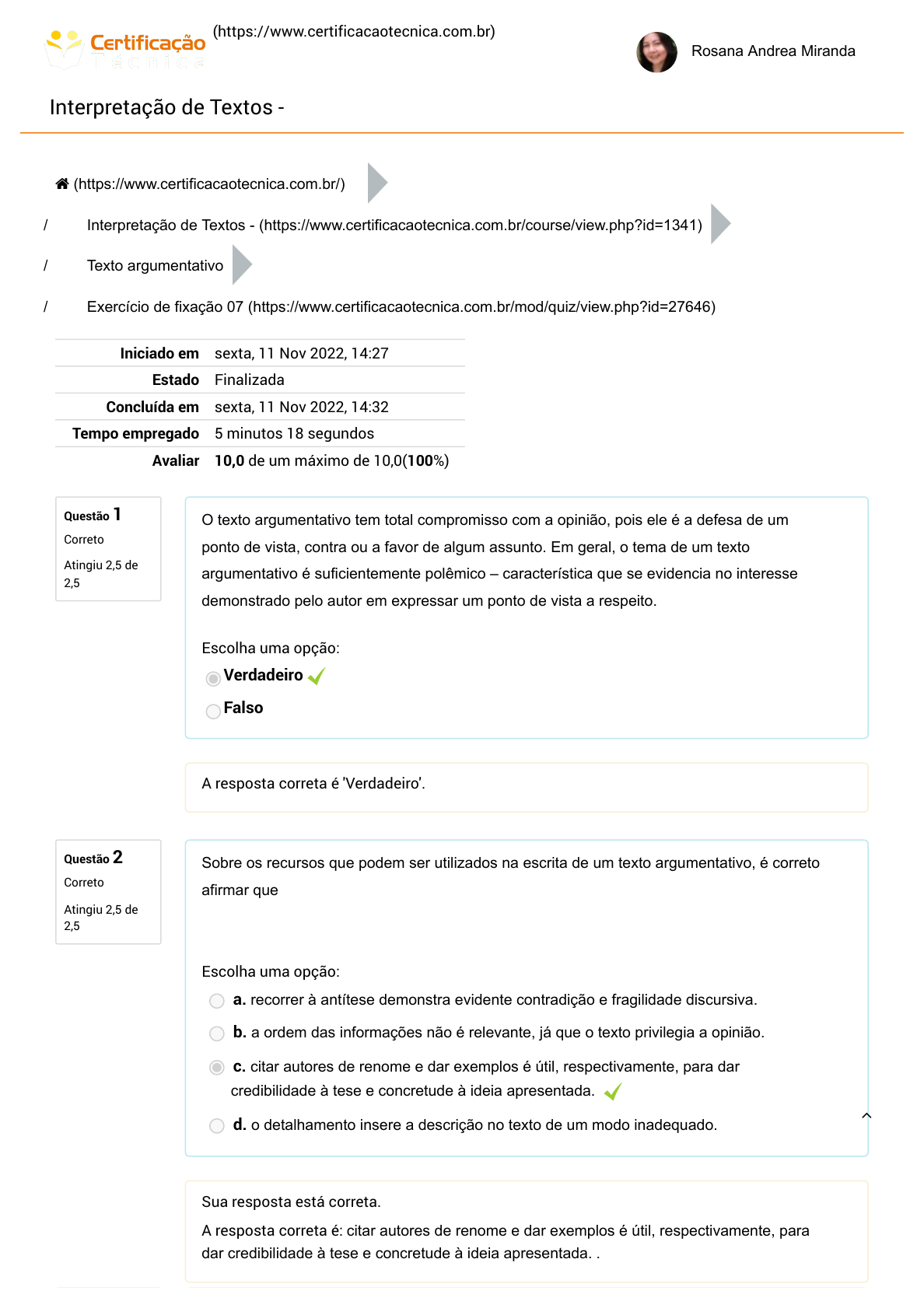 (https://www.certificacaotecnica.com.br) Rosana Andrea Miranda Interpretação de Textos - Questão 1 Correto Atingiu 2,5 de 2,5 Questão 2 Correto Atingiu 2,5 de 2,5 / / / Iniciado em sexta, 11 Nov 2022, 14:27 Estado Finalizada Concluída em sexta, 11 Nov 2022, 14:32 Tempo empregado 5 minutos 18 segundos Avaliar 10,0 de um máximo de 10,0(100%) O texto argumentativo tem total compromisso com a opinião, pois ele é a defesa de um ponto de vista, contra ou a favor de algum assunto. Em geral, o tema de um texto argumentativo é suficientemente polêmico – característica que se evidencia no interesse demonstrado pelo autor em expressar um ponto de vista a respeito. Escolha uma opção: Verdadeiro Falso A resposta correta é 'Verdadeiro'. Sobre os recursos que podem ser utilizados na escrita de um texto argumentativo, é correto afirmar que Escolha uma opção: a. recorrer à antítese demonstra evidente contradição e fragilidade discursiva. b. a ordem das informações não é relevante, já que o texto privilegia a opinião. c. citar autores de renome e dar exemplos é útil, respectivamente, para dar credibilidade à tese e concretude à ideia apresentada. d. o detalhamento insere a descrição no texto de um modo inadequado. Sua resposta está correta. A resposta correta é: citar autores de renome e dar exemplos é útil, respectivamente, para dar credibilidade à tese e concretude à ideia apresentada. . (https://www.certificacaotecnica.com.br/) Interpretação de Textos - (https://www.certificacaotecnica.com.br/course/view.php?id=1341) Texto argumentativo Exercício de fixação 07 (https://www.certificacaotecnica.com.br/mod/quiz/view.php?id=27646) https://www.certificacaotecnica.com.br/ https://www.certificacaotecnica.com.br/ https://www.certificacaotecnica.com.br/course/view.php?id=1341 https://www.certificacaotecnica.com.br/mod/quiz/view.php?id=27646 Questão 3 Correto Atingiu 2,5 de 2,5 Questão 4 Correto Atingiu 2,5 de 2,5 A principal parte do texto argumentativo é Escolha uma opção: a. a introdução. b. a antítese. c. a conclusão. d. o desenvolvimento. Sua resposta está correta. A resposta correta é: o desenvolvimento.. Marque a alternativa que faz a correta recomendação para a escrita de um texto argumentativo. Escolha uma opção: a. Seja detalhista. b. Não use citações. c. Os parênteses não têm nenhuma utilidade. d. Prefira a generalização às especificidades. Sua resposta está correta. A resposta correta é: Seja detalhista. . https://www.certificacaotecnica.com.br/ https://www.certificacaotecnica.com.br/ https://www.certificacaotecnica.com.br/course/view.php?id=1341 https://www.certificacaotecnica.com.br/mod/quiz/view.php?id=27646