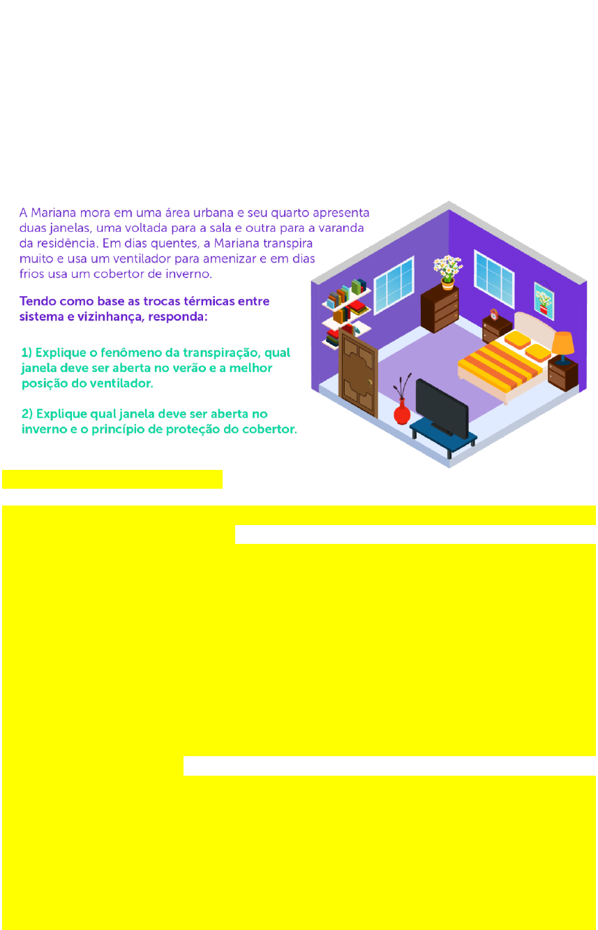 Desafio Condições adequadas de temperatura são essenciais para a propagação da vida em um meio qualquer, entretanto, uma pequena modificação nestas condições é suficiente para causar desde um desconforto até a morte de seres vivos. Para um funcionamento adequado das funções vitais do corpo humano, há a necessidade de manter equilibrada a temperatura interna em aproximadamente 37ºC, entretanto, as intensas trocas de calor entre nosso corpo e o meio em que o mesmo se encontra faz sentir as sensações de frio e calor. Diante de tal contexto, você foi desafiado a explicar o problema térmico do quarto da Marian Padrão de resposta esperado 1) Explique o fenômeno da transpiração, qual janela deve ser aberta no verão e a melhor posição do ventilador. A transpiração é a perda de água pelas células devido a uma elevação da temperatura do corpo. Este fenômeno é essencial para manter a temperatura equilibrada devido a um aumento do metabolismo das células, tendo como consequência a perda de água, que carrega o excesso de calor para fora do corpo. Nestas condições podemos considerar o corpo humano com o sistema em estudo e o ambiente que circunda a vizinhança. Em dias de elevada temperatura ambiente a vizinhança troca calor com o corpo humano, tendo a pele com a fronteira. O calor, portanto, flui da vizinhança (ambiente externo) para dentro do sistema (o corpo). Como consequência tem-se a elevação da temperatura interna e aumento do metabolismo das células, que, para manter o equilíbrio térmico, perde água (com sais minerais solubilizados) que aflora para a pele na forma de suor. Em dias quentes, a Mariana deve abrir de preferência a janela voltada para varanda, e ligar o ventilador posicionando-o de forma a levar o ar mais frio da janela para o interior do quarto. Desta forma, o ar quente que está circundando a pele (fronteira) e provocando a transpiração, trocará calor com o ar frio ambiente (vizinhança) que está vindo da janela, culminado com uma sensação de alívio térmico. Pode-se ainda, aumentar a velocidade do ventilador, isto provoca o afastamento, mais rápido do ar quente próximo da pele. Uma outra opção seria posicionar o ventilador próximo da Mariana (sistema), pois isto provocaria um rápido afastamento do ar quente próximo da pele, mas com uma sensação de alívio menos intensa. 2) Explique qual janela deve ser aberta no inverno e o princípio de proteção do cobertor. No inverno, a Mariana deve abrir de preferência a janela voltada para a sala, pois o ar interno da sala estará a uma temperatura mais próxima do ar do quarto, impedindo assim uma troca de calor efetiva entre o ambiente do quarto (sistema) e o ambiente da sala (vizinhança). Em condições de frio o corpo da Mariana (sistema) estará a uma temperatura maior que a do ambiente do quarto (vizinhança), proporcionando assim uma troca de calor efetiva e ocasionando a sensação de frio. O cobertor, ao ser usado sobre a pele (fronteira), impede que o corpo da Mariana troque calor com o ambiente do quarto, retendo assim o calor no sistema e proporcionado uma sensação de conforto.