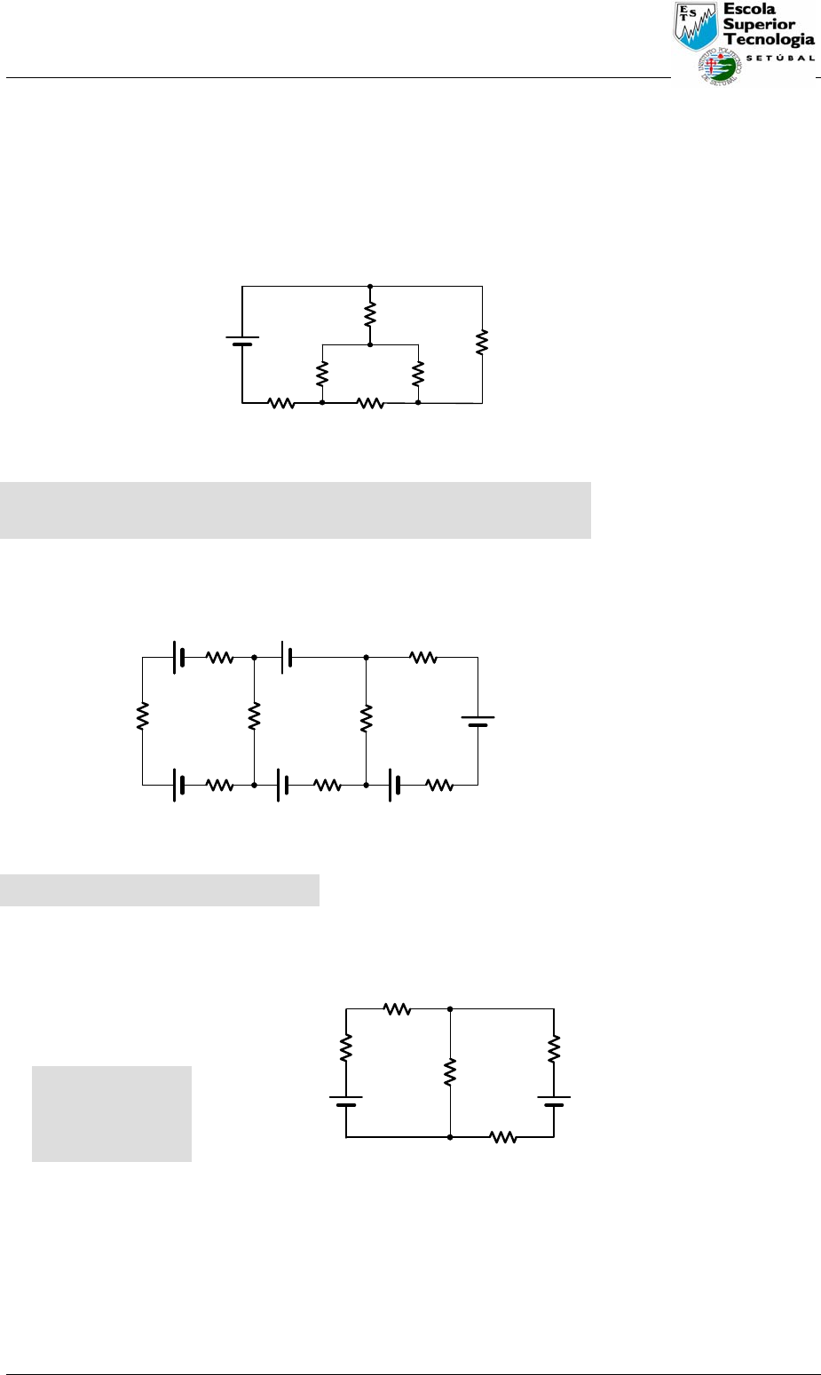 Departamento de Engenharia Electrotécnica Electrónica para Veículos – Engª Mecânica Automóvel, Março de 2004 Pág. 1 Colectânea de exercícios de revisão 1. Calcular a corrente, indicando o seu sentido, e a ddp aos terminais de cada uma das resistências, e respectiva polaridade, da rede da figura R1. 2. Calcular a corrente, indicando o sentido, em cada uma das malhas do circuito da figura R2. 3. Calcular o equivalente de Thévenin da rede entre os pontos a e b e a corrente na resistência Rx. E1 R2 R4 R3 R6 R5 R1 R7 R8E2 E3 E4 E5 E6 E1=2V; E2=5V; E3=1V; E4=4,5V; E5=10V; E6=1,5V; R1=2kΩ; R2=0,5kΩ; R3=1 kΩ; R4= 5kΩ; R5= 1,5kΩ; R6=10 kΩ; R7=2,5kΩ; R8=0,5 kΩ Figura R2 E1 R1 R2 R3 E2 R4 Rx a b E1=6V; E2=10V; R1=R2=20kΩ; R3=R4=30kΩ; Rx= 15kΩ Figura R3 E=10V R1=0,5kΩ R2=2kΩ R3=1,5kΩ R4=4kΩ R5=10kΩ R6=100Ω Figura R1 E R1 R2 R3 R4 R5 R6 R: VR1=1,74V; VR2=5,32V; VR3=2,94V; VR4=2,79V; VR5=8,11V; VR6=0,15V; IR1=3,47mA; IR2=2,66mA; IR3=1,96mA; IR4=0,70mA; IR5=0,81mA; IR6=1,51mA R: I1=1,54mA; I2=2,01mA; I3=2,20mA; R: VTH=7,6V; RTH=24kΩ; IRx=0,195mA Departamento de Engenharia Electrotécnica Electrónica para Veículos – Engª Mecânica Automóvel, Março de 2004 Pág. 2 4. Calcular a corrente em R4, indicando o seu sentido, no circuito da figura R4, utilizando os seguintes métodos: a. Método das malhas; b. Teorema de Thévenin; c. Teorema de Norton. 5. Calcular a ddp entre os pontos a e b do circuito da figura. Substituir os três geradores de tensão por geradores de corrente e calcular a corrente que circula por cada um deles. 6. Calcule a corrente, indicando o seu sentido, em cada uma das resistências do circuito da figura R6. [R1=2kΩ, R2=6 kΩ, R3=R4=4 kΩ, E1=10V e E2=15V]. 7. Calcule as correntes, indicando o seu sentido, em cada uma das resistências do circuito da figura R7. a. Pelo método das malhas; b. Pela lei dos nós. E R1 R3 R2 R4 E=100V R1=5kΩ R2=20kΩ R3=5kΩ R4=15kΩ Figura R4 R2 R3R1 Ry E1 E3E2 a b E=1,5V; E=2V; E=2,5V; R1=1,5kΩ; R2=0,5kΩ; R3=2,5kΩ; Ry=1kΩ Figura R5 E1 R1 R2 R3 E2 I1 I2 R4 I3 Figura R6 R: IR4=3,33mA R: Vab=1,475V; I1=1mA; I2=4mA; I3=1mA R: IR1=3,64mA; IR2=2,96mA; IR3=0,68mA; IR4=6,25mA R: IR1=1,85mA; IR2=0,81mA; IR3=1,04mA; IR4= IR5=3,04mA Figura R7 1kΩ 10V 2kΩ 1kΩ 10kΩ 1kΩ2mA R1 R2 R3 R4 R5 Departamento de Engenharia Electrotécnica Electrónica para Veículos – Engª Mecânica Automóvel, Março de 2004 Pág. 3 8. Analise o circuito e calcule Vx. 9. Analise o circuito da figura R9 e calcule as correntes em cada uma das resistências. 10. Determine os equivalentes de Thévenin e de Norton do circuito da figura R11. Calcule VAB com Rc=3Ω ligada ao circuito. 11. Calcule os equivalentes do circuito da figura R11: a. Thévenin; b. Norton. c. Calcule VBA com RL ligada ao circuito. 2 Ω 1 Ω 1 Ω 10 Ω 0,5A V1 Vx 2Vx V2 Figura R8 Rc 15V 6V A B 5Ω 5Ω 5Ω 5Ω Figura R10 R: Vx=26,3mV R: IR1=0,84A; IR2=0,08A; IR3=0,76A; IR4=3,12A; IR5=3,88A; R: VTH=4,2V; RTH=RN=3Ω; IN=1,4A; VAB=2,1V R: VTH=8V; RTH RTH=RN =5kΩ; IN=1,60mA; VBA=-1,33V Figura R9 1Ω 7V 1Ω 3Ω 1Ω 2Ω 6V I1 I2 I3 R1 R4 R2 R5 R3 Figura R11 4V 2kΩ 3kΩ 2mA 1kΩ A B R1 R2 RL Departamento de Engenharia Electrotécnica Electrónica para Veículos – Engª Mecânica Automóvel, Março de 2004 Pág. 4 12. Determine o equivalente de Norton do circuito da figura R12. 13. Analise o circuito da figura R13 usando o teorema da sobreposição. Calcule a ddp aos terminais de cada uma das resistências, indicando a sua polaridade. 14. Analise o circuito da figura R14. Calcule VR1, VR2, VR3, VR4 e VR5. 15. Recorrendo ao método do divisor de tensão, e a possíveis simplificações, calcule para o circuito da figura R15: a. A tensão, e polaridade, aos terminais das resistências R1, R2, R3 e R4. b. Valor da tensão nos nós A, B, C, D e E. 16. Considere o circuito da figura R16. 10V 1kΩ 3kΩ Vx 2000 Vx Figura R12 R: VTH=20V; RTH= RN=8kΩ; IN=2,5mA R: VR1=-0,67V; VR2=1,34V; VR3=0,67V; VR4=3,33V R: VR1=-1,91V; VR2=2,18V; VR3=5,27V; VR4=-1,27V; VR5=3,73V Figura P13 4V 4Ω 2Ω 2Ω 4Ω 1A R3 R1 R2 R4 Figura R14 4V 2Ω 6Ω 4Ω 3A 5V 1Ω 2Ω R1 R2 R3 R4 R5 V1 V2 I1 R: VR1=21,7V; VR2=2,2V; VR3=4,4V; VR4=21,7V; VA=50V; VB=28,3V; VC=26,1V; VD=21,7V; VE=0V V1 R2 R4 R3 R1A B C D E Figura R15 V1=50V R1=10kΩ R2=1kΩ R3=2kΩ R4=10kΩ Departamento de Engenharia Electrotécnica Electrónica para Veículos – Engª Mecânica Automóvel, Março de 2004 Pág. 5 a. Calcule a tensão no ponto A, usando o teorema da sobreposição. b. Calcule a tensão no ponto B usando o método das malhas. c. Calcule a tensão no ponto C usando um método à sua escolha. 17. Recorrendo aos métodos e simplificações que entender por conveniente, calcule: [R1=1kΩ; R2=10kΩ; R3=30kΩ; R4=50kΩ; R5=20kΩ; R6=2,5kΩ; R7=6kΩ; R8=1,5kΩ; R9=5kΩ; R10=5kΩ; R11=47kΩ; I1=10mA; V1=30V; V2=-30V] a. As correntes IR2, IR5, IR7, IR9 e IR11 e indique o seu sentido. b. As tensões, e polaridade, VR1, VR4, VR6 e VR10. V1 R2 R4 R3 V4 R1 V2 V3 R5 A B C Figura R16 V1=0,7V V2=12V V3=0,7V V4=-12V R1=R2=R3= R4=R5=1kΩ R: VA=3,35V; VB=1,33V; VD=-11,3V V1 R2 R4 R3 V2 R5 R7 R6 R8 R9 R10 R1 R11 I1 Figura R17 R: IR2=901µA; IR5=90µA; IR7=3mA; IR9=3mA; VR1=9V; VR4=4,5V; VR6=7V; VR10=-15V