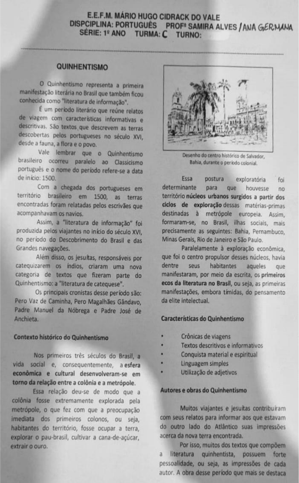 Você vai ler, a seguir, três fragmentos da Carta de Pero Vaz de Caminha, um cartum de Laerte e uma tira de Luís Fernando Verissimo. Após a leitura, responda às questões propostas. Fonte: CEREJA, William Roberto; MAGALHÃES, Thereza Cochar. Português: linguagens. Vol. Único. – São Paulo: Atual, 2003. p. 75-79. 07. Ainda sobre o texto IV: quem são os navegantes que estão tendo contato com os índios? Que elementos da imagem permitiram que você descobrisse isso? ____________________________________________________________________________ ____________________________________________________________________________ 08. Pero Vaz de Caminha, na Carta ao rei D. Manuel, comenta algumas curiosidades da terra recém- descoberta: como são fisicamente, como se vestem e se comportam os índios; como são o clima, os animais, as plantas, os rios etc. Quanto ao cartum de Laerte (texto IV), levante hipóteses: Que traço dos índios, nessa gravura, condiz com o dos brasileiros de hoje? ______________________________________________________________________________ 09. A tira de Luís Fernando Verissimo (texto V), entre outras coisas, evidencia, de forma engraçada, a desigualdade de condições culturais e tecnológicas entre índios e portugueses quando do descobrimento do Brasil. Explique essa desigualdade. ____________________________________________________________________________ ____________________________________________________________________________ 10. O culto à natureza, característica da Literatura Brasileira, tem sua origem nos textos da Literatura de Informação. Assinale o fragmento da carta de Caminha que melhor revela a mencionada característica. A) ‘’Viu um deles umas contas de rosário, brancas; acenou que lhas dessem, folgou muito com elas, e lançou-as ao pescoço.’’ B) ‘’Assim, quando o batel chegou à foz do rio, estavam ali dezoito ou vinte homens pardos, todos nus, sem nenhuma roupa que lhes cobrisse suas vergonhas.’’ C) ‘’Mas a terra em si é muito boa de ares, tão frios e temperados como os de Entre Douro e Minho, porque, neste tempo de agora, assim os achávamos como os de lá. Águas são muitas e infindas. De tal maneira é graciosa que, querendo aproveitá-la, dar-se-á nela tudo por bem das águas que tem.’’ D) ‘’Porém o melhor fruto, que dela se pode tirar, me parece que será salvar esta gente. E esta deve ser a principal semente que Vossa Alteza nela deve lançar.’’ E) ‘’Mostraram-lhes um papagaio pardo que o Capitão traz consigo; tomaram-no logo na mão e acenaram para a terra, como quem diz que os havia ali.’’ (SAEPE). Leia o texto abaixo e responda à questão 11. A carta de Pero Vaz de Caminha A Carta conhecida como “Carta de Pero Vaz de Caminha” é também conhecida como “Carta a el- Rei Dom Manoel sobre o achamento do Brasil”, é um documento no qual Pero Vaz de Caminha registrou suas primeiras impressões sobre a terra descoberta. [...] Vaz de Caminha era escrivão da frota de Pedro Álvares Cabral, e redigiu essa carta para Dom Manoel I para comunicar-lhe o descobrimento das novas terras. [...] A carta é o exemplo típico do deslumbramento dos Europeus para com o novo. No caso, o “Novo Mundo” como era chamado as Américas. Caminha documenta algumas características físicas da terra encontrada e o momento em que viram um monte, denominado logo depois por Pedro Álvares Cabral como “Monte Pascoal”. Logo após disso, ele narra o desembarque dos Portugueses na praia e o primeiro contato com os índios onde praticam o primeiro escambo (troca de mercadorias). Ele (Vaz de Caminha), narra também a primeira missa realizada na terra descoberta. Em 2005, este documento foi inscrito no Programa Memória do Mundo da Organização das Nações Unidas para a Educação, a Ciência e a Cultura (UNESCO). RODRIGUES, Pedro Augusto Rezende. Disponível em: <http://www.infoescola.com/historia/carta-de-pero-vaz-de- caminha/>. Acesso em: 8 abr. 2012. Fragmento. 11. O trecho que contém a informação principal do texto é: A) “... é um documento no qual Pero Vaz de Caminha registrou suas primeiras impressões sobre a terra descoberta.” B) “Vaz de Caminha era escrivão da frota de Pedro Álvares Cabral,...”. C) “... o momento em que viram um monte, denominado logo depois por Pedro Álvares Cabral como “‘Monte Pascoal’”. D) “Ele (Vaz de Caminha), narra também a primeira missa realizada na terra descoberta.”. E) “Em 2005, este documento foi inscrito no Programa Memória do Mundo...”. 12. Jean de Léry viveu na França na segunda metade do século XVI, época em que as chamadas guerras de religião opuseram católicos e protestantes. No texto abaixo, ele relata o cerco da cidade de Sancerre por tropas católicas. “[…] Desde que os canhões começaram a atirar sobre nós com maior frequência, tornou-se necessário que todos dormissem nas casernas. Eu logo providenciei para mim um leito feito de um lençol atado pelas suas duas pontas e assim fiquei suspenso no ar, à maneira dos selvagens americanos (entre os quais eu estive durante dez meses) o que foi imediatamente imitado por todos os nossos soldados, de tal maneira que a caserna logo ficou cheia deles. Aqueles que dormiram assim puderam confirmar o quanto esta maneira é apropriada tanto para evitar os vermes quanto para manter as roupas limpas […].” Neste texto, Jean de Léry A) despreza a cultura e rejeita o patrimônio dos indígenas americanos. B) revela-se constrangido por ter de recorrer a um invento de “selvagens”. C) reconhece a superioridade das sociedades indígenas americanas com relação aos europeus. D) valoriza o patrimônio cultural dos indígenas americanos, adaptando-o às suas necessidades. E) valoriza os costumes dos indígenas americanos porque eles também eram perseguidos pelos católicos. 13. Michel Eyquem de Montaigne (1533-1592) compara, no trecho, as guerras das sociedades Tupinambá com 