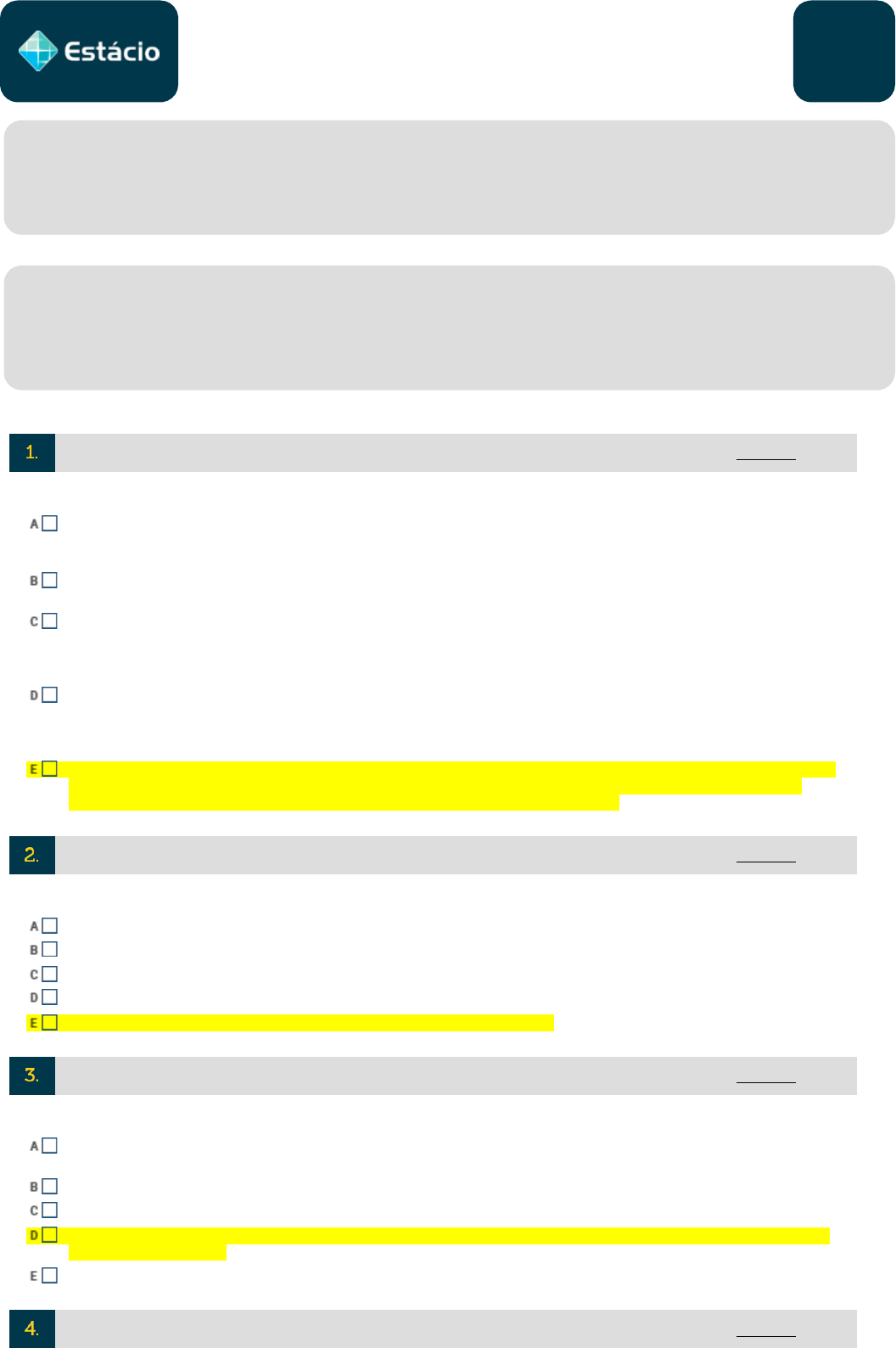 RENATA TABOAS GERVASIO 201708190503 Disciplina: CCJ0226 / DIREITO CIVIL - SUCESSÕES 03/06/2022 Período: 2022.1 / AV2 Turma: 3001 Leia com atenção as questões antes de responder. É proibido o uso de equipamentos eletrônicos portáteis e consulta a materiais de qualquer natureza durante a realização da prova. Questões objetivas e discursivas que envolvam operações algébricas devem possuir a memória de cálculo. Boa prova. de 1,00 1. de 1,00 2. de 1,00 3. de 1,00 4. 5414659966 27/05/2022 18:43 (Juiz Estadual - TJ/PI - CESPE/UNB - 2007) Quanto ao direito das sucessões, assinale a opção correta: Havendo herdeiros legítimos, o autor da herança poderá dispor por testamento da metade de seu patrimônio, a chamada parte disponível, pois a outra parte, a legítima, será necessariamente entregue a esses herdeiros, desde que não haja cláusula testamentária de deserdação. Considera-se aberta a sucessão no lugar do falecimento do autor da herança ou, quando este é desconhecido, no lugar onde se encontrar a maior parte dos bens a serem inventariados. Considere que o autor de uma herança seja casado pelo regime da separação de bens e não tenha deixado descendentes, deixando o cônjuge sobrevivente, e como ascendentes, os pais e a avó materna. Nessa hipótese, serão chamados a suceder os ascendentes, por direito próprio, e a herança será divida em três partes iguais. O pacto sucessório é expressamente vedado pelo ordenamento jurídico brasileiro, pois é nulo de pleno direito o contrato que tenha por objeto os bens do espólio. Ademais, a herança é direito indivisível, e os bens que a constituem são uma universalidade, por isso, os herdeiros não poderão validamente fazer qualquer convenção quanto aos bens da herança enquanto não for ultimado o inventário. O credor que se sentir prejudicado pela renúncia do herdeiro poderá, mediante autorização do juiz, aceitar a herança em nome do renunciante. Quitadas as dívidas do renunciante e se houver saldo, prevalece a renúncia quanto ao remanescente, que será devolvido aos demais herdeiros. O direito à sucessão aberta considera-se, para os efeitos legais: Móvel, independente se os bens da herança são móveis ou imóveis. Semovente se os bens da herança forem todos móveis. Imóvel, se todos os bens da herança forem imóveis. Móvel se os bens da herança forem todos móveis. Imóvel, independente se os bens da herança são móveis ou imóveis. O denominado droit de saisine ou princípio da saisine refere-se especificamente: à comoriência, quando duas ou mais pessoas falecem, na mesma ocasião, havendo impossibilidade de verificar-se qual deles precedeu aos outros. ao momento da verificação da capacidade do herdeiro. à sentença de partilha dos bens, no processo de inventário. ao momento da abertura da sucessão, uma vez que a transmissão da herança opera-se desde logo, a partir da morte do de cujus. aos casos de exclusão da sucessão (indignidade e deserdação). A de 1,00 5. de 1,00 6. de 1,00 7. de 1,00 8. (OAB/PR) Assinale a alternativa correta. I e IV, apenas. A sucessão abre-se no lugar da resiência ou domicilio do falecido, é opcional por atender a interesses dos herdeiros. A sucessão abre-se no domicílio do herdeiro inventariante. Esssa opção visa proteger os herdeiros. A sucessão abre-se no lugar da residencia do falecido. A sucessão abre-se no lugar do último domicilio do falecido. Sobre o Direito das Sucessões, é incorreto afirmar: A propriedade e a posse dos bens são transmitidas aos herdeiros no momento da abertura da sucessão. Pedro pode nomear como herdeira testamentária uma de suas filhas, não contemplando os demais (filhas) no testamento. os filhos do herdeiro renunciante herdam por representação, e não por direito próprio. é lícito a José ceder os direitos que possui na sucessão do seu pai, Joaquim, que já faleceu. As atuais regras normativas do Direito Sucessório, aplicam-se a todas às sucessões abertas a partir da entrada em vigor do atual Código Civil. No que diz respeito à Herança Jacente: I - o de cujus deixa bens e herdeiros através de testamento público II - o de cujus deixa bens para uma fundação através de testamento particular III - o falecido não deixa testamento e não se sabe da existênica de herdeiros apesar de ter deixado bens Estão incorretas as assertivas: apenas as assertivas II e III as assertivas I e II apenas a assertiva I as assertivas I e IV as assertivas I, II e III Configura-se o instituto da representação, em direito das sucessões, quando: A lei determinar que certos herdeiros, menores ou incapazes, sejam representados, nos atos da vida civil, por tutores, curadores ou por aqueles que detenham o poder familiar como decorrência de determinação judicial. Por testamento ou disposição de última vontade, o morto nomeia representantes para os herdeiros menores, confiando-lhes, enquanto durar a menoridade, a guarda e administração dos bens herdados. NDA. Por testamento ou disposição de última vontade, parentes do morto são chamados a suceder herdeiros não necessários. A lei chama certos parentes do morto a suceder em todos os direitos, em que ele sucederia se vivesse. ENADE 2009 Helena da Silva era uma mulher que não tivera oportunidade de concluir o ensino básico. Mas, em razão do destino, veio a conhecer John Look, divorciado há 20 anos, homem rico e bem-sucedido, que, em pouco tempo, se casou com Helena, na esperança de viver um grande amor com a consorte que conhecera no Rio de Janeiro. Logo após o casamento, o casal passeou por diversas capitais do país, entre as quais Recife, Maceió e Salvador. Infelizmente, John Look, em uma visita a seu país, dois meses depois, veio a falecer. No Brasil, o de cujus deixou um pequeno apartamento que deveria partilhar com a ex-mulher, do primeiro casamento. Entretanto, Helena de 1,00 9. de 1,00 10. Campus: CENTRO (RS) Prova Impressa em 27/05/2022 po