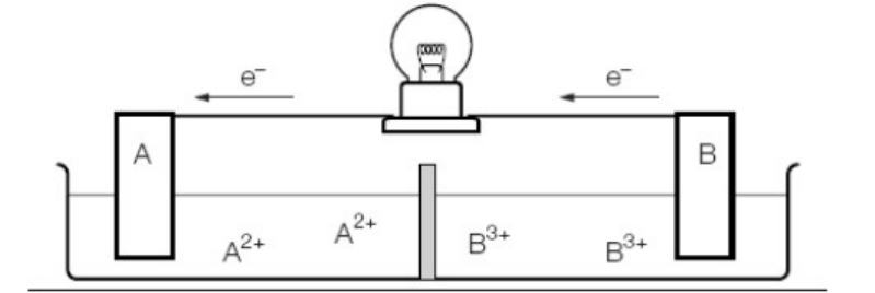 1. O eletrodo B está sofrendo uma oxidação ou uma redução? R: Como vemos no esquema, o eletrodo B está perdendo elétrons, então ele está sofrendo uma oxidação. Isso significa que seu potencial de oxidação é maior que o eletrodo A. 2. O eletrodo B é denominado cátodo ou ânodo? R: O elétron vai do ânodo (onde ocorre a oxidação) para o cátodo, então, no esquema vemos o elétron indo de B para A, significa que B é ânodo 3. O eletrodo B é o polo positivo ou o negativo? R: É o polo negativo, pois os anodos cedem elétrons 4. Escreva a semirreação que ocorre no eletrodo B. R: A semirreação é: 5. A concentração (quantidade) de íons B3+ aumenta ou diminui? R: Pela semirreação acima, observamos que a concentração aumenta o número de ions 6. Ocorre deposição sobre o eletrodo B ou sua corrosão? R: Ocorre uma corrosão. Podemos notar que está sendo consumida para a reação. 7. O eletrodo A está sofrendo uma oxidação ou uma redução? R: Como ele recebe elétrons, ele está sofrendo redução 8. O eletrodo A é denominado cátodo ou ânodo? R: Como está reduzindo, ele é chamado de catodo 9. O eletrodo A é o polo positivo ou o negativo? R: O polo positivo é onde o catodo se encontra, então ele é o polo positivo 10. Escreva a semirreação que ocorre no eletrodo A. R: 11. A concentração (quantidade) de íons A2+ aumenta ou diminui? R: Percebemos que a quantidade de A2+ na semirreação acima diminui, pois é necessário para a formação do elemento A0 12. Ocorre deposição sobre o eletrodo A ou sua corrosão? R: Ocorre deposição, quanto mais se forma , mais é acumulado na barra 13. Escreva a equação que representa a reação global da pilha R: (2x) (3x) 14. Escreva a notação oficial que representa a pilha R: 15. A pilha é um processo espontâneo ou não-espontâneo? R: O processo é espontâneo, pois ocorre a reação da oxidação para a redução. 16. Considere a pilha esquematizada na figura a seguir, montada com barras metálicas de mesmas dimensões O interruptor I foi fechado e, após algum tempo de funcionamento do circuito, observou-se a diminuição da massa da lâmina de zinco e o aumento da massa da lâmina de cobre. a. Explique, através de reações químicas, por que ocorrem variações das massas das duas lâminas R: As variações ocorrem devido a diferença de potencial de redução dos elementos. O cobre apresenta um potencial de redução menor que o zinco, causando essa variação Temos que as reações são, segundo a tabela de potencias de redução A reação global fica: b. Qual é o sentido do fluxo de elétrons pelo circuito externo que liga as lâminas de zinco e cobre? Justifique. R: Temos que o sentido depende do potencial de redução dos elementos, e como o potencial de redução de cobre é menor que o zinco, o fluxo irá ir do zinco para o cobre. 17. Numa prova prática foi solicitado a um aluno que escolhesse, dentre três frascos metálicos de Al, Fe e Cu, qual(is) dele(s) poderia(m) ser usado(s) para guardar uma solução aquosa de ácido clorídrico. Diga qual seria a escolha mais acertada. Justifique sua resposta. Dados: R: Devem ser escolhidos os frascos nos quais os íons não sofram redução, e assim, não produzam . Deve ser pensado que, para que não haja redução, o metal deve ter um potencial de redução maior que a do hidrogênio. Analisando a tabela, vemos que o único frasco com potencial maior é o frasco do cobre. 18. A pilha alcalina é constituída de uma barra de manganês metálico eletroliticamente puro, imerso numa pasta de hidróxido de zinco. Dela são conhecidos os respectivos potenciais-padrão de redução: a. Qual a ddp da pilha? R: A ddp é calculada por: b. Qual a equação global que nela ocorre? R: Semirreação de redução: Semirreação de oxidação Reação global 19. Na pilha de Daniel, barras de cobre e zinco se encontram mergulhadas em soluções aquosas de sulfato de cobre (II) e sulfato de zinco, respectivamente. As duas soluções estão separadas por uma parede porosa. Sabendo que os potenciais-padrão de redução são: a. Escreva a reação espontânea que ocorre na pilha de Daniell: R: b. calcule a diferença de potencial da pilha; R: c. desenhe a pilha de Daniell indicando, através de setas, como os elétrons fluem através de um circuito externo que conecta os eletrodos. R: 20. Na montagem abaixo, dependendo do metal (junto com seus íons) tem-se as seguintes pilhas, cujo cátodo (onde ocorre redução) é o cobre: Nas condições-padrão e montagem análoga, a associação que representa uma pilha em que os eletrodos estão indicados corretamente é: R: Quanto mais alto o valor da diferença de potencial, maior será a voltagem. Precisamos escolher um metal pra ser o cátodo, que tenha um potencial de reação mais alto de todas as opções, e o metal para o anodo, tem que ter um potencial o mais baixo possível, assim teremos uma diferença de potencial alta entre eles. Analisando o valor tabelado, vemos que o chumbo tem um potencial de redução que seja alto suficiente para gerar uma boa diferença de potencial, e vemos que o alumínio dentre os listados tem o menor potencial de oxidação. Com isso, devemos escolher a alternativa E – Chumbo e Alumínio 21. Observe o esquema abaixo, representativo da eletrólise da água. As semi-reações que ocorrem nos eletrodos são: A partir dessas informações: a. Identifique os gases A e B. R: No tubo I formou-se e no tubo II formou-se b. Indique se, após um certo tempo de eletrólise, o meio estará ácido, básico ou neutro. Por quê? R: Neutro, pois irá equilibrar os mols entre os elementos 22. Equacione as reações que ocorrem na eletrólise ígnea das substâncias: a. Kl R: Semirreação de redução Semirreação de oxidação: Reação global: b. R: Semirreação de redução Semirreação de oxidação: Reação global: 23. Na eletrólise de nitrato de ferro II, em solução aquosa, ocorre: R: N