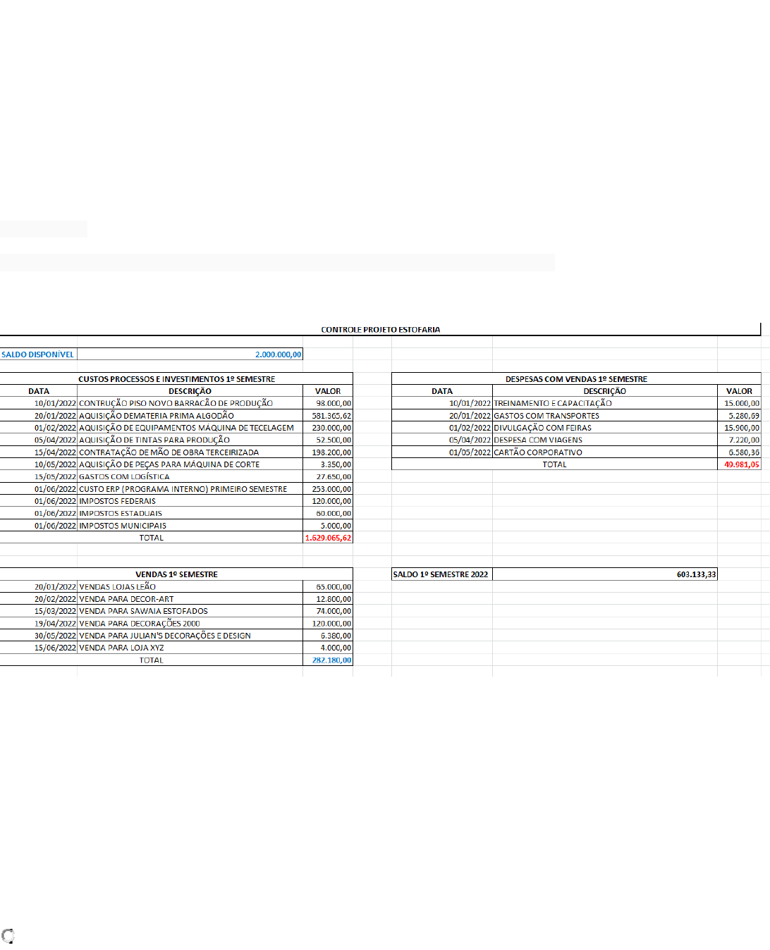 Origem e Papel da Controladoria Desafio A necessidade de manter a empresa sempre competitiva exige uma equação que une produtividade e eficiência à alta lucratividade a custos menores. O controle desse processo, que há tempos atrás era uma função apenas de suporte, passa a ter importância estratégica, surgindo assim a controladoria. De que informações iniciais sobre o projeto você precisa para fazer um bom trabalho na controladoria? Faça uma planilha ou uma tabela com essas informações no formato jpg ou xls Sua resposta Efetuado planilha em anexo, dividida entre Custos, Despesas e Receitas de vendas. Exercícios Respostas enviadas em: 29/11/2022 15:35 1. A controladoria tem o dever de fornecer informações verdadeiras e atualizadas, sendo, em geral, dados armazenados de anos anteriores junto às áreas da organização e pautados nos conhecimentos de economia, contabilidade, custos, sistemas de informação, finanças, meio ambiente, entre outras. Qual a importância da informação verdadeira e atualizada? Resposta incorreta. A. A controladoria é o sistema de armazenamento de todas as informações gerenciais. A controladoria apenas utiliza essas informações, que são cedidas e inseridas pelos sistema de informação. Resposta incorreta. B. Quem insere e publica essas informações é a alta direção, portanto as informações devem ser verdadeiras e atualizadas. Não é a alta direção que insere as informações. Você acertou! C. Uma informação equivocada pode trazer transtornos, retrabalho e gerar custos para a organização. Informações corretas e atualizadas não geram transtornos. Resposta incorreta. D. A controladoria funciona como uma auditoria interna, buscando evidências e processos. A controladoria não é uma auditoria. Resposta incorreta. E. O objetivo da controladoria é auxiliar o financeiro a reduzir os custos e facilitar a contabilidade nos lançamentos. O objetivo da controladoria é analisar indicadores e acompanhar os resultados, como lucro e sustentabilidade. 2. A controladoria é responsável pela coordenação da gestão econômica da empresa com base na ciência contábil e do sistema de informação de controladoria. Podemos afirmar que: Resposta incorreta. A. Para a coordenação da gestão econômica, a controladoria depende somente de fatores externos, como legislação e impostos. A controladoria depende apenas de informações internas da organização. Resposta incorreta. B. O sistema de informação deve ser totalmente eletrônico e de fácil acesso. As informações nem sempre são eletrônicas e de fácil acesso. Resposta incorreta. C. A controladoria tem como objetivo usar as informações atuais para uma visão de futuro apenas. O objetivo é o presente e futuro. Você acertou! D. A controladoria utiliza as técnicas gerenciais e o sistema de informações contábeis. Seu funcionamento é o de um órgão administrativo que tem missão e funções baseadas em princípios definidos no modelo de gestão do sistema da empresa. A alternativa demonstra de forma correta o funcionamento da controladoria. Resposta incorreta. E. Toda informação deve ser gerenciada pela controladoria, independentemente de tipo, origem e destino. A controladoria não gerencia nenhuma informação, apenas a utiliza como dados e indicadores para análise. 3. Para obter uma informação real, é preciso ter uma visão sistêmica da empresa. É preciso interagir com todas as áreas e conhecer as atividades e os resultados desejados. Isso significa que: Resposta incorreta. A. visão sistêmica é olhar para o futuro. Visão sistêmica é a visão de um todo. Você acertou! B. visão sistêmica significa entender os processos da organização; é saber onde começa e onde termina cada processo. Está correta a associação da visão sistêmica como sendo o entendimento dos processos da organização. Resposta incorreta. C. para interagir com as outras áreas, é necessário que se tenham treinamentos e dinâmicas em que as pessoas possam se encontrar. Interagir não exige, necessariamente, contato humano. Resposta incorreta. D. conhecer os resultados é entender sobre os lucros, capitais e investimentos da organização. Resultados são os objetivos traçados. Resposta incorreta. E. quem tem a visão sistêmica é apenas a diretoria e os sócios da organização. Qualquer pessoa pode ter uma visão sistêmica, desde que seja interessante para a organização. 4. Uma empresa que possui controladoria obtém algumas informações importantes e estratégicas: Você acertou! A. • Origens de cada recurso • Destino de cada saída • Se as receitas e despesas estão dentro dos valores e limites esperados • Identificar, de pronto, desvios nesses parâmetros • Se os SICs (Sistemas Internos de Comunicação) suprem as necessidades para tomadas de decisão. Essas informações competem à controladoria. Resposta incorreta. B. Missão, visão e valores. Missão, visão e valores não são elementos que competem à controladoria. Resposta incorreta. C. Estudo de mercado e pesquisa de novos produtos. Essas atividades são do departamento de marketing. Resposta incorreta. D. Informações de novas tecnologias voltadas à segurança de informações. Essas informações são de interesse da gestão de informação. Resposta incorreta. E. Rotatividade e absenteísmo de funcionários. Essas informações pertencem ao departamento de recursos humanos. 5. A importância da controladoria na atualidade se dá pelo seu papel, fundamental para que a empresa sobreviva e tenha margem de lucro, garantindo, assim, sua sustentabilidade. A partir dessa informação, podemos entender que: Resposta incorreta. A. O mercado está estável e com poucos concorrentes. Na atualidade, o mercado não é estável e depende da atividade da organização para saber o número de concorrentes. Resposta incorreta. B. O mercado está desequilibrado mundialmente em relação à economia. Nem tod