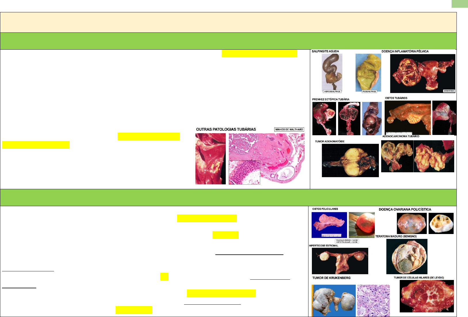 1 MORFO 8 MÓD 3 – TRG 2022/2 PATOLOGIAS: TUBA UTERINA E OVÁRIO PATOLOGIAS TUBAS UTERINAS - PRINCIPAIS ENTIDADES: Salpingites; Prenhez ectópica tubária; Cistos (paratubários, hidátides Morgagni/fímbrias); neoplasias; endometriose - DIP: gonorreia, clamídia ou infecções puerperais ou por abortos. Complica com obstrução tuba, peritonite, sepse, hidrossalpinge - SALPINGITES CRÔNICAS: (1) crônica inespecífica (plasmócitos); (2) granulomatosa; (3) xantogranulomatosa (macrófagos espumosos); (4) pseudoxantomatosa (macrófagos com lipofuscina ou hemossiderina) - PRENHEZ ECTÓPICA: FR: lesão tubular, anatomia, motilidade ciliar (tabagismo e contracepção hormonal), DIU - CISTOS TUBÁRIOS: incidentais, assintomáticos. Associados à infertilidade, torção ou efeito massa - NEOPLASIAS TUBÁRIAS: Tumor adenomatoide (mesotelial); Adenocarcinoma tubário (associado à neoplasia serosa ovário); Metástases. Lesões que simulam neoplasias Endometriose tubária e Ninhos Walthard (lesões amarelas; aspecto de grão de café; IH positiva para uroplaquina/marcador epitélio transição TU) PATOLOGIAS OVÁRIOS - CISTOS OVARIANOS: (1) simples de inclusão (invaginação do epitélio de superfície); (2) foliculares (folículos Graff não ovulados); (3) lúteos (corpo lúteo cístico hemorrágico); (4) SOP/dça de Stein-Leventhal; (5) outros (Cisto teca- luteínico; Endometriose ovariana) - HIPERTECOSE ESTROMAL: luteinização focal céls estromais ovarianas, causando virilização. Mais na menopausa. Há ↑ ovário bilateralmente, com massa homogênea, amarelo-acastanhada - NEOPLASIAS OVARIANAS: 80% são benignos e em mulheres jovens (20-45 anos). Tipos epiteliais/celômicos: (1) tubário: serosas; (2) Endocervical: mucinosas; (3) Endometrial: endometrióides e céls claras; (4) transicional: Brenner. Neoplasias estroma (10%): (1) Sexual: Céls sustentação (fibroma); Céls teca (tecoma ); Céls granulosa ; Céls hilares (Leydig puros ); Incerto (androblastomas/ Sertoli-Leydig cça); (2) Não-sexual: mesenquima. Neoplasias céls germinativas: (1) Disgerminoma: céls claras + linfócitos; (2) Carcinoma embrionário: céls primitivas, volumosas; (3) Tumor seio endodérmico: hemorragia, necrose e endoderma primitivo (corpúsculos Schiller-Duval); (4) Coriocarcinoma: hemorragia, necrose, bifásica; (5) Teratoma: variável. Metástases ovarianas: principais sítios mama e TGI. Temos tumor de Krukenberg (“anel de sinete”) e Pseudomyxoma peritonei (mucina intraperitoneal).