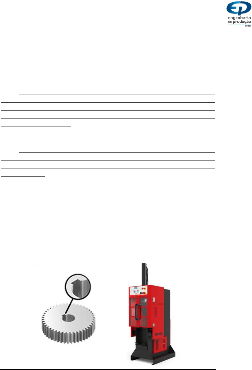 UNIVERSIDADE FEDERAL DE PELOTAS - UFPEL CENTRO DAS ENGENHARIAS - CENG ENGENHARIA DE PRODUÇÃO ERGONOMIA II – M1 ORIENTADOR: LUIS ANTONIO DOS SANTOS FRANZ ALUNO: CARLOS GIOVANE SOARES EINHARDT 1. Cada aluno e aluna deve escolher uma ferramenta passível de uso na indústria e na qual existe a relação Humano X Máquina. Oriento a postarem o equipamento escolhido no fórum o quanto antes, pois no caso de equipamentos iguais entre dois alunos, somente a postagem mais antiga será válida. Os itens 2, 3 e 4, podem ser feitos posteriormente e com calma; Equipamento: Brochadeira Vertical BM25 2. A seguir, deve-se fazer um relato detalhado do uso, do funcionamento e da função da máquina/ferramenta escolhida, bem como a postagem de uma imagem para que o Professor possa identificar se aluno relatou adequadamente a relação HxM para a máquina sugerida; A brochadeira ou brochadora é uma máquina de usinagem empregada nas operações de brochamento, que consiste em remover material da superfície de uma peça, de forma progressiva, pela ação ordenada dos fios de corte, dispostos em série, de ferramentas multicortantes. Essas ferramentas, que se deslocam segundo uma trajetória retilínea, chamam-se brochas. Mais informações sobre brochamento disponíveis em: https://essel.com.br/cursos/material/01/ProcessosFabricacao/67proc.pdf Figura 1 – Peça usinada e Brochadora vertical BM25 Fonte: Narguesa.com https://essel.com.br/cursos/material/01/ProcessosFabricacao/67proc.pdf 3. Na sequência, relatar aspectos relacionados à máquina, tomando por base o conteúdo presente no Mapa Mental e nos slides do item 7 (Sistema Homem Máquina), no e-Aula. Observar especialmente o ramo do mapa mental Sistema Homem x Máquina>>Considerações gerais>>Aspectos relevantes; A relação entre o homem com a máquina, no caso, se dá pela interação frequente do operador com o equipamento a cada peça usinada, pois a peça é fixada no aparelho, a brocha é alocada e, após a porta de segurança ser devidamente selada, a brocha passa realizando a usinagem. Cabe ao operador o poder de decisão sobre o número de passadas, velocidade de corte, etc. opções que podem ser personalizadas a cada operação. 4. Por fim, analisar os controles e mostradores da máquina escolhida tomando por base o que também consta item 7 (Sistema Homem Máquina), e presente no ramo Sistema Homem x Máquina>>Interfaces>>Pontos relevantes relação controles X mostradores. A máquina possui uma interface simples e prática, com todas as opções no painel de controle, em uma altura média, possivelmente na altura dos olhos do operário. Ela possui um mostrador, botões para os comandos e até mesmo uma chave que, caso esteja ligada, permite a usinagem com a porta da brochadeira aberta (Operação que pode gerar um risco ao operador não bem capacitado). Ao utilizar esta opção também é acionada uma luz vermelha no painel, que visa alertar o operador sobre a configuração no momento. Mais informações sobre o uso da brochadeira disponíveis em: https://nargesa.com/pt/maquinas-industriais/brochadeira-vertical-bm25 Pelotas/RS, 14 de outubro de 2022. https://e-aula.ufpel.edu.br/pluginfile.php/1305852/course/section/178974/ergo_2_-_07_-_sistemas_homem_maquina.pdf https://e-aula.ufpel.edu.br/pluginfile.php/1305852/course/section/178974/ergo_2_-_07_-_sistemas_homem_maquina.pdf https://nargesa.com/pt/maquinas-industriais/brochadeira-vertical-bm25