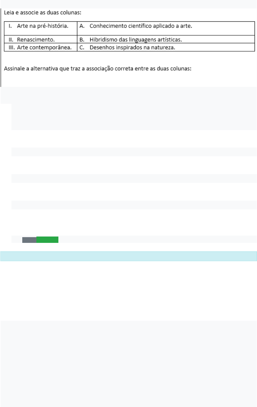 1) Alternativas: · I-B; II-A; III-C. · I-A; II-B; III-C. · I-C; II-B; III-A. · I-B; II-C; III-A. · I-C; II-A; III-B. · checkCORRETO Resolução comentada: Na pré-história, as pinturas rupestres eram inspiradas na observação da natureza e especialmente nos animais. Já no Renascimento, a arte passou a ser investigada assim como a ciência e, em alguns momentos, os conhecimentos científicos eram aplicados à arte. Na contemporaneidade, as linguagens da arte se misturam e perdem seus contornos rígidos. Código da questão: 51133 2) Sobre o uso da tecnologia nas criações artísticas, podemos afirmar que: I. A fotografia impressa pode ser utilizada, assim como as fotografias digitais. II. A tecnologia pode ser utilizada na arte apenas como ferramenta para construção de um trabalho artístico, ou seja, no caso da fotografia, apenas a impressão da imagem pode ser considerada arte. III. o computador é essencial para criação de arte usando a tecnologia, pois, por meio dele, as imagens podem ser editadas, animadas e até mesmo projetadas. IV. A tecnologia só pode ser utilizada por artistas profissionais, no contexto escolar não é aconselhável que tais técnicas sejam praticadas. São verdadeiras: Alternativas: · Apenas II e III. · Apenas I e IV. · Apenas I; II e IV. · Apenas I; III e IV. · Apenas I e III. checkCORRETO Resolução comentada: As afirmações I e II estão corretas, porém, as afirmações II e IV não. A tecnologia pode ser utilizada como ferramenta e também como suporte na arte, pois algumas obras são expostas por meio de dispositivos eletrônicos. As tecnologias digitais devem ser utilizadas na sala de aula, desde que sejam bem contextualizadas, assim como as demais técnicas. Código da questão: 51157 3) Alternativas: · I-B; II –A; III-C. checkCORRETO · I-C; II-B; III-A. · I-C; II-A; III-B. · I-A; II-B; III-C. · I-B; II-C; III-A. Resolução comentada: A espacialidade se refere as dimensões das formas, os gêneros pictóricos são os temas representados e a comunicação tem poder casual ou intencional. Código da questão: 51147 4) Alternativas: · I-B; II-D; III-C; IV-A. · I-A; II-B; III-C; IV-D. · I-D; II-C; III-B; IV-A. · I-C; II-A; III-B; IV-D. · I-C; II-D; III-A; IV-B. checkCORRETO Resolução comentada: Desenho de observação precisa do objeto presente. O desenho de memória precisa da observação prévia do objeto. O desenho de criação é criado na mente do artista antes de ser desenhado. O desenho de projeto é um esboço do que será construído. Código da questão: 51156 5) Dentre os tipos de tintas estudadas, quais são as mais recomendadas para utilização em escola? Alternativas: · Tintas óleo e guache, pois permitem a sobreposição de cores. · Tintas óleo e aquarela, pois permitem o efeito de transparência. · Tintas óleo e acrílica, pois permitem efeitos semelhantes. · Tintas aquarela, guache e acrílica, pois são solúveis em água. checkCORRETO · Tintas guache e acrílica, pois são opacas. Resolução comentada: As tintas mais recomendadas para utilização em escola são as solúveis em água, como guache, aquarela e acrílica. São atóxicas e não possuem cheiro forte, além de serem mais baratas. Código da questão: 51150 6) As releituras são um recurso importante para exploração da poética pessoal dos alunos, mas é preciso ficar atento para que a atividade não se resuma a cópia de uma obra de arte. Leia as afirmações abaixo e verifique se são verdadeiras ou falsas: ( ) Estudar a biografia dos artistas é o melhor recurso para criar uma boa releitura. ( ) As releituras devem, obrigatoriamente, utilizar a mesma técnica escolhida pelo artista na obra de referência. ( ) Um releitura é uma nova criação que deve ter um elo com a obra utilizada como referência. ( ) As releituras foram muito exploradas por artistas consagrados no decorrer da história. ( ) Imitar fielmente uma obra de referência é criar uma releitura. Assinale a alternativa que contenha a sequência correta: Alternativas: · F – V – F – V – V. · F – F – V – V – F. checkCORRETO · V – V – F – V – F. · F – V – F – V – F. · V – V – V – V – F. Resolução comentada: Fazer uma releitura é criar um novo trabalho artístico a partir de uma referência, mantendo sempre um elo entre a nova criação e a obra lida. As técnicas e formas não precisam ser as mesmas, mas é preciso conhecer e investigar a poética pessoal do artista de referência para possuir subsídios que embasem a nova criação. Código da questão: 51163 7) As tintas guache e a aquarela são muito semelhantes em sua composição, pois possuem como aglutinante, a goma laca e como diluente, a água. Entretanto, os efeitos das pinturas são bem diferentes. Por que isso acontece? Assinale a alternativa correta: Alternativas: · Porque são vendidas em formatos diferentes. · Porque uma é feita para uso escolar e a outra não. · A diferença está na forma de manipulação do pintor. · Porque a tinta guache é opaca e a aquarela translúcida. checkCORRETO · Porque a tinta aquarela só existe no formato de pastilhas. Resolução comentada: A diferença entre as duas se deve a opacidade da tinta guache, que possui o pigmento branco em sua composição. Os outros elementos que as compõem são iguais. Código da questão: 51149 8) Segundo Bueno (2012), antes de qualquer trabalho artístico, o desenho é sempre utilizado, ele transforma o visual e torna compreensível algo que, muitas vezes, não conseguimos entender por meio de palavras. Você, provavelmente, já ouviu aquela velha frase: não entendeu? Quer que eu desenhe? É uma maneira irônica, mas não irreal. É uma forma perfeita de fazer com que alguém entenda o que queremos transmitir. Até mesmo numa partida de futebol, isso acontece. Esquemas são feitos preparando jogadas num quadro ou papel, antes dos jogadores entrarem em campo. A partir dos seus estudos
