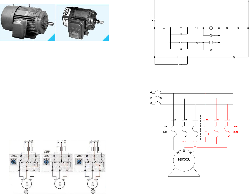 1 Resumen—El bloqueo eléctrico es útil cuando se desea hacer girar el motor en un sentido u otro. Esto es para no provocar un cortocircuito o dañar el propio motor. Motor, bloqueo eléctrico, sentido, bobina, relevadores. I. INTRODUCCIÓN. N bloqueo eléctrico se basa en cambiar el sentido de giro de un motor trifásico , para esto es necesario de realizar conexiones especificas en la sucesión de las fases y tensione aplicadas. Otro motivo más para evitar que se invierta al mismo tiempo de que se requiera activar el motor en el mismo sentido de siempre del motor es evitar sobrecalentamientos, cortocircuitos y daños críticos en el motor. Fig. 1. Motor trifásico para uso general y uso severo. II. TEORÍA. Un enclavamiento eléctrico es aquel que una vez presionado el botón de arranque mantiene el circuito energizado, por lo tanto, el motor o cualquier elemento conectado en cuestión estará energizado hasta que se rompa el enclavamiento. A. Inversión de Giro. A un motor trifásico para cambiarle el sentido del giro hay que invertir dos de sus fases de entrada. Esa inversión, si es fija (que funcione siempre para un lado), se realiza en la placa de bornas, pero si queremos que funcione para un lado o para otro, esa conexión se realiza mediante contactores que modifican la entrada de corriente en el esquema de fuerza. Fig. 2. Circuito de fuerza para invertir giro. B. Bloqueo eléctrico. Esto es para proteger los equipos, no permiten ser activados o desactivados de ninguna parte para no ocasionar inconvenientes. Se utiliza in contacto Normalmente Cerrado de un relevador con la bobina del mismo relevador. III. DESARROLLO. Para realizar la práctica es necesario los siguientes materiales; • 30 cables banana. • 3 botones pulsadores y 2 arrancadores. • Motor trifásico. • 3 lámparas piloto. Fig. 3. Circuito de Control de Bloqueo Eléctrica, dos botones de arranque, uno para dar sentido en manecillas del reloj y otro levógiro. Fig. 4. Circuito de fuerza, motor trifásico 220 V. ARRANQUE PARO 2 N 1 1 ITM-C L 1 127 VCA C-RSA Text 3 3 C-A C-A 2 1 4 5 Text "Sobrecarga" C-RSB 6 2 6 N 1N 1 N 1 C-B ARRANQUE_2 2 Text6 C-B C-B 2 N 2 C-A C-RSA C-RSB N 2 N 2 4 4 6 1 7 7 "Reversa" "Adelante" 7 5 3 Laboratorio de Sistemas de Control Secuencial. Práctica 4. Bloqueo eléctrico. Díaz López Mario Alan. Universidad de Guadalajara. Centro Universitario de Ciencias Exactas e Ingenierías. U 2 IV. CUESTIONARIO. 1. ¿Por qué los reguladores de inversión llevan a la vez enclavamiento mecánico y eléctrico? Para evitar que se activen la inversión en un sentido y al mismo tiempo la otra. Uno sirve para que no se active físicamente y otro desconectando un contacto. 2. Modifíquese la figura 4-1 de forma que el motor pueda avanzar de modo intermitente (por pulsos o jogeo) hacia delante lo mismo que hacia atrás, sin dejar de tener sus botones de arranque de adelante y atrás. Fig. 5. Circuito de control con señal intermitente y giro. Fig. 5. Circuito de fuerza, motor trifásico 220 V. A. Descripción de Circuito. Al momento de presionar el botón de arranque, energiza el contacto R1, anclando el circuito y la bobina R1 . Otro contacto de la segunda rama R1se activa dando energía al temporizador On-delay T1 contando 3 segundos para activar el contacto T1 normalmente abierto que este contacto activa el temporizador Off-delay T2 que cuenta 3 segundos para desconectar el temporizar T1. Mientras se energiza el temporizador T1 la rama con la bobina C-A se energiza y al contacto C-A para iniciar el motor en sentido horario, un foco indicador verde nos da indicación del giro. Si se quiere invertir el giro se presiona el botón de arranque 2 pasa por el contacto R2 y energiza la bobina C-B, el foco de indicación del giro antihorario y el contacto C-B. V. CONCLUSIONES. La inversión de giro y el bloqueo de un circuito es importante para en una aplicación real si el motor se requiere que gire antihorario pueda realizarse sin dañarlo. El bloqueo mecánico es útil parar restringir la manipulación de elementos que puedan provocar grandes fallas en el circuito, es notorio ver que tanto eléctrico y mecánicamente es importante colocar para la seguridad del operario. ARRANQUE PARO 2 N 1 1 ITM-C Text 3 3 R1 2 4 5 Text "Adelante" T2 T1 6 2 3 N 2 N 3 N 1 ARRANQUE_2 3 R2 R2 R2 R1 "Atrás" R1 R2 R2 R1 T1 T2 C-B C-A OL C-A C-B 7 9 8 N 4 N 4 N 4 2 2 1 1 3 4 5 3 4 4 3
