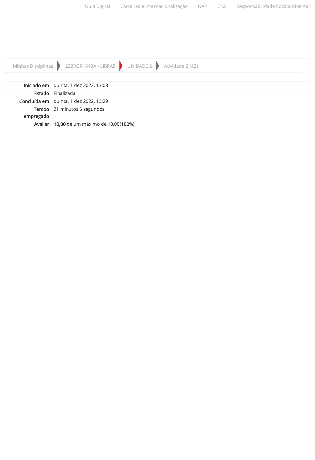 Minhas Disciplinas 222RGR1843A - LIBRAS UNIDADE 2 Atividade 2 (A2) Iniciado em quinta, 1 dez 2022, 13:08 Estado Finalizada Concluída em quinta, 1 dez 2022, 13:29 Tempo empregado 21 minutos 5 segundos Avaliar 10,00 de um máximo de 10,00(100%) Guia Digital Carreiras e Internacionalização NAP CPA Responsabilidade Socioambiental https://ambienteacademico.com.br/my/ https://ambienteacademico.com.br/course/view.php?id=17731 https://ambienteacademico.com.br/course/view.php?id=17731§ion=4 https://ambienteacademico.com.br/mod/quiz/view.php?id=486623 https://codely-fmu-content.s3.amazonaws.com/Moodle/GuiaDigital/Guia+digital/index.html https://informa.fmu.br/carreiras/ https://codely-fmu-content.s3.amazonaws.com/Moodle/NAP/inicial/nap/fmu/index.html https://codely-fmu-content.s3.amazonaws.com/Moodle/CPA/landing_CPA/index.html https://portal.fmu.br/sustentabilidade Questão 1 Correto Atingiu 1,00 de 1,00 Na Libras, estima-se que tenham 64 configurações de mãos diferentes. Com elas, é possível realizar vários sinais fazendo uma combinação de configuração de mãos, movimentos, expressões corporais e faciais etc. Dentre elas, temos as configurações de mãos que representam o alfabeto em Libras. Veja o quadro a seguir: Figura - Alfabeto manual Fonte: ALFABETO…(2020, on-line). ALFABETO manual. Libras.com, 2020. Disponível em: https://www.libras.com.br/alfabeto-manual. Acesso em: 15 dez. 2020. #PraCegoVer: a imagem apresenta um quadro de fundo branco, com o título “Alfabeto Manual”, em português, na cor preta. Em seguida, há uma sequência com vinte sete quadros com desenhos de configurações de mãos, com a respectiva letra em português. A sequência está representada da seguinte forma: Letra A com o desenho de uma mão fechada, com o polegar encostado na lateral da mão. A letra B com a mão aberta, dedos encostados uns nos outros e o polegar dobrado para a palma da mão. A letra C com a mão aberta, com os dedos encostados, com exceção do polegar, e encurvados para a frente. A letra Ç é o mesmo formato da letra C, porém com movimento trêmulo da mão. A letra D e feita com a mão fechada em formato de círculo e com o dedo indicador levantado. A letra E é feita com a mão aberta e com os dedos dobrados em direção a palma da mão. A letra F é feita com a mão aberta, com os dedos para cima e abertos, o dedo indicador esticado para frente e o polegar encostado na lateral do dedo indicador. A letra G é feita com a mão fechada, com o dedo indicador para cima e o polegar encostado na lateral do dedo indicador. A letra H é feita com a mão fechada, com os dedos médio e indicador levantados, abertos e com o polegar encostado entre eles, com um movimento de punho de fora para dentro. Letra I é feita com a mão fechada com o dedo mindinho para cima. Letra J é o mesmo formato da letra I, no entanto essa letra faz um movimento horário. A letra K é uma mão fechada, com os dedos médio e indicador esticados e o polegar entre eles, porém direcionados para baixo. Faz-se um movimento de baixo para cima. A letra L é mão fechada com o indicador esticado para cima e o polegar esticado para o lado. A letra M é a mão fechada com os dedos indicador, médio e anelar juntos e esticados para baixo. A letra N é a mão fechada com os dedos indicador e médio juntos e esticados para baixo. A letra O é a mão fechada em formato de círculo. A letra P é a mão fechada com o dedo indicador esticado para a frente, o dedo médio esticado para baixo, e o polegar entre esses dois dedos. A Letra Q é a mão fechada e o dedo indicador esticado para baixo com o polegar encostado na lateral do dedo indicador. A letra R é uma mão fechada com os dedos indicador e médio levantados para cima e entrelaçados. A letra S é a mão fechada, com o polegar na frente dos dedos. A letra T é a mão aberta, com os dedos afastados, o indicador esticado para a frente e o polegar por debaixo do dedo indicador. A letra U é a mão fechada com os dedos indicador e médio esticados para cima e unidos. A letra V é mão fechada com os dedos indicador e médio esticados para cima e afastados. A letra W é a mão fechada, com os dedos indicador, médio, anelar esticados para cima e afastados. A letra X é a mão fechada, com o dedo indicador curvado. Essa configuração faz um movimento de gancho, de puxar algo para si. A letra Y é a mão fechada com os dedos mindinho e polegar esticados para os lados. A letras Z é a mão fechada com o dedo indicador esticado, fazendo um desenho no ar que segue para o lado, desce e vai para o lado novamente. A partir da observação do quadro acima, marque a alternativa correta: a. O alfabeto manual em Libras é constituído por con�gurações de mãos que representam as letras do alfabeto da língua portuguesa. b. O alfabeto manual não é imprescindível, pois, uma vez que se aprende os sinais em Libras, é possível conversar sobre qualquer assunto. c. É muito importante aprender o alfabeto manual, pois ele é padrão em todas as línguas de sinais. Uma vez que se aprende, é possível conversar com surdos de todo o mundo. d. O alfabeto manual é utilizado exclusivamente para se soletrar o nome das pessoas, não havendo necessidade de usá-lo em outro contexto. Guia Digital Carreiras e Internacionalização NAP CPA Responsabilidade Socioambiental https://www.libras.com.br/alfabeto-manual https://codely-fmu-content.s3.amazonaws.com/Moodle/GuiaDigital/Guia+digital/index.html https://informa.fmu.br/carreiras/ https://codely-fmu-content.s3.amazonaws.com/Moodle/NAP/inicial/nap/fmu/index.html https://codely-fmu-content.s3.amazonaws.com/Moodle/CPA/landing_CPA/index.html https://portal.fmu.br/sustentabilidade Questão 2 Correto Atingiu 1,00 de 1,00 e. Para se comunicar em Libras, é necessário apenas que se aprenda o alfabeto manual, pois, com ele, é possível estabelecer um diálogo com as pessoas surdas. Leia o excerto a seguir: Quando se trata da elaboração dos 