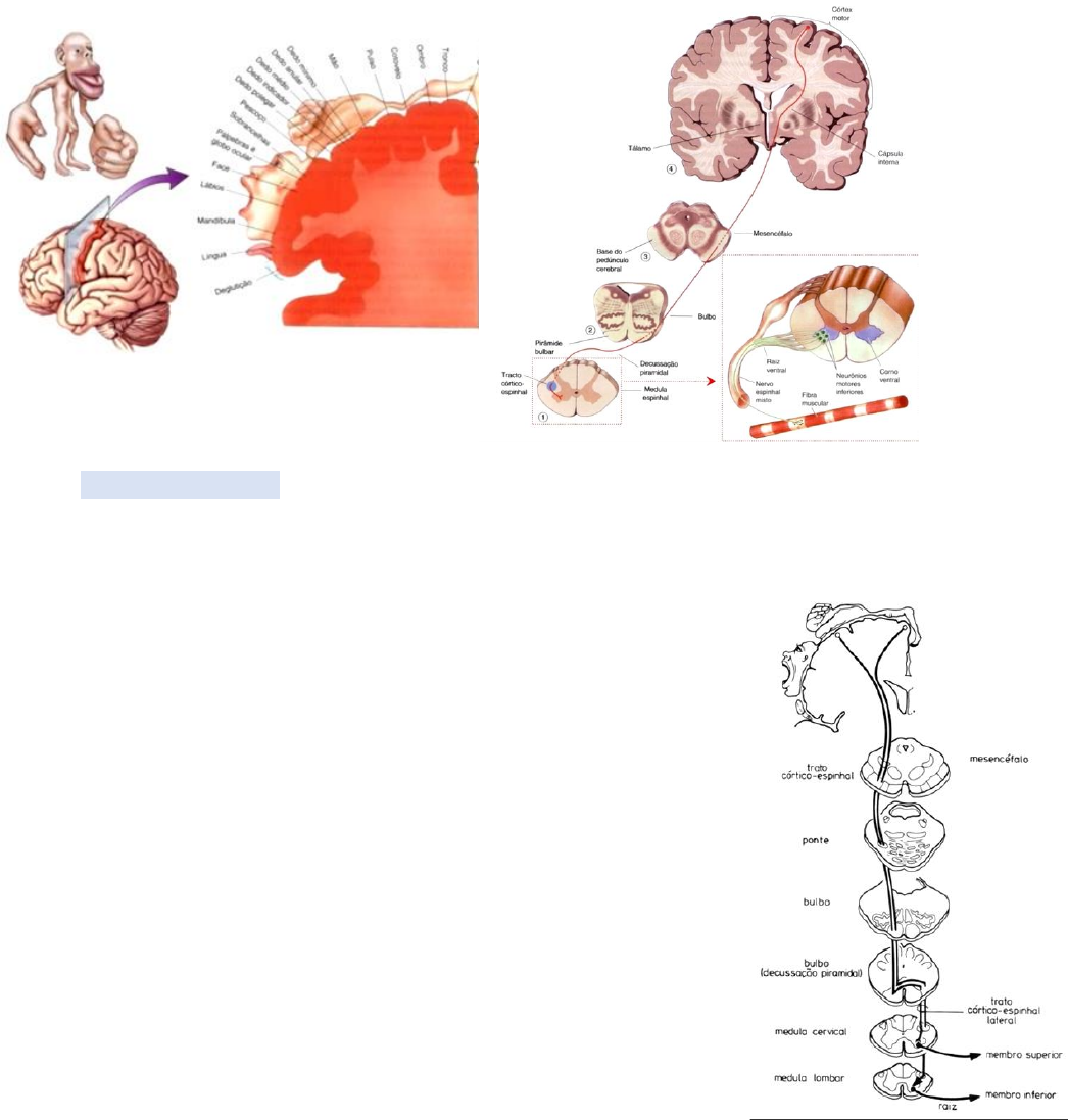 SEMIOLOGIA NEUROLÓGICA – 2ª etapa Sara Monteiro de Moura SOMATOTOPIA DO SNC − Somatotopia: é o conhecimento de que existe regiões no cérebro que são responsáveis pela função de cada lugar do corpo ▪ Esse conhecimento é muito importante no raciocínio topográfico de um quadro clinico − Cada ação (sensitiva, cognitiva, motora) possui uma correspondência topográfica no encéfalo − Homúnculo motor de Penfield: Penfield topografou o giro pré central (giro motor) de acordo com a área responsável pelo movimento de cada parte do corpo ▪ O giro pré central é localizado no lobo frontal, antes do sulco central − Trato córtico-espinhal: leva comando para a movimentação, que sai do córtex, até o musculo. ▪ O comando sai do giro pré-frontal (área motora) até o tronco cerebral ▪ Passa pelo pedúnculo cerebral (no mesencéfalo) e desce para a ponte e para o bulbo ▪ No bulbo, o trato cortico-espinhal passa pelas pirâmides bulbares (ou decussação das pirâmides), onde as fibras se cruzam Esse cruzamento das fibras é o motivo de o lado esquerdo do córtex controlar os movimentos do lado direito do corpo e vice versa ▪ Chega na parte anterior da medula espinhal (corno anterior da medula) e sai pelo sulco lateral anterior, dando origem ao nervo periférico (raiz ventral) ▪ Na junção neuromuscular, esse nervo periferico vai liberar acetilcolina, iniciando o processo de contração e movimentação ▪ Qualquer doença nesse percurso vai gerar prejuízo para a movimentação muscular ✓ Miastenia graves – junção neuromuscular ✓ Polimiosite – musculo ✓ Neuropatia periférica – nervo periferico ✓ Mielite transversa – medula ✓ AVC – cérebro − Algumas estruturas possuem mais de um nome: ▪ SNC – neurônio motor superior – 1º neurônio ▪ SNP – neurônio motor inferior – 2º neurônio ▪ Trato córtico-espinhal – via piramidal EXAME DA FORÇA MUSCULAR • Manobras deficitárias − São manobras gerais para identificar a perda de movimento no paciente ▪ Não identifica o grupo muscular prejudicado − Manobra dos braços estendidos: pede para o paciente estender os braços horizontalmente à frente do corpo, com maos e olhos abertos e observar se um braço está com perda de força em relação ao outro ▪ O braço mais fraco vai cair em relação ao que está preservado − Manobra de migazzini: paciente em decúbito dorsal, pede para fazer flexão da coxa (ângulo de 90º com o leito) e flexão do joelho e comparar uma perna com a outra ▪ A perna mais fraca vai cair mais rápido − Manobra de Barré: paciente em decúbito ventral, pede para flexionar os joelhos e observa • Exame individual dos grupos musculares (MMSS) − Deltóide: raiz de C5 ▪ Pede parra o paciente elevar os braços e faça uma força contra a resistência do paciente (empurrar para baixo) para avaliar se ele consegue ou não vencer essa resistência – comparar um lado com o outro − Flexores do cotovelo (bíceps braquial): raiz de C5 ▪ Pede o paciente para fazer o movimento de flexão do cotovelo ▪ Fazer força contra resistência (extensão do cotovelo do paciente) − Extensores do punho: raiz de C6 ▪ Pede para o paciente fazer extensão do punho e faz força contra a resistência (flexão do punho) − Extensores do cotovelo (tríceps braquial): raiz de C7 ▪ Pede para o paciente fazer o movimento de extensão do braço e faz uma força contra resistência (flexão do cotovelo) para avaliar a força − Flexores dos dedos: raiz de C8 ▪ Pede para o paciente fazer flexão dos dedos (fechar os dedos) e faz uma força contra resistência (tenta abrir) • Exame individual dos grupos musculares (MMII) − Flexor do quadril: raiz de L2 ▪ Com o paciente sentado na maca, pede para ele elevar o joelho em direção ao abdome e faz força contra a resistência − Extensor de joelho (quadríceps): raiz de L3 ▪ Paciente sentado na maca, pede para fazer a extensão de joelho e faz a força contra resistência etc − Dorsiflexor de tornozelo (tibial anterior): raiz de L4 ▪ Pede para o paciente fazer uma dorsiflexão do pé (levantar e flexionar o pé para cima) e fazer força contra resistência − Extensor do hálux: raiz de L5 ▪ Pede para o paciente fazer a extensão do hálux e avaliar se tem força no dedo − Pantiflexores do tornozelo (gastrocnêmio): raiz de S1 ▪ Pede para o paciente fazer a flexão do pé e faz força contra resistência • Gradação da força muscular − Escala de MRC – varia de 0 a 5 ✓ 0. Não ocorre movimento e nem contração muscular ✓ 1. O musculo é capaz de contrair, porém não há movimento ✓ 2. Não consegue vencer a gravidade (ex.: paciente consegue deslocar sobre o leito, mas não consegue levanta-lo) ✓ 3. É capaz de vencer a gravidade, mas não há capacidade de exercer resistência muscular ✓ 4. Vence pouca resistência ✓ 5. Força muscular normal − Plegia: ausência de contração muscular − Paresia: perda de força REFLEXOS OSTEO-TENDINOSOS − O reflexo é um movimento que ocorre quando é percutida uma extremidade muscular (tendão) e ocorre movimento imediatamente após essa ação ▪ Quando o tendão é percutido, existe um estimulo que passa por uma fibra sensitiva, sentindo ali a percussão ▪ Essa fibra leva esse estimulo até a medula, onde faz sinapse com a fibra motora, na própria medula, e deflagra uma resposta de movimento naquele musculo − Hiperreflexia: Quando há lesão no primeiro neurônio → reflexo exagerado ▪ A resposta motora do reflexo é modulada pelo primeiro neurônio → quando há lesão nessa parte, não ocorre a modulação e o reflexo sai “exagerado” − Hiporreflexia: dano na função do segundo neurônio (nervo periférico) → redução do reflexo − Arreflexia: secção do segundo neurônio → ausência de reflexo • Reflexos de MMSS − Reflexo bicipital: é realizado na região ventral do cotovelo, sob o tendão 
