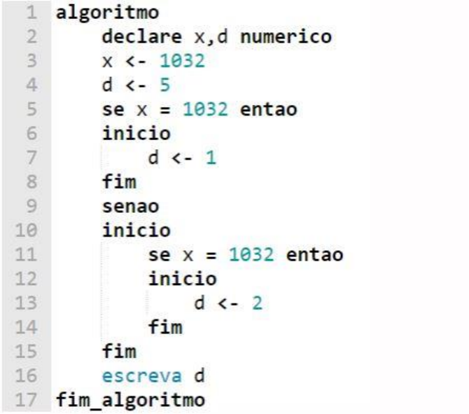 Prova Estudo Dirigido – Algoritmos e Lógica de Programação – 1ª Tentativa 1. O Ambiente de Aprendizagem Prático permite a inclusão de imagens nos pseudocódigos criados e esse recurso é realizado através da utilização da tag HTML <img>. Em relação à tag HTML de inclusão de imagens, assinale a alternativa INCORRETA. a) Uma tag <img ...> permite apenas a inclusão de uma imagem. b) O atributo src é fundamental à tag <img> e é responsável por definir qual imagem será exibida. c) A tag HTML de inclusão de imagem <img> requer a utilização da tag </img>. – RESPOSTA CORRETA d) As fotos a serem incluídas devem obrigatoriamente estarem disponíveis na internet. 2. Analise o código abaixo: Agora, marque a alternativa CORRETA sobre o código apresentado. A) Ao final, a variável d terá o valor 5. B) O valor final da variável d será 2. C) A variável d nunca terá o valor 2. – RESPOSTA CORRETA D) Esse código possui erro e não é possível a sua execução. 3. As opções de formatação especial de caracteres na linguagem HTML são: negrito, itálico e sublinhado. Marque a opção que indica quais são as tags responsáveis por realizar tais formatações. a) <n>Texto</n>, <i> Texto </i> e <u> Texto </u>. b) <b>Texto</b>, <i> Texto </i> e <u> Texto </u>. – RESPOSTA CORRETA c) <n>Texto</n>, <i> Texto </i> e <s> Texto </s>. d) <b>Texto</b>, <i> Texto </i> e <s> Texto </s>. 4. As estruturas de repetição são frequentemente chamadas de laço de repetição ou simplesmente laço, e podem ser classificadas em dois grupos: comandos de repetição controlados por contador e comandos de repetição controlados por condição. Uma das estruturas de repetição controladas por condição é o comando repita ... até. Analise o trecho de algoritmo abaixo: ... repita leia var1 até var1 > 10 E var1 < 20 ... Marque a opção que contenha apenas valores que, se informados para a variável var1, fariam com que o laço de repetição seja finalizado. A) 10 ou 11 ou 12 B) 10 ou 20 C) 11 ou 12 ou 13 – RESPOSTA CORRETA D) 10 ou 15 ou 20 5. Ao digitar o código fonte apresentado abaixo, no sistema Ambiente de Aprendizagem Prático, será apresentada uma mensagem de erro. Você verá que na linha 4 está faltando uma vírgula para separar as variáveis n1 e n2. Marque a alternativa CORRETA referente a essa mensagem. A) O sistema irá perceber o erro na linha 4 e apresentará a mensagem de erro “Sintaxe nao aceita: aguardando uma vírgula, linha 5, coluna 8”. B) O sistema irá perceber o erro apenas na linha 5 e apresentará a mensagem de erro “Sintaxe nao aceita: "m" declarado quando se espera "<-", linha 5, coluna 1”. – RESPOSTA CORRETA C) O sistema não irá perceber nenhum erro e consequentemente irá executar o pseudocódigo D) O sistema irá perceber o erro na linha 4 e apresentará a mensagem de erro “Sintaxe nao aceita: “n2” declarado quando se espera, linha 5, coluna 8”. 6. Para somar 2 matrizes elas devem ter a mesma dimensão. Além disso, dada a matriz e , a soma deve ocorrer entre elementos da mesma posição. Por exemplo: A[1,1] + B[1,1], A[3,1] + B[3,1],... Considere duas matrizes e , marque a alternativa que calcule corretamente a soma das matrizes e armazene na matriz . a) Para linha <- 1 até 4 faça Para coluna <- linha até 4 faça C[linha,coluna] <- A[linha,coluna] + B[linha,coluna] b) Para linha <- 1 até 4 faça Para coluna <- 1 até 4 faça C[linha,coluna] <- A[linha,linha] + B[coluna,coluna] c) Para i <- 1 até 4 faça C[i,i] <- A[i,i] + B[i,i] Para linha <- 1 até 4 faça inicio valor <- 0 Para coluna <- 1 até 4 faça valor <- A[linha,coluna] + B[linha,coluna] C[linha,coluna] <- valorFim d) Para linha <- 1 até 4 faça Para coluna <- 1 até 4 faça C[linha,coluna] <- A[linha,coluna] + B[linha,coluna] – RESPOSTA CORRETA 7. Existem várias formas de ordenar um vetor. Uma delas é a ordenação por inserção. para j <- 2 até tamanho faça inicio valor <- vet[j] i <- j - 1 enquanto i > 0 e vet[i] > valor faça inicio vet[i+1] <- vet[i] i <- i - 1 fim vet[i+1] <- valor fim onde vet representa um vetor e tamanho representa o tamanho de um vetor. Considerando o vetor abaixo, marque a alternativa que representa o vetor após a primeira iteração de j. 9 6 5 2 8 A) 2 6 5 9 8 B) 6 9 5 2 8 – RESPOSTA CORRETA C) 8 6 5 2 9 D) 9 6 5 2 8 E) 2 5 6 8 9 8. As proposições consideradas na lógica matemática podem ser agrupadas em uma proposição composta, com o uso de operadores lógicos E, OU, NÃO e possuem duas características: • Uma proposição é verdadeira ou falsa. • Uma proposição não pode ser verdadeira e falsa, simultaneamente. Considere V como valor mínimo da parcela e Q como a quantidade máxima de parcelas possíveis, em que temos as afirmações s e t abaixo: s: V >= 100 t: Q <= 5 Para representar um cenário no qual existem duas condições de parcelamento que devem ser atendidas simultaneamente, apresentadas abaixo: • Valor mínimo da parcela: R$ 100,00 • Quantidade máxima de parcelas permitidas: 5 parcelas. A proposição u que representa o cenário com as condições de parcelamento descritas CORRETAMENTE é: A) u: s B) u: s OU t C) u: s E t – RESPOSTA CORRETA D) u: s NÃO t 9. Uma matriz quadrada possui o mesmo número de linhas e colunas. Por exemplo: . A partir de uma matriz quadrada, podemos calcular sua diagonal secundária quando i + j = n + 1, onde i, j representam as posições de linha e coluna, e n representa a dimensão da matriz. Veja o exemplo abaixo da diagonal secundário destacada. Marque o trecho de pseudocódigo que imprima os valores da diagonal secundária de uma matriz quadrada A) n <- 5 Para i <- 1 até n faça Para j <- 1 até n faça Se (i = j) então Escreva “valor da posição A[”, i , ”,” , j , “]=”, A[i,j] B) n <- 5 Para i <- 1 até n faça Para j <- i até n faça Se (i + j = n + 1) então Escreva “valor da posição A[”, i , ”,” , j , “]=”, A[i,j] C) n <- 5