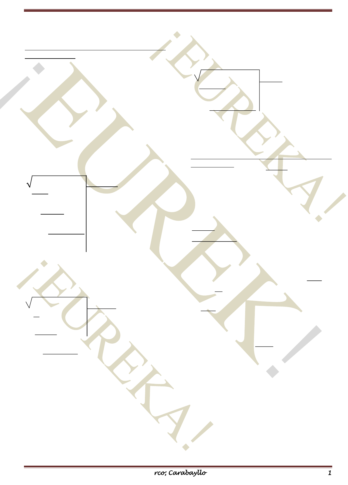 EUREKA!, preparando para la UNI …simplemente el mejor Magdalena; Los Olivos; Ingeniería ; Surco; Carabayllo Página 1 ARITMÉTICA SEMANA 22: RADICACIÓN. ALGORITMO PARA LA RAIZ CUADRADA Y RAIZ CUBICA ENTERA 01. Calcular la suma de las cifras de la raíz cuadrada de: 1111155556 A) 15 B) 16 C) 17 D) 18 E) 19 (CEPRE 2005-II) 02. Al calcular la raíz cuadrada entera de 1023456789, se obtiene que la suma de cifras de la raíz es A y la suma de cifras del residuo por defecto es B. Dar como respuesta la diferencia positiva. A) 2 B) 3 C) 1 D) 4 E) 5 03. Halle la suma de las cifras del radicando en la siguiente operación (cada * representa a una cifra) * * * * * * A) 21 B) 19 C) 17 D) 22 E) 20 04. Halle la suma de las cifras que tiene el radicando de la siguiente operación: * 2 5 * ** ** * * 2 * * * * * *1 * * * * 2 3 A) 11 B) 15 C) 17 D) 19 E) 21 05. Al extraer la raíz cúbica entera del número 1 371 330 631, calcule la suma de cifras de la raíz es A) 3 B) 4 C) 5 D) 6 E) 7 06. La raíz cúbica del número -42136, está comprendida entre dos enteros consecutivos cuya suma es: A) -71 B) -69 C) -67 D) -65 E) 69 (CEPRE 2004-II) 07. En la siguiente radicación cúbica cada letra y cada * representa a una cifra, entonces a + b + c + d + e + f es * * * * b * a c d e f * * 009* a * * * * a 3 * 9 3 A) 32 B) 30 C) 29 D) 35 E) 28 PROPIEDADES Y RESIDUOS MÁXIMOS DE LA RAIZ N-ESIMA 08. Sabiendo que tanto 104 6ab como su raíz cuadrada son cuadrados perfectos. Determine (a + b). A) 10 B) 16 C) 14 D) 20 E) 12 09. Al extraer la raíz cúbica entera del número 405 7ab se obtuvo como residuo ( )( )2 3 3a b+ + . Calcule ( )a b+ A) 5 B) 6 C) 7 D) 8 E) 9 10. Al extraer la raíz cúbica entera de abcd se obtuvo ad como raíz y 190 de residuo, (a, b, c y d son significativas). Calcule la suma de cifras de abcd . A) 9 B) 10 C) 11 D) 12 E) 8 11. Si el número 5 6N a bc= tiene una cantidad impar de divisores positivos, además a, b y c son diferentes. La suma de las cifras de la raíz cuadrada de N es: A) 11 B) 13 C) 9 D) 10 E) 12 12. Al extraer la raíz cuadrada de un número se obtuvo como residuo 22. Si el número se cuadruplica, la raíz cuadrada aumenta y el residuo se reduce en 7. Calcule dicho número y dé como respuesta la suma de las cifras. A) 13 B) 14 C) 15 D) 16 E) 17 * * * * * * 5 * * * * * 1 * * - - - - * * * EUREKA!, preparando para la UNI …simplemente el mejor Magdalena; Los Olivos; Ingeniería ; Surco; Carabayllo Página 2 13. Si 4 29x y+ = y 49x y− = siendo x mnp= e y pqr= . Calcule: (m + n + p + q + r) A) 22 B) 24 C) 26 D) 28 E) 30 14. Al extraer la raíz cúbica entera de N se obtiene 88 de residuo, si se duplica el radicando y se vuelve a extraer la raíz cúbica entera, la raíz aumenta en 2 unidades y el nuevo residuo es 303. Calcule la suma de las cifras de N. A) 9 B) 10 C) 12 D) 15 E) 16 15. Los residuos por defecto que se obtienen al extraer la raíz cuadrada y la raíz cuarta de un número entero positivo N son 50 y 154, respectivamente. Calcular la raíz cúbica entera por defecto e N. A) 5 B) 6 C) 7 D) 8 E) 9 16. ¿Cuántos números naturales N de 2 cifras cumplen que tienen raíz cuadrada inexacta, el residuo por defecto no es máximo y dicho número es divisible por su raíz por defecto? A) 4 B) 5 C) 6 D) 7 E) 8 (CEPRE 2006-II) 17. Al extraer la raíz cúbica de abc se obtuvo “c” como raíz y residuo máximo. Si “c” es máximo, calcule (a + b + c). A) 7 B) 8 C) 17 D) 18 E) 27 18. ¿Cuántos números de 4 cifras existen, tales que al extraerles tanto la raíz cuadrada como la raíz cúbica, se obtiene el mismo residuo diferente de cero? A) 5 B) 10 C) 100 D) 128 E) 256 19. Se sabe que al extraer la raíz cúbica entera del número N se obtiene un residuo máximo y al extraer la raíz cúbica entera de N aumentado en 1801 obtendremos también residuo máximo. Determine la suma de las cifras de N. A) 15 B) 16 C) 17 D) 18 E) 20 20. A un número le faltan 57 unidades para ser un cuadrado perfecto y al calcular su raíz cuadrada por defecto se obtuvo como residuo la raíz cuadrada del residuo máximo. Calcule la suma de las cifras de dicho número. A) 5 B) 6 C) 7 D) 8 E) 9 21. Al extraer la raíz cúbica entera de un número se obtiene se obtiene a 216 como resto máximo. ¿Cuál es la suma de las cifras del resto máximo obtenida al extraer la raíz cuadrada de dicho número? A) 4 B) 5 C) 6 D) 7 E) 8 22. En una operación de raíz cuadrada entera, la diferencia entre el radiando y el residuo por defecto es 361 y el resto por exceso excede al resto por defecto en 17 unidades. Calcule la suma de las cifras del radicando. A) 15 B) 12 C) 14 D) 17 E) 18 23. ¿Cuántos números menores que 15000, al extraerles su raíz cúbica entera, dan como residuo el máximo posible, siendo éste residuo múltiplo de 7? Dar como respuesta la suma de los tres menores números que cumplen con dicha condición. A) 3420 B) 3488 C) 3506 D) 3590 E) 3596 24. ¿Cuál es la suma de las cifras del menor número cuadrado perfecto que puede ser residuo máximo de una raíz cúbica? A) 6 B) 8 C) 9 D) 10 E) 12 (CEPRE 2009-I) 25. Al extraer la raíz cuadrada de un número se tomó por error al residuo como raíz y a ésta como residuo, resultando un número que es inferior en 372 unidades al original. Si la diferencia de la raíz menos el residuo es 3, calcule el número original. A) 4149 B) 4150 C) 4157 D) 4158 E) 4159 (UNI 2005-II) 26. Las raíces cúbicas inexactas de dos enteros positivos son dos números consecutivos y sus residuos, en cada caso, son los máximos posibles. Halle la suma de estos números si la diferencia de sus residuos es 54. A) 1416 B) 1524 C) 1727 D) 1836 E) 1976 (UNI 2013-II) 27. Un numeral capicúa de 5 cifras tiene como raíz cuadrada a otro capicúa de 3 cifras y este, a la vez, tiene como raíz cuadrada otro capicúa de 2 cifras. Calcule la suma de cifras del primer número capicúa. EUREKA!, preparando para la UNI …simplemente el mejor Magdalena; Los Olivos; Ingeniería ; Sur
