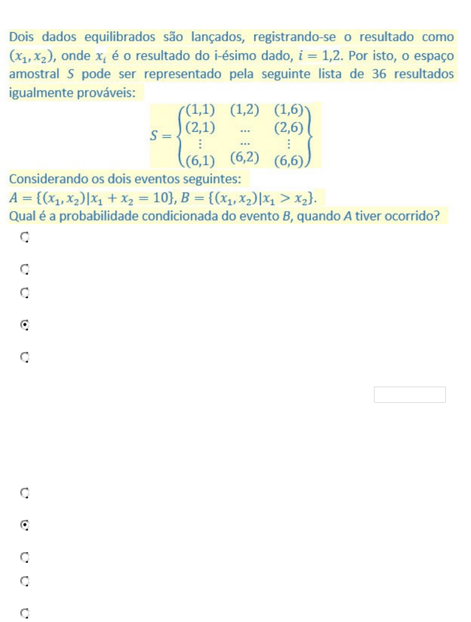 AS I PERGUNTA 1 1. a. 0,25. b. 0,99. c. 0,02. d. 0,33. e. 0,083. 0,15 pontos PERGUNTA 2 1. Considere um lote de 100 peças, das quais há 20 peças defeituosas e 80 não defeituosas. Considere A o evento de retirarmos uma peça defeituosa e B o evento de retirarmos uma segunda peça defeituosa, após A ter ocorrido. Qual é a probabilidade da interseção entre A e B? a. 0,45. b. 0,19. c. 0,99. d. 0,3. e. 0,25. 0,15 pontos PERGUNTA 3 1. Considere um lote de 100 peças, das quais há 20 peças defeituosas e 80 não defeituosas. Qual é a probabilidade de retirarmos duas peças seguidas, sem reposições, e defeituosas? a. 0,45. b. 0,3. c. 0,99. d. 0,25. e. 0,19. 0,15 pontos PERGUNTA 4 1. a. 0,99. b. 0,083. c. 0,25. d. 0,02. e. 0,01.