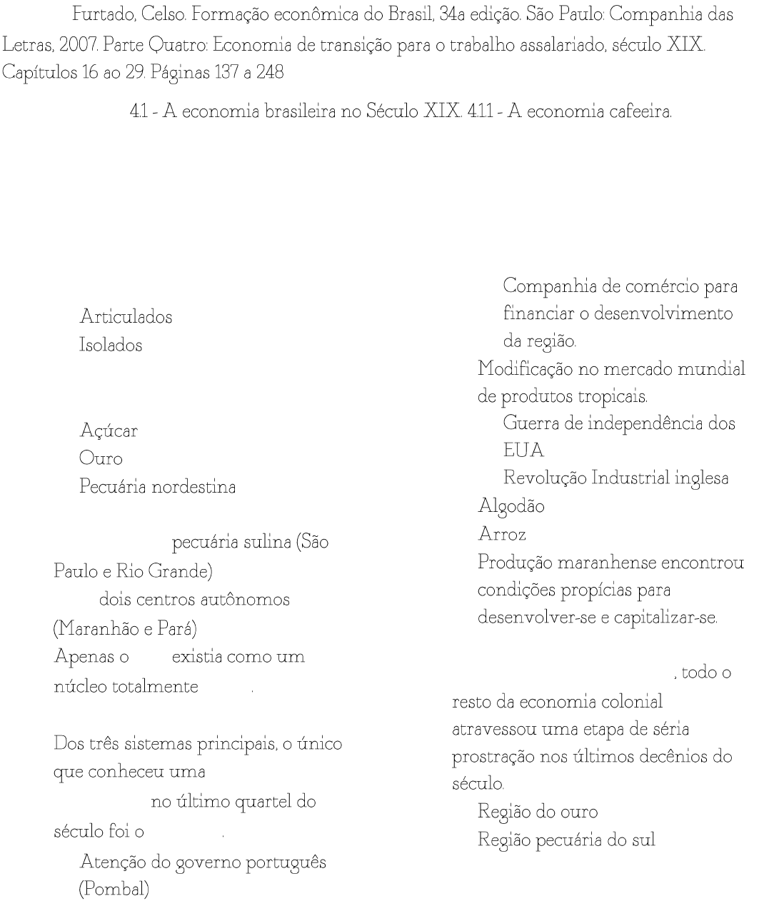 Economia Brasileira Clipping – Ciclo 1 - O processo de expansão capitalista no século XIX Leitura: Item do edital: Quarta Parte - Economia De Transição Para O Trabalho Assalariado Século XIX Capítulo XVI O Maranhão E A Falsa Euforia Do Fim Da Época Colonial • Sistemas da economia brasileira: • Polos principais de articulação: • Núcleo mineiro: • Norte: • Pará isolado • efetiva prosperidade Maranhão ➢ ➢ ➢ • Excluído o núcleo maranhense • Fatores circunstanciais Acontecimentos políticos ➢ ➢ ➢ o o o • 1789 – colapso da colônia açucareira francesa (Haiti) • Atividade industrial na Inglaterra • Dificuldades nas colônias espanholas • Conclusão: Capítulo XVII Passivo Colonial, Crise Financeira e Instabilidade Política • • • • • • • • • Dificuldades: 1. 2. 3. 4. 5. Café • Inexistência de um aparelhamento fiscal no país. ➢ • Anos 20 • ➢ Capítulo XVIII Confronto com o desenvolvimento dos EUA • ➢ Linhas gerais da política inglesa: ➢ ➢ Avanço da indústria da construção naval. ➢ Transtornos políticos na Europa ➢ ➢ Primeira fase da Revolução Industrial - características básicas: ➢ ➢ ➢ Capítulo XIX Declínio a longo prazo do nível de renda: primeira metade do século XIX • Porém: • Conclusão: • • Capítulo XX Gestação da Economia Cafeeira • • • • • • O mercado do açúcar tornara-se cada vez menos promissor. • Situação do algodão • • ➢ ➢ Capítulo XXI O problema da mão de obra Oferta interna potencial • • • • • • Capítulo XXII O problema da mão-de-obra II Diferentes soluções: 1. Inglaterra: 2. EUA: 3. Brasil: • • • • Antes: ➢ ➢ ➢ 1860 ➢ ➢ ➢ ➢ 1870 ➢ Resultado das medidas: • Bases para a formação da grande corrente imigratória Capítulo XXIII O Problema da mão-de-obra Transumância amazônica • • Movimento de população: • • • • Etapas da evolução da economia mundial da borracha: ➢ ➢ • • • • • • • Situação do nordestino na Amazônia: Capítulo XXIV O Problema da Mão-de-Obra IV Eliminação do trabalho escravo • • Consequências da abolição no Brasil • Região nordestina Nas regiões urbanas: No interior: ➢ • Indústria açucareira ➢ • Região cafeeira ➢ ➢ ➢ ➢ • Conclusão: Capítulo XXV Nível de renda e ritmo de crescimento na segunda metade do XIX • • • • Açúcar e algodão: • Setores principais da economia brasileira: 1) Economia do açúcar e do algodão Região nordestina: ➢ Litorâneo ➢ Mediterrâneo ➢ Hipóteses: a) b) ➢ Inadmissível 2) Economia principalmente de subsistência do sul ➢ ➢ 3) Economia cafeeira ➢ • fora dos três sistemas: Bahia: ➢ Fumo: Amazônia: • • • Causa do atraso relativo da economia brasileira: • • • • ➢ • • • • • • Capítulo XXVII A Tendência ao Desequilíbrio Externo • Teoria monetária do século XIX. ➢ • Economia brasileira do século XIX • • • • Capítulo XVIII A Defesa do Nível de Emprego e a Concentração da Renda • • • • • • • • • • Capítulo XXIX A descentralização republicana e a formação de novos grupos de pressão • Transferências de renda assumiam várias formas. • Os núcleos mais prejudicados eram as populações urbanas. • ➢ • • • • Aula sobre o livro “Formação Econômica do Brasil” de Celso Furtado (fonte: Youtube – Leonardo Leite) Capítulos 16 a 20 • • • • • • • • • • • Reposta: • Café Capítulos 21 a 24 O problema da mão-de-obra • • • • Transumância amazônica (cap. 23) • • Transumância • Livro – O Quinze
