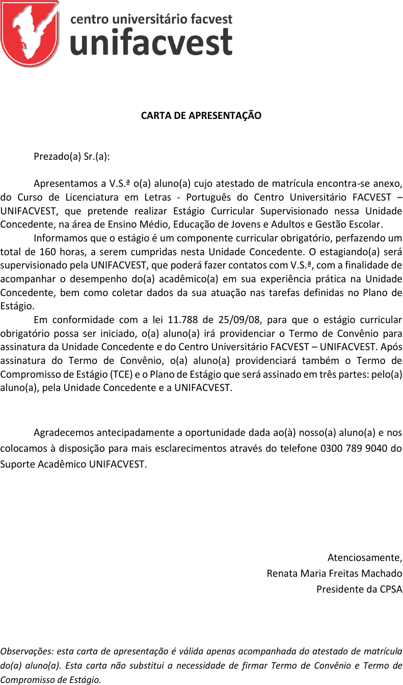 CARTA DE APRESENTAÇÃO Prezado(a) Sr.(a): Apresentamos a V.S.ª o(a) aluno(a) cujo atestado de matrícula encontra-se anexo, do Curso de Licenciatura em Letras - Português do Centro Universitário FACVEST – UNIFACVEST, que pretende realizar Estágio Curricular Supervisionado nessa Unidade Concedente, na área de Ensino Médio, Educação de Jovens e Adultos e Gestão Escolar. Informamos que o estágio é um componente curricular obrigatório, perfazendo um total de 160 horas, a serem cumpridas nesta Unidade Concedente. O estagiando(a) será supervisionado pela UNIFACVEST, que poderá fazer contatos com V.S.ª, com a finalidade de acompanhar o desempenho do(a) acadêmico(a) em sua experiência prática na Unidade Concedente, bem como coletar dados da sua atuação nas tarefas definidas no Plano de Estágio. Em conformidade com a lei 11.788 de 25/09/08, para que o estágio curricular obrigatório possa ser iniciado, o(a) aluno(a) irá providenciar o Termo de Convênio para assinatura da Unidade Concedente e do Centro Universitário FACVEST – UNIFACVEST. Após assinatura do Termo de Convênio, o(a) aluno(a) providenciará também o Termo de Compromisso de Estágio (TCE) e o Plano de Estágio que será assinado em três partes: pelo(a) aluno(a), pela Unidade Concedente e a UNIFACVEST. Agradecemos antecipadamente a oportunidade dada ao(à) nosso(a) aluno(a) e nos colocamos à disposição para mais esclarecimentos através do telefone 0300 789 9040 do Suporte Acadêmico UNIFACVEST. Atenciosamente, Renata Maria Freitas Machado Presidente da CPSA Observações: esta carta de apresentação é válida apenas acompanhada do atestado de matrícula do(a) aluno(a). Esta carta não substitui a necessidade de firmar Termo de Convênio e Termo de Compromisso de Estágio. Es te d oc um en to fo i a ss in ad o di gi ta lm en te p or : U NI FA CV ES T. P ar a ve rif ica r a s as sin at ur as a ce ss e o sit e ht tp s: // ca m ar ad ec on tra to s. co m .b r/ sis te m av 2 e ut iliz e o có di go 53 9E -C 3C B- F7 6B -7 1F 8- 98 2D -5 99 F- 04 C8 -9 2C 7 Este documento foi assinado digitalmente por: UNIFACVEST. Para verificar as assinaturas acesse o site https://camaradecontratos.com.br/sistemav2 e utilize o código 539E-C3CB-F76B-71F8-982D-599F-04C8-92C7 PROTOCOLO DE ASSINATURA O documento acima foi proposto para assinatura digital na plataforma Câmara de Contratos. Para verificar as assinaturas clique no link: https://camaradecontratos.com.br/sistemav2/php/validar.php?codigo=539E-C3CB-F76B-71F8-982D- 599F-04C8-92C7 ou acesse o site https://camaradecontratos.com.br/sistemav2 e utilize o código abaixo para verificar se este documento é válido. Código para validação: 539E-C3CB-F76B-71F8-982D-599F-04C8-92C7 Hash do Documento original 89edf0252ad6df751ab7ceb7773ade064cf83fd42086ea3af735ce7633b8c29d Abaixo as pessoas que assinaram digitalmente este documento: -RENATA MARIA FREITAS MACHADO (081.776.449-63) [Assinou em nome de UNIFACVEST (04.608.241/0001-79)] em 17/03/2022 14:03:45 (Tipo de Assinatura: ICP-Brasil)