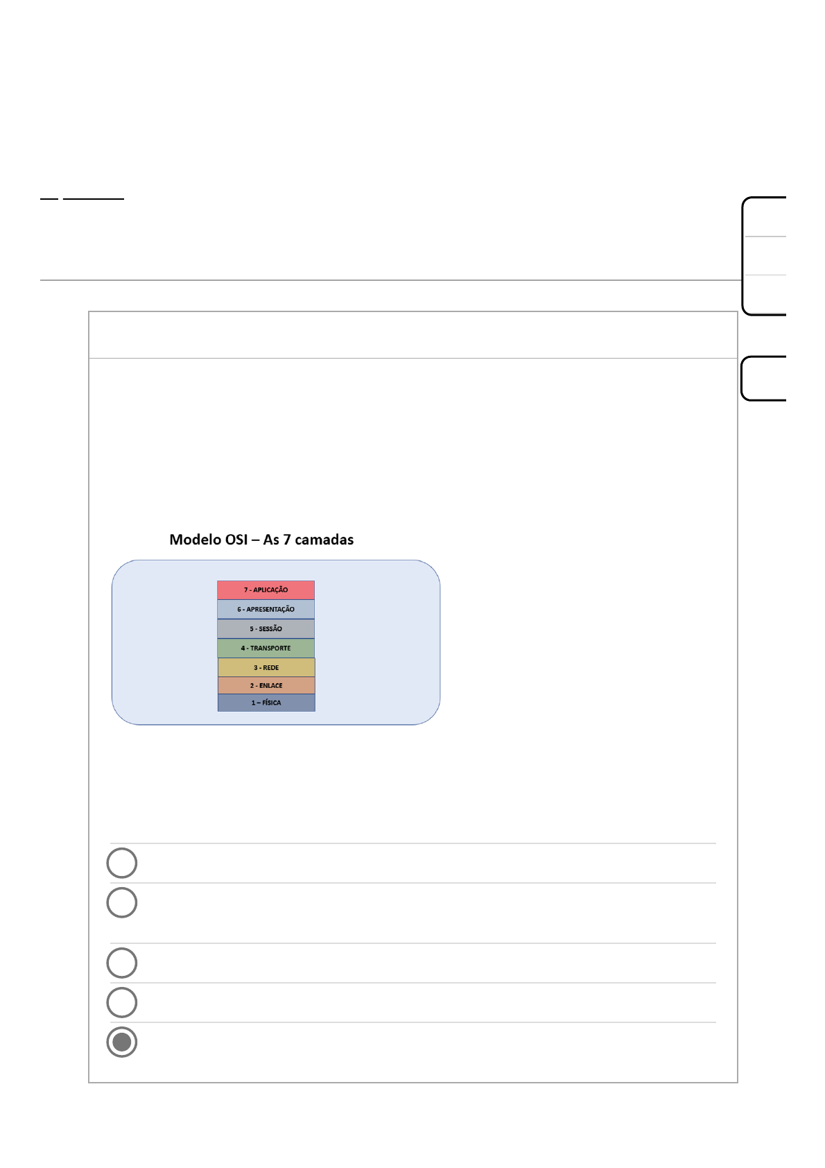 02/12/2022 20:29 Teste: AO2 https://famonline.instructure.com/courses/24252/quizzes/109887/take 1/16 AO2 Iniciado: 2 dez em 20:12 Instruções do teste Importante: Caso você esteja realizando a atividade através do aplicativo "Canvas Student", é necessário que você clique em "FAZER O QUESTIONÁRIO", no final da página. 0,6 ptsPergunta 1 Trata-se de uma camada livre para uso posterior. Formata e apresenta os dados, é responsável por exemplo que duas redes diferentes se comuniquem, traduzindo os dados neste processo de comunicação. É responsável pelo transporte dos dados recebidos da camada anterior. É responsável pelo controle físico dos dados enviados para a camada anterior. É responsável pela fragmentação dos dados recebidos da camada anterior. Leia o texto a seguir: A figura abaixo demonstra as 7 camadas OSI da comunicação de redes de computadores, assim ordenando e facilitando o estágio de cada etapa de sua comunicação. Sobre a camada de Enlace, afirma-se que: A+ A A- 02/12/2022 20:29 Teste: AO2 https://famonline.instructure.com/courses/24252/quizzes/109887/take 2/16 0,6 ptsPergunta 2 Leia o texto a seguir: O que faz um analista de segurança da informação. A área de segurança da informação já foi muito negligenciada por empresas de todos os tamanhos. Muitos profissionais da área já se viram dividindo responsabilidades e funções com outros departamentos das companhias. É o caso de Rafael Foster, atualmente Engenheiro de Sistemas na Sophos Brasil. Ele conta que, no começo da sua carreira, também chegou a responder pelos processos financeiros de onde trabalhou. No entanto, os recentes ataques hackers mostram o quanto os prejuízos podem ser nocivos para as organizações. Além de terem seus dados sigilosos roubados, empresas que sofrem com vazamentos de dados correm o risco de perder clientes, além de terem suas reputações danificadas. A função de um analista de segurança da informação é, exatamente, garantir a segurança dos dados de uma empresa, o que passa por desde uma análise de documentos a dispositivos utilizados por funcionários, para decidir o que pode ser levado para fora da empresa e o que não pode. O profissional de segurança da informação também "trabalha na elaboração de normas internas como por exemplo, se um funcionário pode sair com um documento da empresa ou com um dispositivo, além de garantir as melhores práticas de segurança”, explica Foster. O executivo explica que também é função do analista garantir que, mesmo sofrendo um ataque hacker, ou mesmo tendo os dados roubados a empresa continue operando. “Ele precisa garantir que a empresa esteja funcionando mesmo após um desastre, executando um plano de recuperação de desastres, além de seguir o plano de segurança, que normalmente é desenvolvido pelo Chief Information Security Officer (CISO)”, conta. Um plano de segurança, é um conjunto de normas, normalmente estabelecidos pelos responsáveis pela área de segurança, que regula o comportamento de funcionários com objetivo de manter seus dados e transações seguras e garantir que, nenhum documento ou informação seja, vazada. Já a recuperação de desastres é uma estratégia que exige dos profissionais de segurança ações para mitigar as consequências dos ataques orquestrados por hackers. A+ A A- 02/12/2022 20:29 Teste: AO2 https://famonline.instructure.com/courses/24252/quizzes/109887/take 3/16 As asserções I e II são proposições verdadeiras, e a II não é uma justificativa da I. As asserções I e II são proposições verdadeiras, e a II é uma justificativa da I. As asserções I é uma proposição falsa, e a II é uma proposição verdadeira. As asserções I e II são falsas. As asserções I é uma proposição verdadeira, e a II é uma proposição falsa. LGPD reforça a urgência dos analistas de segurança Como explica Foster, todas empresas precisam de uma equipe de segurança bem estabelecida e que trabalhe dentro das exigências da Lei Geral de Proteção de Dados (LGPD), que entra em vigor em agosto de 2020. O executivo explica que a desde a criação da LGPD, o trabalho do analista vem sendo mais valorizado. “Empresas não queriam investir em segurança”, comenta Foster. No entanto, agora o investimento em segurança faz parte das exigências legais de funcionamento de uma instituição. Disponível em: https://computerworld.com.br/2019/09/02/o-que-faz-um- analista-de-seguranca-da-informacao-e-quanto-ganha-em-media/ (https://computerworld.com.br/2019/09/02/o-que-faz-um-analista-de-seguranca-da- informacao-e-quanto-ganha-em-media/) . Acesso em: 07 de fevereiro de 2020. Considerando as informações apresentadas, avalie as asserções a seguir e a relação entre elas: I. Existe uma grande preocupação na contratação de um profissional da segurança da informação, que vem sendo valorizado e tornou-se indispensável neste mercado. PORQUE II. Se faz necessário a preparação deste perfil profissional com as novas tecnologias, como supercomputadores, internet de alta velocidade e a gama de transações via Web no mercado atual, mas com uma característica de pesquisa para as inovações e as tecnologias emergentes. A respeito destas asserções, assinale a opção correta. A+ A A- https://computerworld.com.br/2019/09/02/o-que-faz-um-analista-de-seguranca-da-informacao-e-quanto-ganha-em-media/ 02/12/2022 20:29 Teste: AO2 https://famonline.instructure.com/courses/24252/quizzes/109887/take 4/16 0,6 ptsPergunta 3 Leia o texto a seguir: Durante toda a evolução das topologias de redes de computadores, observamos que muitos desses formatos tecnológicos foram perdendo espaço em sua utilização, devido a problemas de comunicação, manutenção, escalabilidade, etc. Portanto podemos afirmar que: I. A topologia Estrela, nos dias atuais, são plenamente utilizadas em praticamente todos os projetos de redes de computadores, como podemos observar na figura abaixo: 