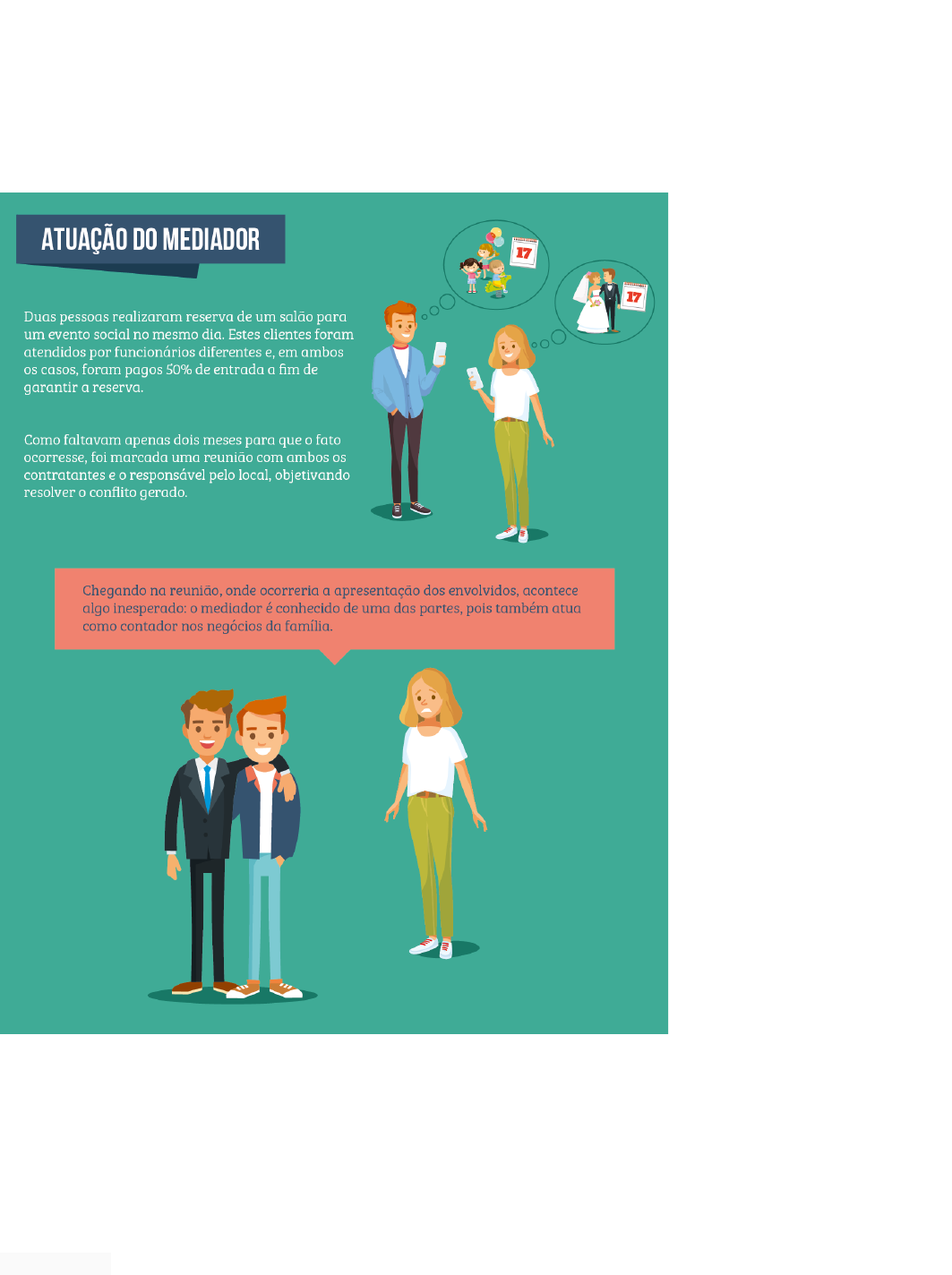 Mediação e Arbitragem: O Mediador Desafio Os conflitos a serem acompanhados pelo mediador podem ser das mais diferentes naturezas. Por exemplo: o que aconteceria se duas festas fossem marcadas para um salão na mesma data? Acompanhe o caso a seguir para responder sobre a atuação do mediador! Supondo que você seja o mediador da situação apresentada acima, pense em qual seria a sua reação e o que você faria. Agora responda: Qual seria a atitude mais indicada na solução do conflito durante a reunião? Seria correto seguir adiante como mediador conhecendo uma das partes? Visto que só faltam dois meses para as festas, as negociações são permitidas no processo de mediação? Sua resposta Como o Contador tem vínculo com ambas as partes, não deve tomar partido, obrigatoriamente ser imparcial. O mediador não vai decidir sobre a situação; quem decide são as partes, mas esse tem a função de aproximar estas e propiciar uma negociação entre elas, evitando, dessa forma, que as partes se enfrentem judicialmente. O processo de mediação poderá levar algumas semanas e as negociações existem e podem ser mantidas, isto é, conforme vão ocorrendo os encontros de mediação, as negociações são possíveis. Padrão de resposta esperado Neste caso, já sendo conhecido e atuando como contador para uma das partes envolvidas, não haveria a possibilidade de mediar tal situação, pois o vínculo com um dos contratantes poderia influenciar no auxílio, beneficiando uma das partes. O mediador obrigatoriamente deve ser imparcial. O mediador não vai decidir sobre a situação; quem decide são as partes, mas esse tem a função de aproximar estas e propiciar uma negociação entre elas, evitando, dessa forma, que as partes se enfrentem judicialmente. O processo de mediação poderá levar algumas semanas e as negociações existem e podem ser mantidas, isto é, conforme vão ocorrendo os encontros de mediação, as negociações são possíveis. Exercícios Respostas enviadas em: 07/12/2022 07:54 1. Qual a alternativa correta com relação à função do mediador? Você acertou! B. O mediador tem como encargo assessorar os envolvidos para que eles possam decidir e solucionar uma situação de conflito. Além disso, é importante destacar que o mediador sempre deve ser imparcial. 2. Ainda com base nas funções que possui o mediador, é possível afirmar que ele deve: Você acertou! C. Concluir o processo de mediação a partir de uma negociação favorável a ambas partes. O mediador encerra a mediação no momento em que existe uma negociação que seja agradável para ambas as partes, pois, conforme vão ocorrendo os encontros de mediação, as negociações são possíveis. 3. Referente às características do mediador, avalie e aponte a opção correta. Você acertou! D. É necessário que o mediador tenha dentre os seus princípios a oralidade. É desta forma que o mediador transmitirá seus conhecimentos e usará a comunicação. 4. Avalie as alternativas e aponte a correta. Você acertou! E. O comando da situação mediada ficará sempre com o mediador. Sim, o domínio da situação deverá sempre ser do mediador, promovendo respeito pelas partes, mas a decisão final será tomada por estas. 5. Considerando os processos necessários que acompanham a mediação, considere a alternativa correta. Você acertou! A. Um dos processos para a mediação é a explicação referente à objeção e aos interesses. Com este processo ficam mais fáceis a mediação e a busca pelo objetivo de resolver as diferenças existentes.