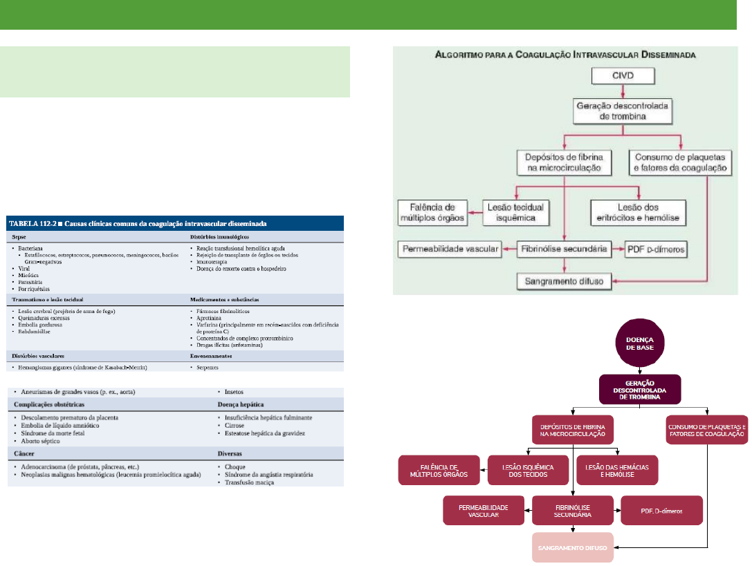 Geovanna P8 SP 2.3 COAGULAÇÃO INTRAVASCULAR DISSEMINADA (CIVD) É uma síndrome que se caracteriza pela formação intravascular disseminada de fibrina em resposta à atividade excessiva das proteases sanguíneas, que suplanta os mecanismos anticoagulantes naturais. - Causas mais comuns: sepse bacteriana, doenças neoplásicas malignas, como tumores sólidos ou leucemia promielocítica aguda, e causas obstétricas. FISIOPATOLOGIA - O mecanismo da CIVD consiste na produção descontrolada de trombina pela exposição do sangue a níveis patológicos do fator tecidual. - A supressão simultânea dos mecanismos anticoagulantes fisiológicos e a fibrinólise anormal aceleram ainda mais o processo. Em conjunto, essas anormalidades contribuem para a deposição sistêmica de fibrina nos vasos de pequeno e médio calibre. - A duração e intensidade da deposição de fibrina podem comprometer a irrigação sanguínea de alguns órgãos, em particular pulmões, rins, fígado e cérebro, resultando na falência secundária de suas funções. - A ativação persistente da coagulação leva ao consumo dos fatores a coagulação e das plaquetas, o que, por sua vez, causa sangramento sistêmico. O processo é ainda mais agravado pela hiperfibrinólise secundária. QUADRO CLÍNICO • Sangramentos, desde sangramentos nos locais de punção venosa, petéquias e equimoses a hemorragias graves no trato gastrointestinal, nos pulmões ou no SNC. • CIVD crônica as hemorragias são discretas e limitam-se às superfícies cutâneas ou mucosas • Pode haver trombose de grandes vasos e embolia cerebral • Complicações hemodinâmicas e choque são comuns em pacientes com CIVD aguda - O estado de hipercoagulabilidade da CIVD evidencia-se por obstrução dos vasos da microcirculação com falência secundária dos órgãos. Geovanna P8 DIAGNÓSTICO - Clinicamente baseia-se na existência de anormalidades clínicas e/ou laboratoriais da coagulação ou trombocitopenia. - Não existe um exame isolado que estabeleça o diagnóstico de CIVD. - A investigação laboratorial deve incluir: • Testes de coagulação: TTPa, TP, tempo de trombina (TT) • Marcadores dos produtos de degradação da fibrina (PDF) • Contagem de plaquetas e hemácias • Exame de esfregaço de sangue periférico - Esses exames devem ser repetidos no decorrer de um período de 6 a 8 horas, visto que uma anormalidade incialmente leve pode sofrer mudança drástica em pacientes com CIVD grave. - Anormalidades mais comuns: • Prolongamento do TP e/ou do TTPa • Contagem de plaquetas <100mil ou declínio rápido da plaquetometria • Presença de esquistócitos (hemácias fragmentadas) no esfregaço de sangue periférico • Níveis elevados dos PDF - Exame mais sensível: PDF. Se ele estiver normal é improvável um diagnóstico de CIVD. CIVD CRÔNICA - Pode ocorrer em condições clínicas, incluindo hemangioma gigante, carcinoma metastático ou síndrome da morte fetal. - Os níveis plasmáticos do PDF ou dos d-dímero estão elevados. Os resultados do TTPa, do TP e do fibrinogênio estão dentro das faixas normais ou elevados. - Trombocitopenia leve ou contagens normais de plaquetas também são comuns. - A fragmentação das hemácias é detectada comumente, mas em menor grau do que na CIVD aguda. DIAGNÓSTICO DIFERENCIAL - Diagnóstico diferencial entre CIVD e doença hepática grave é difícil e requer determinações repetidas dos parâmetros laboratoriais usados para avaliar esse distúrbio. - Os pacientes com doença hepática grave tem risco de sangramento e apresentam anormalidades laboratoriais, como trombocitopenia (atribuída ao sequestro das plaquetas, à hipertensão portal ou ao hiperesplenismo), síntese reduzida dos fatores da coagulação e dos anticoagulantes naturais e níveis altos dos PDF em razão da depuração hepática diminuída. Ao contrário da CIVD, esses parâmetros laboratoriais não se alteram rapidamente na doença hepática. - Outro diagnóstico diferencial: distúrbios miccroangiopáticos, como a púrpura trombocitopênica trombótica, caracterizam-se por uma doença clínica de ínicio súbito, Geovanna P8 acompanhada de trombocitopenia, fragmentação das hemácias e falência de múltiplos órgãos. TRATAMENTO - Controlar causa subjacente/doença base - Pacientes com sangramento ativo ou com alto risco de sangramento, como na preparação para procedimentos invasivos ou após a quimioterapia → administração de PFC e/ou concentrado de hemácias. - A reposição de 10U de criopreciptado para cada 2 a 3U de PFC é suficiente para corrigir a hemostasia. - Os concentrados de plaquetas em doses de 1 a 2U/10kg de peso corporal são suficientes para a maioria dos pacientes com CIVD e trombocitopenia grave. - Em alguns casos, quando há predominantemente a ocorrência de trombose e o risco hemorrágico é baixo, pode-se considerar o uso de heparina com o devido monitoramento clínico e laboratorial. A heparina atua como inibidor da trombina formada, permitindo que haja normalização das proteínas da coagulação após a administração do plasma fresco congelado. - HEPARINA: dose varia de 5-10 unidades/kg de peso/hora, em infusão contínua (cerca de 15.000 U/24 horas). Doses maiores, de 20 a 30.000 U/24 horas, em infusão contínua, podem ser necessárias na CIVD aguda. - Devido à redução da antitrombina e a depressão do sistema proteína C/S nos estados septicêmicos e na CIVD, têm sido usados concentrados de antitrombina ou proteína C recombinante no controle das alterações da coagulação. Referência: Medicina Interna de Harrison, 20 ed. 2020. TRANFUSÃO DE HEMOCOMPONENTES TRANSFUSÃO DE HEMÁCIAS Para a maioria dos pacientes clínicos e cirúrgicos hemodinamicamente estáveis, sugerimos considerar transfusão de hemácias em pacientes com níveis de hemoglobina abaixo de 7 a 8 g/dL. Pacientes sintomáticos podem ser transfundidos com níveis mais altos de hemoglobina para tratar os 