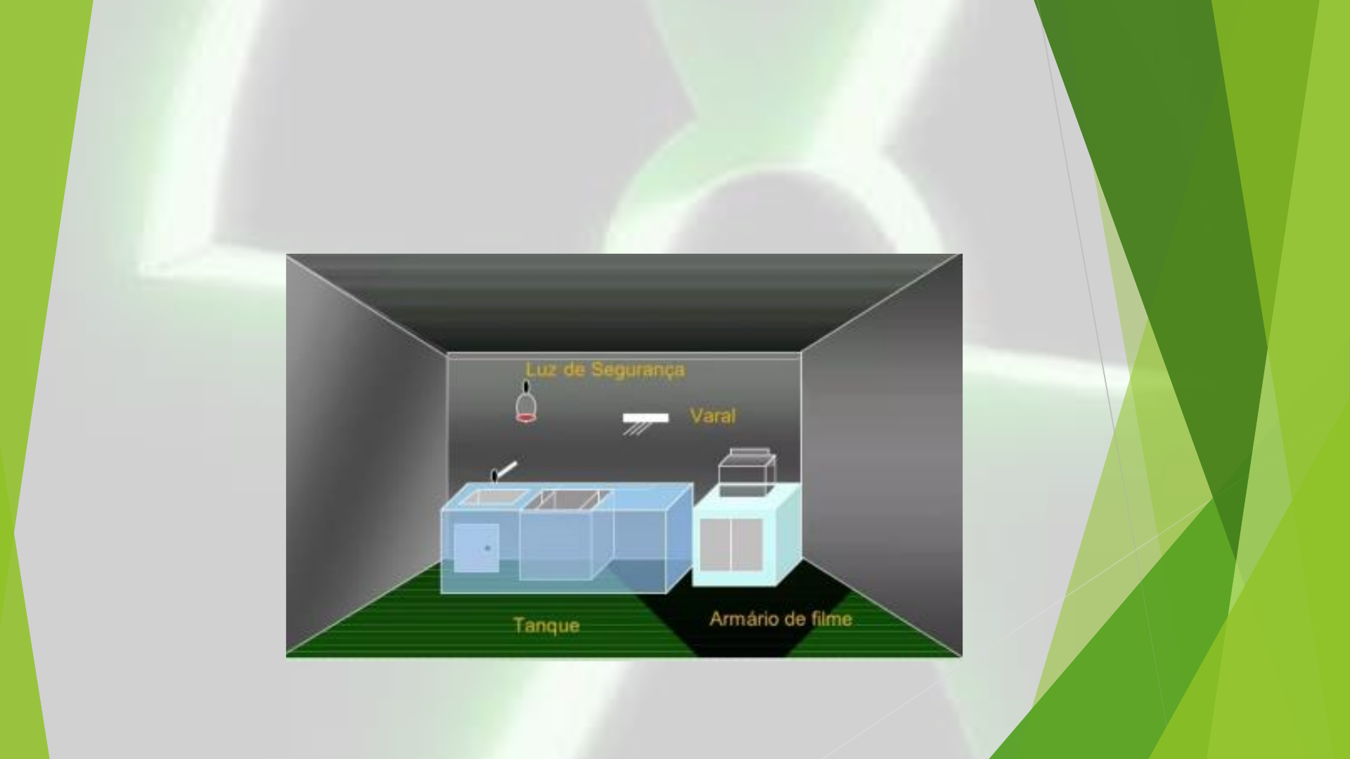 CÂMARA ESCURA A câmara escura ideal deve apresentar: Espaço amplo, a prova de luz, bem ventilado e confortável, onde devem estar dispostos os tanques para as soluções de processamento, com água corrente, exaustor (para a renovação do ar) e climatizado (em regiões frias com aquecimento e em locais muito quentes com ar refrigerado) Conter uma mesa de trabalho sempre limpa e organizada para a manipulação de filmes. Iluminação da câmara escura: LUZ BRANCA COMUM (TETO): Tem a função de fazer a iluminação geral, NÃO PODEM estar acesas no momento do processamento radiográfico e o seu interruptor deve estar em uma posição tal que não seja ligado acidentalmente. LANTERNA DE SEGURANÇA: Os filmes são extremamente sensíveis à luz comum (de cor verde e azul), mas tem menor sensibilidade à luz vermelha ou amarela. Dessa forma, é utilizada a lanterna de segurança, uma iluminação de baixa intensidade No seu interior deve ter uma lâmpada incandescente com, no máximo, 15 watts de potência, a uma distância de, no mínimo, 1.20 m do local de trabalho. Controle de Qualidade Na suspeita de que o filtro de segurança esteja inadequado, pode ser feito o seguinte teste: 1. Sobre a mesa de trabalho é aberto um filme sem exposição apenas até a metade; 2. A outra metade permanece protegida com o próprio papel da embalagem do filme; 3. O filme deve ficar de 3 a 5 minutos na câmara escura exposto apenas à luz de segurança; 4. Finalmente o filme deverá ser processado normalmente no escuro total. Controle de Qualidade Caso a porção desprotegida do filme apresentar certo grau de velamento, de cor cinza claro, quando comparada a parte que ficou protegida pelo papel, é sinal de que a luz de segurança está inadequada. Outro procedimento que pode ser realizado para verificação do aspecto de vazamento de luz em sua câmara escura pode ser realizado da seguinte maneira: Ao fechar a porta, espere por algum tempo, até seu olho se adaptar ao novo ambiente, a fim de que se possa detectar qualquer vazamento indesejado de luz, tomando as devidas providências para vedá-lo. OPERAÇÕES REALIZADAS NA CAMARA ESCURA : Colocação dos filmes virgens nos chassis; Envio dos chassis carregados para a sala de exposição; Recebimento dos chassis com os filmes expostos; Retirada dos filmes com a imagem latente dos chassis; Identificação dos filmes; Inserção dos filmes na processadora; Revelação e fixação; Manutenção dos chassis; Limpeza dos ecrans; Divisão da Câmara Escura A câmara escura se divide em duas partes: Parte seca: É o local onde se armazenam alguns acessórios radiológicos como: bancada com gaveta para filmes não expostos, caixas de filmes para reposição, “Box” de passagem (armário), etc. Parte Úmida: É o local onde são armazenados os tanques reservatórios de químicos (revelador e fixador), processadora, etc. Utensílios ou Acessórios Encontrados na Parte Seca: Bancada: Acessório de suma importância para o trabalho diário dentro da câmara escura; ela pode serem forma de armário ou cômoda, geralmente feita de madeira, devido ao baixo custo; mas também pode ser de outros materiais, como: ferro, alumínio, etc. É revestida em seu tampo superior com uma capa de borracha, para evitar a eletricidade estática Móvel chamado de “burra de filmes”, utilizado para armazenar filmes não expostos dentro da câmara escura. Termômetro: Situado na câmara escura, tem por finalidade controlar a temperatura do ambiente, pois as películas radiográficas não podem ficar em temperatura inferior a 10°C e superior a 24°C. Caso essas recomendações do fabricante não sejam respeitadas, a emulsão do filme poderá ser comprometida, alterando sua qualidade. Exaustor /ou Ventilador De acordo com as normas de segurança, toda câmara escura deverá ter exaustores ou ventiladores para dissipar os gases que são liberados pelos produtos químicos, evitando um acúmulo de gases dentro da câmara escura. Box de Passagem Serve para a transição do filme (chassi) entre a câmara escura e a sala de exames; “Box” em inglês que dizer caixa. Na maioria das vezes, essas caixas são compostas de alumínio, com abertura para ambos os lados, com duas portas de cada lado. Utensílios ou Acessórios Encontrados na Câmara Clara Bancada de reposição de chassis ALFABETO DE CHUMBO ALFABETO DE CHUMBO Com base em PVC contendo 5 (cinco) letras de cada, com trilho metálico para composição da palavra. Tamanhos: 06, 08 e 10mm de altura ou especial. Cilindro de extensão para seios da face, em latão cromado e base em aço inoxidável revestido com chumbo, adaptável a qualquer equipamento de Raios X. Observação: O tamanho da base do cone de extensão será de acordo com o colimador do aparelho onde o acessório será utilizado. DIVISORES RADIOGRÁFICOS Em chumbo laminado, com acabamento em aço inoxidável, encaixe para o chassi. O divisor radiográfico possibilita melhor aproveitamento do filme, tanto no sentido longitudinal (L) como no sentido transversal (T). Goniômetro: Régua semicircular, com uma escala de 180 graus, com um marcador deslizante em seu centro, e uma base para apoiar na mesa ou estativa. Sua função é medir estruturas anatômicas em ângulos, como crânio. GONIÔMETRO FAIXA DE COMPRESSÃO Faixa de compressão uretérica, utilizada para diminuir a espessura do abdome, usada em estudos radiológicos contrastados, como a urografia excretora. Espessômetro: Consiste em uma régua escalonada com a graduação que vai do n° 1 ao 40, medida em cm, em forma de “L” (letra L), onde a base inferior deverá permanecer encostada sobre a região em estudo, logo em seguida uma outra haste irá deslizar até a extremidade superior da área estudada, ou seja, pode-se medir estruturas em AP ou PA e PERFIL, dando a espessura da região em centímetros. Identificador Radiográfico Identificador radiográfico eletrônico, para ser utilizado na câmara escura, i