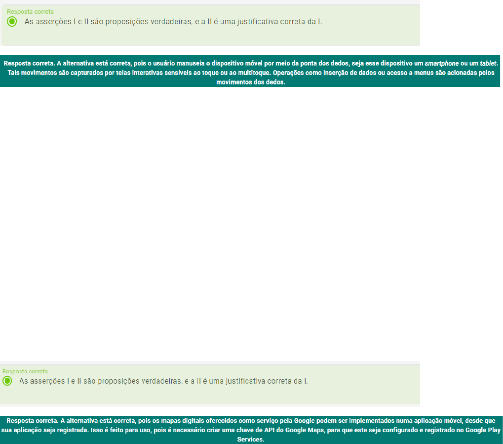 Atividade 4 – Computação para dispositivos móveis Pergunta 1: A Interação Homem Computador (IHC) é o estudo da interação entre pessoas e computadores. Estão associadas a esse estudo diversas disciplinas, como ciência da computação, ergonomia, sociologia, semiótica, dentre outras. Essa interação é realizada por meio da interface do usuário, composta por software e hardware. A partir do trecho apresentado, analise as asserções a seguir e a relação proposta entre elas. 1. As aplicações móveis são acionadas por meio do toque do usuário para a entrada de dados ou o acionamento de comando. PORQUE 1. Faz-se necessário, no desenvolvimento de aplicação para Android, o uso do toque ou multitoque, por meio dos princípios da interação homem-máquina. Assinale a alternativa correta: Pergunta 2: Mapas digitais são muitos exigidos em aplicações de determinação de rotas, principalmente em cidades com trânsito caótico. O Google Play Services permite serviços apoiam o alcance de resultados de qualidade, utilizando menos recursos, além de garantir sempre a última versão da aplicação/serviço no dispositivo. A partir do apresentado, analise as asserções a seguir e a relação proposta entre elas. 1. Para o uso do Google Maps em aplicações móveis, é necessário o registro da API da aplicação no site da Google. PORQUE 1. Uma chave de API do Google Maps é criada para configurar o Google Play Services corretamente, para que se possa usar o Google Maps na aplicação móvel. Assinale a alternativa correta: Pergunta 3: Com o avanço da chamada IoT (Internet das Coisas), os recursos disponíveis nos dispositivos móveis são utilizados no desenvolvimento de aplicações nos mais diversos domínios, como saúde, engenharia, mobilidade, dentre outros. Smartphones são dispostos de sensores de luminosidade, calor, proximidade etc. A partir do trecho apresentado, analise as asserções a seguir e a relação proposta entre elas. 1. Sensores são dispositivos implementados nos smartphones para a captura de informações que resultam em um aparelho, além de um simples equipamento de comunicação. PORQUE 1. No desenvolvimento de aplicações Android, o uso de API é necessário para permitir o acesso a sensores na criação de apps mobile inovadores. Assinale a alternativa correta: Pergunta 4: A empresa Google dispõe de um serviço para aplicações Android no qual o usuário pode manter todas as atualizações das aplicações, garantindo sempre a última versão de aplicações instaladas no dispositivo móvel. Esse serviço é conhecido como Google Play Services. Sobre aplicações móveis, analise as afirmativas a seguir e assinale (V) para a(s) verdadeira(s) e (F) para a(s) falsa(s). 1. ( ) Por meio do Google Play Services, um pacote de recursos (API) é oferecido aos desenvolvedores de apps Android. 2. ( ) Os pacotes disponibilizados pelo Google Play Services, instalados no dispositivo, podem ser executados em Android 2.1 ou superior. 3. ( ) Dentre os serviços do Google Play Services, incluem-se a autenticação dos serviços Google e o acesso às últimas configurações de privacidade do usuário. 4. ( ) O Google Play Services melhora a experiência de utilização do dispositivo do usuário, facilitando a busca sempre que houver conexão. Assinale a alternativa que apresenta a sequência correta: Pergunta 5: Hoje, no mundo digital, a leitura via smartphone ou tablet torna-se comum entre os usuários de internet. Muitas vezes, o ambiente não é adequado à leitura, o que resulta em uma adaptação do próprio dispositivo com relação, por exemplo, à luminosidade do ambiente. Esse recurso facilita que o usuário tenha um conforto no ato de ler uma informação. Nesse sentido, analise as afirmativas a seguir. 1. Os sensores de iluminação conseguem medir as forças de rotação ao longo de três eixos. 2. Os sensores de iluminação colaboram para a medição de condições do ambiente, como pressão do ar. 3. Os sensores de ambientes englobam as categorias de barômetros, fotômetros e termômetros. 4. Sensores de gravidade medem a desaceleração no movimento vertical de queda e pertencem ao grupo de sensores de ambiente. Está correto o que se afirma em: Pergunta 6: Hoje, pode-se acessar um smartphone somente pelo reconhecimento facial. Outro mecanismo muito interessante é o reconhecimento de gestos. Fotos podem ser batidas somente com o gesto da mão. Esses recursos aumentaram a eficiência de interação entre o usuário e o dispositivo/aplicação. Acerca dos sensores do Android, analise as afirmativas a seguir. 1. A interface de percepção do usuário está associada a componentes como reconhecimentos de face, gestos e voz. 2. O objetivo da Interface de Percepção do Usuário (PUI) é aumentar a eficiência e a facilidade de uso do design lógico. 3. O princípio da usabilidade é altamente adotado no design de uma aplicação por meio da PUI. 4. Dentre os componentes da PUI, os gestos são mais usados para comandos de saída de uma aplicação. Está correto o que se afirma em: Pergunta 7: O frequencímetro é um equipamento eletrônico que tem a finalidade de medir a frequência de um sinal, sendo medido em hertz (símbolo Hz) e muito usado para medir o batimento cardíaco de uma pessoa. Aplicações de saúde fazem o uso do frequencímetro para analisar o batimento cardíaco durante um exercício físico. Nesse contexto, assinale a alternativa que apresenta uma afirmação correta sobre sensores usados em App Mobile. Pergunta 8: Uma API é um recurso de programação para acessar um dispositivo externo a uma aplicação. Por exemplo, ao desenvolver uma aplicação que faça uso da câmera do dispositivo, uma API de acesso a esse recurso será usada na programação da aplicação móvel pelo desenvolvedor. A partir do trecho exposto, analise as afirmativas a seguir. 1. O pacote android.hardware.camera2 dá suporte por meio de uma interface