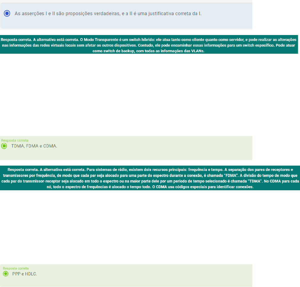 Atividade 2 – Laboratório de Redes de Computadores Pergunta 01: O VTP pode criar, modificar e excluir VLANs. Cada uma dessas ações leva ao fato de o número da revisão aumentar (cada ação aumenta o número em +1). Depois, ele envia anúncios onde o número da revisão é indicado. O protocolo VTP trabalha de 3 modos distintos para atender à demanda da rede virtual. São eles: Modo cliente, Modo Servidor e Modo Transparente. A partir do apresentado, analise as asserções a seguir e a relação proposta entre elas. I. Modo Transparente:é um switch híbrido. Ele atua tanto como cliente quanto como servidor. Porque: II. As alterações podem ser realizadas nas informações das redes virtuais locais, sem afetar os outros dispositivos, mas ele pode encaminhar essas informações para um switch específico. Pode atuar como switch de backup, com todas as informações das VLANs. A seguir, assinale a alternativa correta. Pergunta 02: O mecanismo de controle de acesso ao canal fornecido pela camada MAC também é conhecido como “protocolo de acesso múltiplo”. Esse protocolo permite que várias estações compartilhem entre si o mesmo meio de transmissão de dados ao qual estão conectadas. Exemplos de suporte físico partilhado podem ser uma rede de topologia de tipo "bus", o "anel", a rede usando os nós (hub) de uma rede sem fios e um "ponto a ponto" half-duplex conexão de rede. Assinale a alternativa que apresenta o Protocolo de Divisão do Canal. Pergunta 03: O Protocolo de Transferência de Dados tem um conjunto de convenções de interface de nível lógico que define a troca de dados entre diferentes programas. Essas convenções fornecem uma maneira consistente de enviar mensagens e manipular erros. O protocolo de sinalização é usado para controlar a conexão - por exemplo, configuração, encaminhamento ou desconexão. Nesse sentido, o acesso ponto a ponto utiliza quais protocolos? Pergunta 04: A camada de enlace tem um padrão que, de acordo com a tecnologia e o meio físico, utiliza múltiplos padrões e protocolos. Ela utiliza técnicas e processos para lidar com os dados que são repassados pela camada rede para ligar a camada de enlace com a camada física. Quais os dois tipos de acesso ao meio através da camada de enlace? Pergunta 05: Leia o texto a seguir. A camada de enlace fornece criação, transmissão e recepção de quadros de dados. Essa camada atende às solicitações de uma camada superior (de rede); o serviço da camada física é usado para receber e transmitir pacotes, tendo a função de detectar e corrigir erros que vêm da camada física; além disso, ela responde por transmissão, controle e ordenamento dos dados ou pacotes e seu fluxo dentro do meio de transmissão. De acordo com o texto, quais tipos de acesso a camada de enlace faz com a camada física? Pergunta 06: A criação de redes de transmissão de dados altamente confiáveis com distribuição eficiente do tráfego de rede envolve o uso de equipamentos periféricos de comutação e de periféricos avançados que atendam a todos os requisitos técnicos, tendo um orçamento dedicado. Nesse sentido, em relação ao switch, assinale a alternativa correta que indica suas características. Pergunta 07: No campo da comutação dos dados pela camada de enlace, temos uma técnica que multiplexa os dados e os encaminha em vários pedaços de dados, com origem, destino e endereços intermediários. Durante o caminho dos dados, e nesse meio de comunicação, vários computadores podem encaminhar pacotes ao mesmo tempo. Analise as afirmativas a seguir. I - Comutação de Pacotes II - Comutação de Circuito III - Comutação de Textos IV - Comutação de Mensagem Qual(is) comutação(ões) se referem à técnica que transfere dados pelo canal? Pergunta 08: O nível do canal de dados procura fazer uma escolha entre as partes que reivindicam acesso ao meio ambiente, sem prestar atenção ao seu destino final. Na comutação dos dados, é a forma como informações são encaminhadas de/para os destinos. Existe uma técnica usada para envio dos dados pelo canal: ela solicita acesso ao meio físico, o canal é reservado, a mensagem é transmitida e o canal é fechado, como se fosse uma ligação telefônica. Qual tipo de comutação é essa? Pergunta 09: Uma rede local (LAN) é uma conexão de dispositivos dentro de uma área específica. Cada dispositivo é chamado de “host” e está conectado ao servidor. Porém, essa rede apresenta problemas devido ao excesso de broadcast em uma mesma área. Umas das soluções é utilizar a rede VLAN para melhorar a comunicação e difusão dos dados. Assinale a alternativa que mostra uma melhoria da rede VLAN em relação à rede LAN. Pergunta 10: A camada de enlace utiliza técnicas e processos para lidar com os dados que são repassados pela camada rede. Ela tem a camada de link de dados e a função de detectar e corrigir erros que vêm da camada física; além disso, ela responde por transmissão, controle e ordenamento de dados ou pacotes e seu fluxo dentro do meio de transmissão. Com base no apresentado, analise as afirmações a seguir e a relação proposta entre elas. I. A comutação dos dados é a forma como as informações são encaminhadas de diversas maneiras para vários destinos. Porque: II. A comutação é composta por três técnicas: comutação de circuitos, comutação de pacotes e comutação mensagem. A seguir, assinale a alternativa correta.