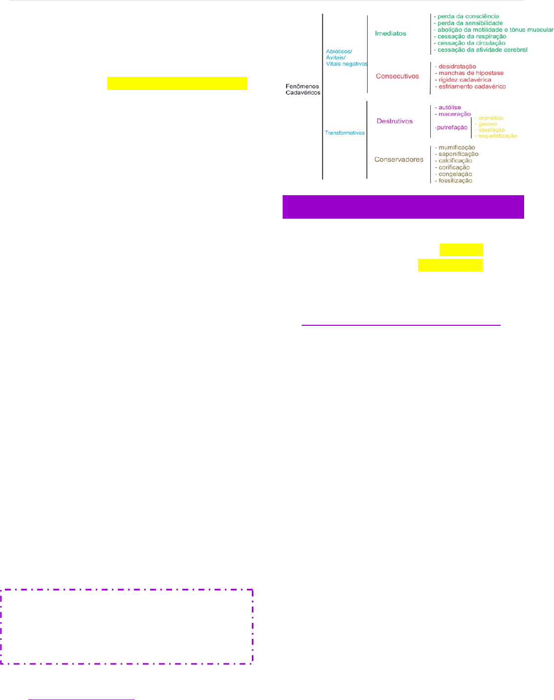 B i a n c a N a c i f f – M E D T 1 | 1 MEDICINA LEGAL Tanatologia Forense 2 A morte conceitua-se, dentro dos padrões tradicionais, como a cessação dos fenômenos vitais, pela parada das funções cerebral, respiratória e circulatória. No entanto, estas funções não cessam todas de uma vez, resultando daí uma certa dificuldade para se determinar com precisão o exato momento da morte. Não há um sinal de certeza até surgirem os fenômenos transformativos no cadáver, porque, na realidade, a morte não é um momento ou um instante, mas um processo gradativo que não se sabe quando se inicia ou quando termina. Quanto mais distante for admitida a morte, é claro, mais fácil é o seu diagnóstico. Alguns autores consideram que nesta evolução para a morte definitiva há algumas fases assim consideradas: (a) morte aparente – caracterizada pela suspensão aparente de algumas funções vitais; (b) morte relativa – assinalada pela abolição efetiva e duradoura de algumas funções vitais, sendo possível a recuperação de algumas delas; (c) morte intermediária – apontada pela suspensão de algumas atividades vitais, não sendo possível recuperá-las; (d) morte absoluta – caracterizada pela suspensão total e definitiva de todas as atividades vitais. Para se constatar a certeza da morte, é necessária a observação cuidadosa dos fenômenos que surgem no corpo humano a partir do momento da morte, representados por mudanças física, química ou estrutural, de origem natural ou artificial.  CRONOTANATOGNOSE:  CLASSIFICAÇÃO: Fenômenos abióticos Os fenômenos abióticos, também chamados de avitais ou vitais negativos, se dividem em: imediatos (devidos à cessação das funções vitais) e consecutivos (devidos à instalação dos fenômenos cadavéricos, de ordem química, física e estrutural).  Fenômenos abióticos imediatos ou recentes: Alguns desses sinais isoladamente não têm valor absoluto, tais como os descritos a seguir.  Perda da consciência.  Perda da sensibilidade. Com a morte, surge a cessação da sensibilidade geral e especial. Estão abolidas as sensações táteis, térmicas e dolorosas. Uma das manobras apontadas para pesquisar a sensação dolorosa é o pinçamento do mamelão, constituindo-se no sinal de Josat. A sensibilidade especial poderá ser observada nas mucosas com o uso de amoníaco ou excitação da mucosa nasal.  Abolição da motilidade e do tônus muscular. Este fenômeno poderá ser comprovado pelo sinal de Rebouillat, que consiste em injetar 1 ml de éter na face externa da coxa, e, para melhor apreciação, junta-se a esta substância um pouco de ácido pícrico. Quando estamos diante de um caso de morte real, o éter é expelido pelo orifício produzido pela agulha, e, caso contrário, será absorvido pelo tecido. Outra finalidade dessa prova é o estímulo doloroso gerado pelo éter, produzindo reação no indivíduo aparentemente morto. TANATOGNOSE: estudo dos fenômenos cadavéricos CRONOTANATOGNOSE: tempo compreendido entre a morte e o exame cadavérico (através da avaliação dos fenômenos cadavéricos) B i a n c a N a c i f f – M E D T 1 | 2 MEDICINA LEGAL A ausência da contração muscular indica morte real (sinal de Roger e Beis). A face hipocrática é observada também pela abolição da motilidade e do tônus muscular. Preferimos chamar máscara da morte.  Cessação da respiração. A abolição da respiração pode ser evidenciada pela ausculta pulmonar com ausência dos murmúrios vesiculares Prova de Winslow: chama da vela  Cessação da circulação. Na prática, é sinal fácil e de grande valor. A ausculta do coração (sinal de Bouchut), a radioscopia do coração (sinal de Piga Pascual) e a eletrocardiografia com ou sem ativação adrenalínica (prova de Guérin e Frache). Surgem no globo ocular várias modificações determinadas pela parada da circulação, como o esvaziamento da artéria central da retina, a interrupção da coluna sanguínea das veias retinianas, o descoramento da coróide e, finalmente, a oftalmoscopia, denunciando a parada da circulação da rede superficial da retina.  Cessação de atividade cerebral. Hoje, devido à aceitação do conceito de morte encefálica, o registro da atividade diencefálica tem uma certa importância na conclusão do diagnóstico de morte.  Fenômenos abióticos consecutivos ou mediatos:  Desidratação cadavérica. • Decréscimo de peso: a evaporação da água dos tecidos orgânicos após a morte leva consequentemente, à diminuição de peso • Pergaminhamento da pele: Por efeito da evaporação tegumentar, a pele se desseca, endurece e torna-se sonora à percussão, tomando um aspecto de pergaminho. • Dessecamento das mucosas dos lábios. • Modificação dos globos oculares: a desidratação manifesta nos olhos certos fenômenos que devem ser conhecidos, como, por exemplo, a formação da tela viscosa, a perda da tensão do globo ocular, o enrugamento da córnea, a mancha negra da esclerótica e a turvação da córnea transparente. A mancha da esclerótica ou livor sclerotinae nigrencens, igualmente conhecida por sinal de Sommer e Larcher, é explicada pela dessecação da esclerótica, mostrando, no quadrante externo ou interno do olho, uma mancha de cor enegrecida pela transparência do pigmento coroidiano. Assume forma circular ou oval e, mais raramente, triangular com a base voltada para a córnea. A córnea, algumas horas depois da morte, perde sua transparência e se torna turva.  Esfriamento cadavérico (algor mortis). Com a morte e a consequente falência do sistema termorregulador, a tendência do corpo é equilibrar sua temperatura com o meio ambiente. Embora esse esfriamento seja progressivo, não se observa sempre uma uniformidade rigorosamente precisa. Ele começa pelos pés, mãos e face. Os órgãos internos mantêm-se aquecidos por 24 h em média. O estudo do esfriamento cadavérico é de grande importância na determinação 