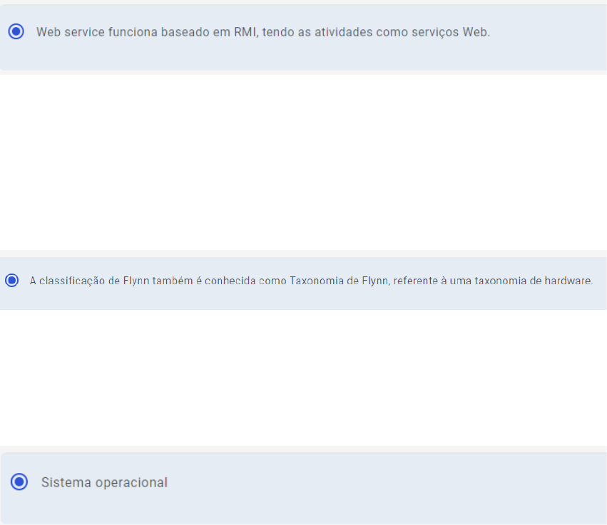 Prova N2 - SISTEMAS DISTRIBUÍDOS Pergunta 01: O Web Service disponível aos usuários permite que diferentes aplicações interajam entre si, ou seja, viabiliza a interação de uma série de funções, serviços ou atividades coordenadas; graças ao seu estilo arquitetural, que, por definição, deve ser orientado a serviços, conhecido como SOA ou Service-Oriented Architecture. Nesse sentido, assinale a alternativa que contenha informação correta a respeito do Web Service. Pergunta 02: Diante da imensa variedade de classe de computadores podemos citar a classificação por meio de arquiteturas, nas quais podemos destacar a classificação de Flynn, usada na arquitetura e definição de funcionalidades de processadores modernos como SISD, SIMD, MISD e MIMD. Assinale a alternativa que contenha afirmações verdadeiras sobre a classificação de Flynn: Pergunta 03: Esse sistema é o responsável pela gestão e organização dos processos, os quais são organizados individualmente respeitando três conjuntos informativos: o conjunto da identificação do processo, o conjunto das quotas de recursos e o conjunto das threads. Assinale a alternativa corresponde ao sistema citado no texto Pergunta 04: A distribuição no processamento e descentralização no mainframe são pilares da computação para os sistemas distribuídos, ou seja, esse tipo de sistema apresenta diversos componentes localizados em máquinas interligadas em rede, possibilitando a comunicação e a coordenação entre elas por meio de troca de mensagens. Sistemas referentes aos clusters (computadores cuja comunicação é feita a partir de uma rede local) e grids (associações de hardware, softwares e outras tecnologias); sistemas transacionais, os quais fazem uso de chamada remota; e sistemas os quais se referem a sistemas instáveis como rede de sensores - são tipos de sistemas de classe em sistemas distribuídos. Assinale a alternativa com a sequência correta a respeito da classificação de sistemas distribuídos citados no texto. Pergunta 05: Os algoritmos podem ser usados para correção do tempo, ou seja, sincronicidade de relógios lógicos, aumentando, quando necessário,1 ciclo de clock após a mensagem chegar ao destinatário, que por sua vez tem um tempo anterior ao da mensagem. Fundamentalmente, o Algoritmo de Lamport parte do conceito happens- before.;. Sobre o algoritmo de Lamport, assinale a alternativa que contém informações corretas: Pergunta 06: A arquitetura de uma chamada remota de procedimento determinará o curso da comunicação e os elementos mais importantes que a compõe, ou seja, é a partir dela que será conhecida o meio de comunicação e seus componentes. Para isso, esse modelo seguirá alguns passos. Sobre os passos da arquitetura de uma chamada remota de procedimento, analise as afirmativas a seguir: 1. A mensagem é gerada e emitida fora da máquina até seu destino. 2. A camada externa da rede é a responsável pela entrega da mensagem, de acordo com o IP. 3. Conversão, empacotamento e envio pela rede são alguns passos seguidos pela resposta do servidor. 4. A mensagem mantém seu código inicial e chega ao setor de requisição. Está correto o que se afirma em: Pergunta 07: Como vimos, em uma arquitetura peer-to-peer, os usuários são dependentes e estão dispostos em redes, os quais podem contribuir para o sistema; desde que sigam alguns protocolos/ regras de comunicação pré estabelecidos; desse modo podemos afirmar que essa arquitetura é mais indicada para a o armazenamento de objetos tidos como imutáveis. Assinale a alternativa que apresenta uma verdade sobre a arquitetura peer-to-peer: Pergunta 08: Vimos que a infraestrutura, os componentes e os serviços podem ser dispostos em diagramas ou esquemas, os quais indicam de forma clara as ações, tarefas ou requisições de uma arquitetura em serviço, a qual será representada por camadas, classes ou categorias. Sobre a arquitetura baseada em camadas, analise as asserções a seguir e a relação proposta entre elas. I. Em um diagrama representando as camadas de infraestrutura como base, de componentes como camada comunicadora e de serviços como camada externa, teremos que o fluxo é livre, pois as camadas inferiores podem se conectar diretamente com as camadas superiores. PORQUE II. As camadas se comunicam independentemente entre si. A seguir, assinale a alternativa correta. Pergunta 09: O modelo de chamada remota de procedimento utiliza uma thread como controladora de dois processos envolvendo um invocador e um servidor. De modo que o invocador enviará mensagens para o processo servidor e autobloqueia uma possível resposta. É a mensagem emitida pelo invocador que carrega as coordenadas procedimentais, enquanto a mensagem de resposta enviará as determinações a respeito da execução do sistema. Nesse sentido, assinale a alternativa que indique qual é verídica sobre a chamada remota de procedimento: Pergunta 10: O protocolo SOAP é rígido e determina princípios restritos na transação de mensagens tanto entre computadores como em serviços; além de fazer uso do protocolo HTTP representativo das mensagens enviadas e recebidas. O SOAP é um protocolo efetivado em diversas linguagens, as quais necessitam apenas de elementos essenciais para sua execução. Assinale a alternativa com informação correta a respeito do protocolo SOAP.
