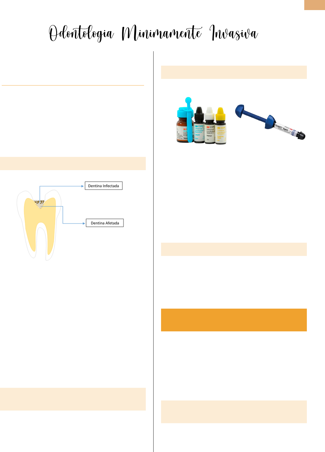 1 João Victor -S7 – Clínica Infantil I A OMI se baseia em uma filosofia conservadora, de primeiro paralisar a doença e depois restaurar a estrutura e função perdidas. PARÂMETROS DE ATUAÇÃO DA OMI: → Educação em saúde (uso de escova, pasta e fio dental, instrução de higiene oral, contexto alimentar); → Diagnóstico de cárie (clinico e radiográfico); → Remoção seletiva da cárie; → Preservação da estrutura dental; REMOÇÃO SELETIVA DA CÁRIE • Dentina infectada (amolecido, úmido, colágeno degradado, com pouco ou nenhum potencial de remineralização); • Dentina afetada (camada mais profunda, tecido mais endurecido e seco, cujo a trama de colágeno se encontra intacta, passível de remineralização; • Remoção de todo o tecido cariado amolecido, com curetas manuais até o momento em que o tecido começar a sair sem lascas ou escamas; • Paredes laterais: remoção completa – garantir selamento da cavidade; OBJETIVOS DE RESTAURAR NA CLÍNICA INFANTIL • Reparar ou limitar os danos da cárie; • Proteger e preservar as estruturas dentárias; • Função e estética; • Boa higiene oral; • Manter a vitalidade pulpar; MATERIAIS RESTAURADORES • Cimento de ionômero de vidro convencional; Tipo 1- cimentação / Tipo 2- restauração / Tipo 3- forramento e selamento; • CIV modificado por resina; • Resina composta; • Amálgama; • Coroa de aço; QUAL MATERIAL ESCOLHER? • Resistência do material; • Localização do dente; • Higiene bucal do paciente; • Risco à carie; • Restabelecimento de função; CARACTERÍSTICAS CLÍNICAS DOS DENTES DECÍDUOS → Molares decíduos: distância M.D > altura; → Incisivos decíduos: distancia MD < cérvico- incisal; → Os molares decíduos apresentam um colo mais estreito que os permanentes; → Esmalte permanente mais calcificado que decíduo; PROCEDIMENTO RESTAURADOR (DENTE ANTERIOR) • Restabelecer função, mastigação e estética; • Boa adesividade, retenção e resistência (característica do material restaurador); 2 João Victor -S7 – Clínica Infantil I • Protocolo restaurador com resina composta: 1. Escolha da resina e cor; (antes de isolar) !!!!! 2. Anestesia; 3. Isolamento absoluto; 4. Remoção de tecido cariado; 5. Preparo cavitário/ bisel: • Aumenta a área de esmalte no ângulo cavo-superficial. • Proporciona uma melhor estética. • A extensão deve ser de 0.5mm do limite do esmalte sadio; • Apenas no vestibular. 6. Ataque ácido; 7. Sistema adesivo; 8. Resina em incrementos; 9. Acabamento; 10. Polimento; 11. Avaliar oclusão; INDICAÇÕES DO CIV • Selamento de cicatrículas e fissuras; • Classe I conservativas; • Classe II tipo túnel e slot horizontal; • Classe III e V- cariosas; • Classe V- erosão e abrasão; • Restaurações laminadas ou mistas; • Material de proteção (forramento); • Restauração de dentes decíduos; • Núcleos de preenchimento. • Cimentação de coroas e próteses fixas; • Cimentação de bandas e colagem de acessórios ortodônticos; • ART – restaurações atraumáticas; • Obturação de perfurações; PROPRIEDADES POSITIVAS DO CIV → Liberação de flúor; → Adesividade; → Coeficiente de expansão térmica; → Compatibilidade biológica; PROPRIEDADES NEGATIVAS → Resistência à compressão e à tração; → Estética e solubilidade; CIV CONVENCIONAL CIV MODIFICADO POR RESINA → Adesão química > no esmalte que na dentina; → Reservatório de flúor; → Podendo haver recarga com aplicação de flúor; → Coeficiente térmica de expansão variável; → Usar o bloquinho de papel; → Manipulação – aglutinação; → Parte do líquido é substituído por monômeros metacrílicos solúveis na água; → Pó- tem fotoiniciadores e partículas de carga não reativas. → Tempo de trabalho >; → Aumenta a resistência; → Diminui a solubilidade; RIVA CÁPSULA TRATAMENTO RESTAURADOR ATRAUMÁTICO → Método de remoção de tecido cariado através da escavação da dentina infectada, apenas com instrumentais manuais cortantes, sob isolamento relativo; → Sem anestesia; → Realizado após a limpeza da cavidade seu preenchimento com um material adesivo e liberador de flúor (CIV); 3 João Victor -S7 – Clínica Infantil I CRITÉRIOS A SEREM CONSIDERADOS → Risco à cárie do paciente. → Consigo fazer o isolamento absoluto? → Dente decíduo ou permanente. → Situação da coroa do dente. (recém erupcionada / semi-inclusa / muito destruída), → Tempo do dente na boca. → Profundidade da cavidade / proximidade pulpar. (profundidade da cavidade/ dente decíduo; Profundidade da cavidade / dente permanente); → E a estética? SELANTES DE FÓSSULAS E FISSURAS • Indicação: risco a carie e histórico de cárie • Observar higiene oral • Molares (1º molar) após a erupção • Dentes que propiciem maior acúmulo de biofilme. • Lesões incipiente em esmalte. • Escolher tipo de selante mais apropriado para um paciente especifico e o cenário clinico. • Alto risco ou próximo ao tecido gengival (ainda em erupção): Selante ionomêrico.