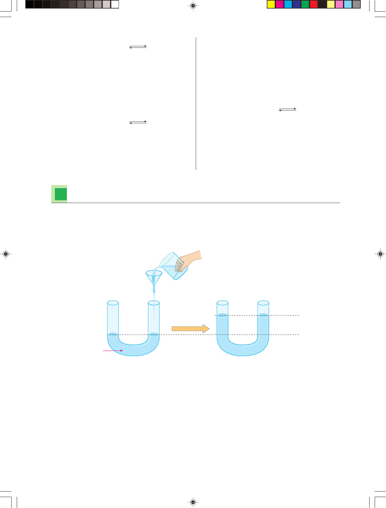 R ep ro du çã o pr oi bi da .A rt .1 84 do C ód ig o P en al e Le i 9 .6 10 de 19 de fe ve re iro de 19 98 . 201Capítulo 5 • EQUILÍBRIOS QUÍMICOS HOMOGÊNEOS 2 DESLOCAMENTO DO EQUILÍBRIO 2.1. Introdução Equilíbrios, desequilíbrios e reequilíbrios ocorrem freqüentemente em fenômenos físicos, químicos e biológicos. Um exemplo dessas variações de equilíbrio pode ser dado por um sistema de vasos comunicantes contendo água: 50 (UFPE) Para a reação 3 H2 (g) " N2 (g) 2 NH3 (g) as pressões parciais de H2 e N2 no equilíbrio são, respec- tivamente, 0,400 e 0,800 atm. A pressão total do sistema é 2,80 atm. Qual é o valor de Kp quando as concentra- ções são dadas em atmosferas? a) 1,00 c) 5,00 e) 153,0 b) 3,13 d) 50,0 Sugestão: Lembre-se de que a soma das pressões parciais é igual à pressão total do sistema. 51 (UFF-RJ) Sabe-se que a amônia é produzida por meio da seguinte reação em fase gasosa: 3 H2 (g) " N2 (g) 2 NH3 (g) Considere, para essa reação, Kp % 6,5 $ 10 #3 atm#2 a 450 °C e ∆H0 % #91,8 kJ " mol#1. a) Determine a quantidade de calor liberada ao se pro- duzirem 907,0 kg de amônia segundo tal reação. b) Calcule o valor da pressão parcial do N2 (g) quando as pressões parciais do NH3 (g) e H2 (g) forem, respecti- vamente, 60,0 atm e 150,0 atm. 52 (PUC-SP) A reação entre o gás nitrogênio (N2) e o gás hidrogênio (H2) produz o gás amônia (NH3). Em um reci- piente fechado de 10 L, a 800 K, foram colocados 5 mol de N2 e 20 mol de H2. Considerando que o rendimento dessa reação nessas con- dições é de 40% e que não houve variação de temperatu- ra, a relação entre a pressão final e a inicial do sistema é: a) p f % 0,84 pi c) p f % 1,19 pi e) p f % 0,6 pi b) p f % pi d) p f % 0,4 pi 53 (Unicap-PE) Suponha a síntese a seguir: A (g) " B (g) AB (g) Se as pressões iniciais de A (g) e B (g) forem, respectiva- mente, 3 atm e 2 atm, a pressão total, no equilíbrio, será 4,2 atm. Nas condições indicadas, identifique as alterna- tivas corretas. a) A reação não pode atingir o equilíbrio. b) A pressão de A (g), no equilíbrio, será 2,2 atm. c) A pressão de AB (g), no equilíbrio, será 2,2 atm. d) O grau de dissociação será 40%, em relação a B. e) A pressão de B (g), no equilíbrio, será 0,8 atm. Estado inicial de equilíbrio Estado final com um novo equilíbrio Água Após a adição de mais água Nível final Nível inicial No estado inicial, a água está em equilíbrio (parada), apresentando-se em um certo nível; adicionan- do-se uma nova porção de água, o equilíbrio inicial é perturbado; após esse desequilíbrio momentâneo, a água se desloca e atinge um novo estado de equilíbrio, em um nível final mais alto que o inicial. Nas reações químicas acontecem fatos semelhantes. Vimos, no item anterior, que toda reação reversível tende para um estado de equilíbrio. Atingido o equilíbrio, as velocidades das reações direta e inversa permanecem iguais; em conseqüência, a reação química fica como se tivesse parado e as quantidades de reagentes e produtos não mais se alteram. Em outras palavras, a partir do instante de equilíbrio, o rendimento da reação permanece fixo. É muito importante aprendermos como seria possível perturbar um equilíbrio, aumentando a velo- cidade de uma de suas reações. Assim, por exemplo, se conseguirmos aumentar a velocidade da reação direta iremos, sem dúvida, aumentar o rendimento da reação, o que é muito importante, do Capitulo 05C-QF2-PNLEM 4/6/05, 17:10201 R ep ro du çã o pr oi bi da .A rt .1 84 do C ód ig o P en al e Le i9 .6 10 de 19 de fe ve re iro de 19 98 . 202 ponto de vista econômico, principalmente para as reações industriais. Esse “truque” é denominado deslocamento do equilíbrio. Sendo assim, podemos dizer que: Deslocamento do equilíbrio é toda e qualquer alteração da velocidade da reação direta ou da reação inversa, provocando modificações nas concentrações das substâncias e levando o sistema a um novo estado de equilíbrio. Quando a velocidade da reação direta aumenta (A " B C " D), dizemos que o equi- líbrio está se deslocando para a direita; pelo contrário, quando aumenta a velocidade da reação inversa (A " B C " D), dizemos que o equilíbrio está se deslocando para a esquerda. Os dois acontecimentos são porém passageiros, pois o sistema sempre caminhará para um novo equilíbrio. Os fatores externos que podem deslocar um equilíbrio químico são: • alteração das concentrações de um ou mais participantes do equilíbrio; • alteração da pressão total sobre o sistema; • alteração da temperatura do sistema. Vamos estudar, a seguir, a ação de cada um desses fatores, antecipando que o deslocamento do equilíbrio acaba sempre obedecendo a uma idéia geral e bastante simples — o princípio de Le Chatelier —, cujo enunciado é: Quando um fator externo age sobre um sistema em equilíbrio, este se desloca, procu- rando minimizar a ação do fator aplicado. 2.2. Influência das concentrações dos participantes do equilíbrio Vamos considerar, por exemplo, a seguinte reação reversível: CH3COOH (l) " C2H5OH (l) CH3COOC2H5 (l) " H2O (l) Agora acompanhe, passo a passo, as explicações seguintes com a seqüên- cia de figuras ao lado. Comprova-se experimentalmente que, misturando-se 1 mol de ácido acético e 1 mol de álcool etílico (quantidades iniciais) e mantendo-se a mistura em ebulição por várias horas, a reação chega a um estado de equilíbrio no qual estarão presentes as seguintes quantidades (quantidades finais): 0,333 mol de ácido acético 0,333 mol de álcool etílico " 0,666 mol de acetato de etila 0,666 mol de água " Nesse caso, podemos dizer que o rendimento da reação foi de 0,666 mol (ou 66,6%) de acetato de etila. A partir desse instante, as concentrações dos participantes permanecerão constantes (se a temperatura não mudar). Vamos então calcular o valor da constante Kc d
