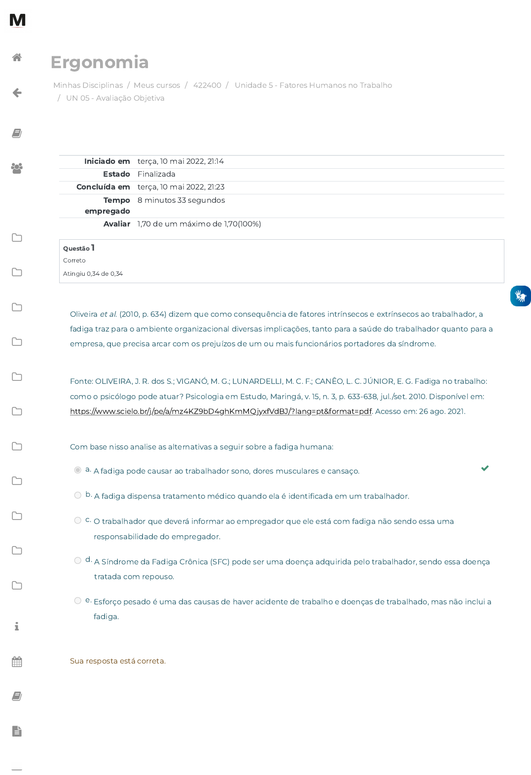 Minhas Disciplinas / Meus cursos / 422400 / Unidade 5 - Fatores Humanos no Trabalho / UN 05 - Avaliação Objetiva Ergonomia Iniciado em terça, 10 mai 2022, 21:14 Estado Finalizada Concluída em terça, 10 mai 2022, 21:23 Tempo empregado 8 minutos 33 segundos Avaliar 1,70 de um máximo de 1,70(100%) Questão 1 Correto Atingiu 0,34 de 0,34 Oliveira et al. (2010, p. 634) dizem que como consequência de fatores intrínsecos e extrínsecos ao trabalhador, a fadiga traz para o ambiente organizacional diversas implicações, tanto para a saúde do trabalhador quanto para a empresa, que precisa arcar com os prejuízos de um ou mais funcionários portadores da síndrome. Fonte: OLIVEIRA, J. R. dos S.; VIGANÓ, M. G.; LUNARDELLI, M. C. F.; CANÊO, L. C. JÚNIOR, E. G. Fadiga no trabalho: como o psicólogo pode atuar? Psicologia em Estudo, Maringá, v. 15, n. 3, p. 633-638, jul. /set. 2010. Disponível em: https://www.scielo.br/j/pe/a/mz4KZ9bD4ghKmMQjyxfVdBJ/?lang=pt&format=pdf. Acesso em: 26 ago. 2021. Com base nisso analise as alternativas a seguir sobre a fadiga humana: a. A fadiga pode causar ao trabalhador sono, dores musculares e cansaço. b. A fadiga dispensa tratamento médico quando ela é identi�cada em um trabalhador. c. O trabalhador que deverá informar ao empregador que ele está com fadiga não sendo essa uma responsabilidade do empregador. d. A Síndrome da Fadiga Crônica (SFC) pode ser uma doença adquirida pelo trabalhador, sendo essa doença tratada com repouso. e. Esforço pesado é uma das causas de haver acidente de trabalho e doenças de trabalhado, mas não inclui a fadiga. Sua resposta está correta. https://avap.multivix.edu.br/my/ https://avap.multivix.edu.br/course/view.php?id=14048 https://avap.multivix.edu.br/course/view.php?id=14048§ion=6 https://avap.multivix.edu.br/mod/quiz/view.php?id=1029067 https://www.scielo.br/j/pe/a/mz4KZ9bD4ghKmMQjyxfVdBJ/?lang=pt&format=pdf https://avap.multivix.edu.br/my/ https://avap.multivix.edu.br/course/view.php?id=14048 https://avap.multivix.edu.br/user/index.php?id=14048 https://avap.multivix.edu.br/course/view.php?id=14048§ion=1 https://avap.multivix.edu.br/course/view.php?id=14048§ion=2 https://avap.multivix.edu.br/course/view.php?id=14048§ion=3 https://avap.multivix.edu.br/course/view.php?id=14048§ion=4 https://avap.multivix.edu.br/course/view.php?id=14048§ion=5 https://avap.multivix.edu.br/course/view.php?id=14048§ion=6 https://avap.multivix.edu.br/course/view.php?id=14048§ion=7 https://avap.multivix.edu.br/course/view.php?id=14048§ion=8 https://avap.multivix.edu.br/course/view.php?id=14048§ion=9 https://avap.multivix.edu.br/course/view.php?id=14048§ion=10 https://avap.multivix.edu.br/course/view.php?id=14048§ion=11 https://avap.multivix.edu.br/mod/page/view.php?id=1252%2F%22%20target%3D%22_blank https://avap.multivix.edu.br/calendar/view.php/ https://avap.multivix.edu.br/local/staticpage/view.php?page=biblioteca https://portalweb.multivix.edu.br/gabaritos/login.aspx https://multivix.edu.br/office-365/ https://avap.multivix.edu.br/ Questão 2 Correto Atingiu 0,34 de 0,34 De acordo com Hirschle e Gondim (2020, p. 2732) dizem que os principais preditores de mal-estar, tensão, estresse psicológico e outros transtornos físicos e psicológicos foram: os fatores de riscos psicossociais no trabalho, ou seja, características e condições do trabalho que funcionam como estressores, e dentre esses ressaltam-se as tarefas ilegítimas, o estresse de ameaça, a pressão de tempo e prazos, a sobrecarga de trabalho, e as altas demandas e baixos recursos. Fonte: HIRSCHLE, A. L. T.; GONDIM, S. M. G. Estresse e bem-estar no trabalho: uma revisão de literatura. Ciência & Saúde Coletiva. v. 25, n. 7, p. 2721-2736, 2020. Disponível em: https://www.scielosp.org/pdf/csc/2020.v25n7/2721-2736/pt. Acesso em: 26 ago. 2021. Com base nisso analise as alternativas a seguir sobre o estresse e bem-estar no trabalho: Escolha uma opção: O trabalhador deverá ter uma vida saudável fora do ambiente para que não tenha estresse, independentemente de problemas em seu trabalho. A obtenção de estresse pelo trabalhador depende de como está a relação homem-ambiente-sistema. Tendo uma boa relação entre homem- ambiente-sistema, haverá bem-estar do trabalhador. O estresse está relacionado somente com o trabalho, não tendo relação com a vida pessoal do trabalhador. O bem-estar do trabalhador não evita o estresse no ambiente de trabalho. Em um ambiente confortável e que promova o bem-estar aos trabalhadores a possibilidade de ter trabalhadores estressados é maior. Sua resposta está correta. Havendo bem-estar entre homem-ambiente-sistema o trabalhador se sentirá satisfeito e terá menos possibilidade de ter estresse. https://www.scielosp.org/pdf/csc/2020.v25n7/2721-2736/pt https://avap.multivix.edu.br/my/ https://avap.multivix.edu.br/course/view.php?id=14048 https://avap.multivix.edu.br/user/index.php?id=14048 https://avap.multivix.edu.br/course/view.php?id=14048§ion=1 https://avap.multivix.edu.br/course/view.php?id=14048§ion=2 https://avap.multivix.edu.br/course/view.php?id=14048§ion=3 https://avap.multivix.edu.br/course/view.php?id=14048§ion=4 https://avap.multivix.edu.br/course/view.php?id=14048§ion=5 https://avap.multivix.edu.br/course/view.php?id=14048§ion=6 https://avap.multivix.edu.br/course/view.php?id=14048§ion=7 https://avap.multivix.edu.br/course/view.php?id=14048§ion=8 https://avap.multivix.edu.br/course/view.php?id=14048§ion=9 https://avap.multivix.edu.br/course/view.php?id=14048§ion=10 https://avap.multivix.edu.br/course/view.php?id=14048§ion=11 https://avap.multivix.edu.br/mod/page/view.php?id=1252%2F%22%20target%3D%22_blank https://avap.multivix.edu.br/calendar/view.php/ https://avap.multivix.edu.br/local/staticpage/view.php?page=biblioteca https://portalweb.multivix.edu.br/gabaritos/login.aspx https://multivix.edu.br/office-365/ https://avap.multivix.edu.br/ Questão 3 Correto Atingiu 0,34 de 0,34 Segundo