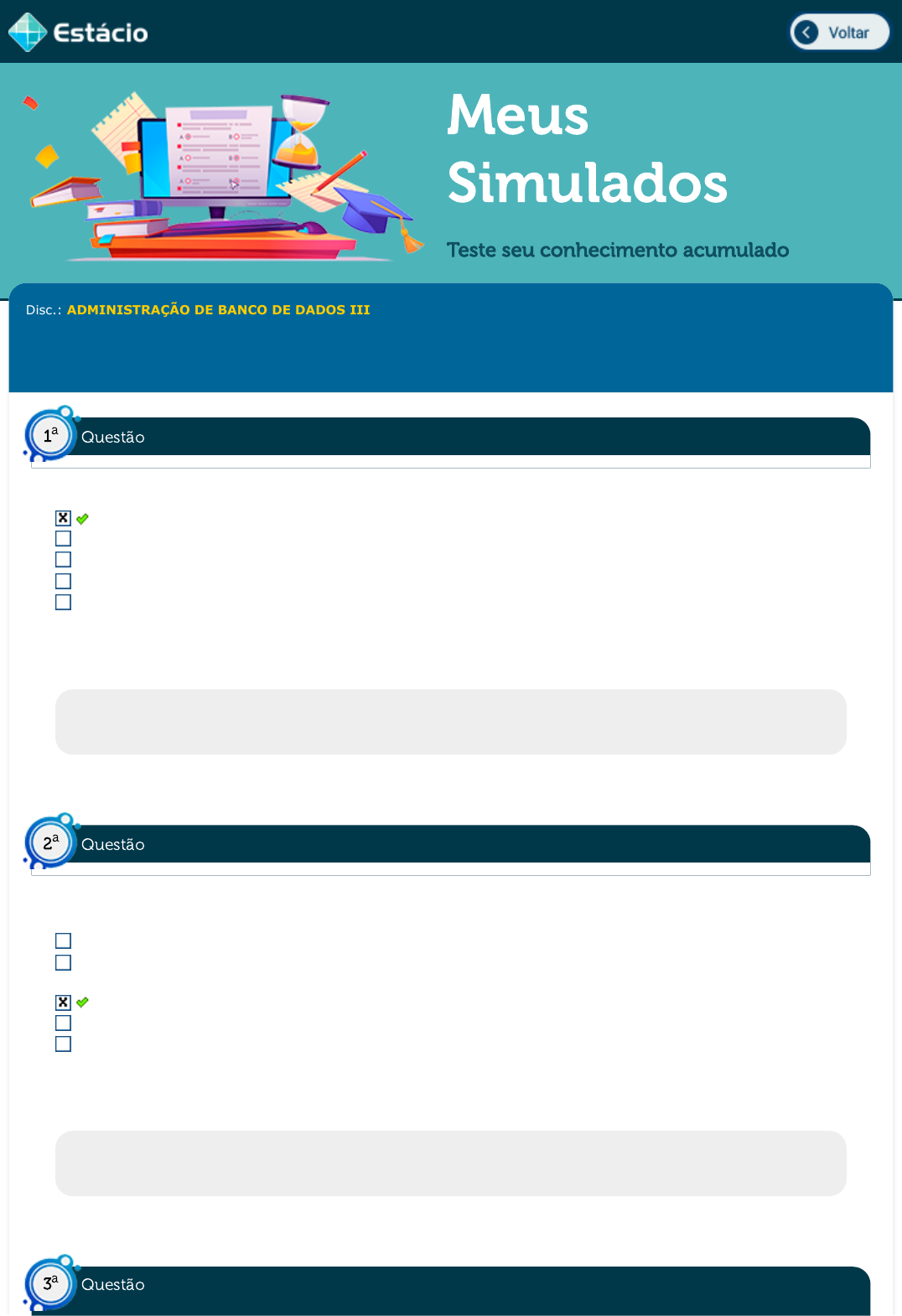 Meus Simulados Teste seu conhecimento acumulado Disc.: ADMINISTRAÇÃO DE BANCO DE DADOS III Aluno(a): VALEIRO ANTONIO DE FIGUEIREDO 202104489064 Acertos: 7,0 de 10,0 20/12/2022 Acerto: 1,0 / 1,0 As versões Oracle 8i e 9i tiveram grande importância, pois suas implementações eram focadas em: Tecnologias Web. Forte interconexão entre os vários componentes do Oracle. Tecnologias disruptivas. Cargas de trabalho intensivas em i/o. Cargas de trabalho intensivas em cpu. Respondido em 20/12/2022 15:56:13 Explicação: . Acerto: 1,0 / 1,0 O Log Writer Process (LGWR) é um processo em segundo plano (background) do Oracle 11g que grava em disco uma porção contígua de buffer e outras diferentes informações. O LGWR grava, também: Os blocos de Program Global Area − PGA já preenchidos. As variáveis de sessão (session-dependent variables) requeridas pelos processos dedicados ou compartilhados do servidor (server side). O processo do usuário quando ele efetua uma transação. O conteúdo das páginas de dados contidas na OLAP page pool. O conteúdo da SQL Work Areas, quando atinge 1/3 do total. Respondido em 20/12/2022 16:00:42 Explicação: . Acerto: 1,0 / 1,0 Questão1 a Questão2 a Questão3 a https://simulado.estacio.br/alunos/inicio.asp javascript:voltar(); Qual a definição correta da sigla SID dentro de um ambiente de banco de dados Oracle? Seção do arquivo listener.ora, que define os bancos de dados servidos por um determinado listener. Nome que define a instância padrão a ser usada nas conexões de banco de dados. Campo interno especial existente em todas as tabelas de um banco de dados e que define o seu ID único. Seção do arquivo sqlnet.ora que define a instância a ser usada nas conexões de banco de dados. Nome que define uma instância específica de um banco de dados. Respondido em 20/12/2022 15:56:43 Explicação: . Acerto: 1,0 / 1,0 Um banco de dados Oracle consiste de uma ou mais unidades lógicas de armazenamento, denominadas tablespaces, que armazenam coletivamente todos os dados do banco de dados. Em relação a tablespaces no Oracle 11g, considere as assertivas a seguir, assinalando V (verdadeiro) ou F (falso). ( ) Para uma instalação Oracle 11g, no mínimo duas tablespaces são necessárias: SYSTEM e SYSAUX. ( ) A instalação Oracle 11g default cria 8 tablespaces. ( ) Oracle provê um tipo especial de tablespace denominado bigfile tablespace, com tamanho máximo de 128TB (terabytes). Esse tipo de datafile permite ao DBA gerenciar um tablespace como uma unidade, sem precisar preocupar-se com o tamanho e estrutura dos datafiles subjacentes. ( ) O DBA pode escolher entre expandir o datafile automaticamente usando o parâmetro autoextend ou então ter um limite máximo de expansão, usando o parâmetro size. A ordem correta de preenchimento dos parênteses, de cima para baixo, é: V-V-F-V F-V-V-F V-F-F-F F-F-V-V V-F-V-F Respondido em 20/12/2022 15:54:14 Explicação: . Acerto: 1,0 / 1,0 Sobre os mecanismos de segurança do banco de dados Oracle é correto afirmar: A única forma de atribuir privilégios a um usuário é por meio de papéis. Todo usuário de um banco de dados pode acessar qualquer esquema desse banco, sem restrições. Como os papéis permitem o gerenciamento mais fácil e mais eficaz dos privilégios, eles podem ser concedidos a outros papéis. Privilégios para criar um tablespace ou para excluir linhas de qualquer tabela do banco de dados não são considerados privilégios de sistema. Um domínio de segurança no Oracle permite determinar papéis e privilégios para um usuário, entretanto não permite definir cotas de tablespaces e limite de recursos da CPU. Respondido em 20/12/2022 15:57:36 Questão4 a Questão5 a Explicação: . Acerto: 1,0 / 1,0 O monitoramento de atividades do sistema gerenciador de bancos de dados Oracle 11g inclui o acompanhamento do "alert log", sobre o qual é correto afirmar que contém apenas valores dos parâmetros de inicialização do Oracle. restringe-se a erros internos do Oracle restringe-se a erros de deadlock do Oracle. inclui erros de corrupção de blocos pelo Oracle. não é criado para bancos de dados com até 50 MB de dados armazenados. Respondido em 20/12/2022 15:59:39 Explicação: . Acerto: 0,0 / 1,0 Em bancos de dados Oracle, para criar um identificador para um System Change Number (SCN), com o qual se pode efetuar um posterior rollback, é utilizado o comando: SAVEPOINT. SET TRANSACTION. SET ROLE. UPSET. SET MARK. Respondido em 20/12/2022 15:59:56 Explicação: . Acerto: 0,0 / 1,0 Data Warehouses geralmente contém tabelas com grande número de informações e requerem técnicas para manejá-las e prover bom desempenho de pesquisa. O Oracle 10g provê meios de particionamento de tabelas para se adequar a esse modelo. Os tipos de particionamento (partitioning) disponíveis são: Range, Hash, Composite e: List Indexed Neutral Recursive Forecast Respondido em 20/12/2022 16:00:19 Questão6 a Questão7 a Questão8 a Explicação: . Acerto: 1,0 / 1,0 Ao se tratar de implementar uma solução que garante a proteção das informações de um banco de dados, as organizações deveriam considerar as inovações feitas pelos seus fornecedores. Devido ao conhecimento íntimo do banco de dados, a ORACLE oferta para o mercado um valor agregado e significativo em sua solução, que traduz-se em maior e melhor proteção dos dados. Dessa forma, clientes conseguem manter as informações "on- line" e acessíveis com a aplicação da Oracle chamada "Real Application Clusters" (RAC). Essa aplicação evita o tempo de inatividade que resultaria de falhas do servidor garantindo, assim, a ___________de seus dados. Disponibilidade Ofertabilidade Integridade Operabilidade Confidencialidade Respondido em 20/12/2022 15:58:09 Explicação: . Acerto: 0,0 / 1,0 Para gerenciamento das tarefas no ambiente ORACLE, o Scheduler utiliza apenas os seguintes elementos básicos: programas e databases. schedules e jobs. programas,