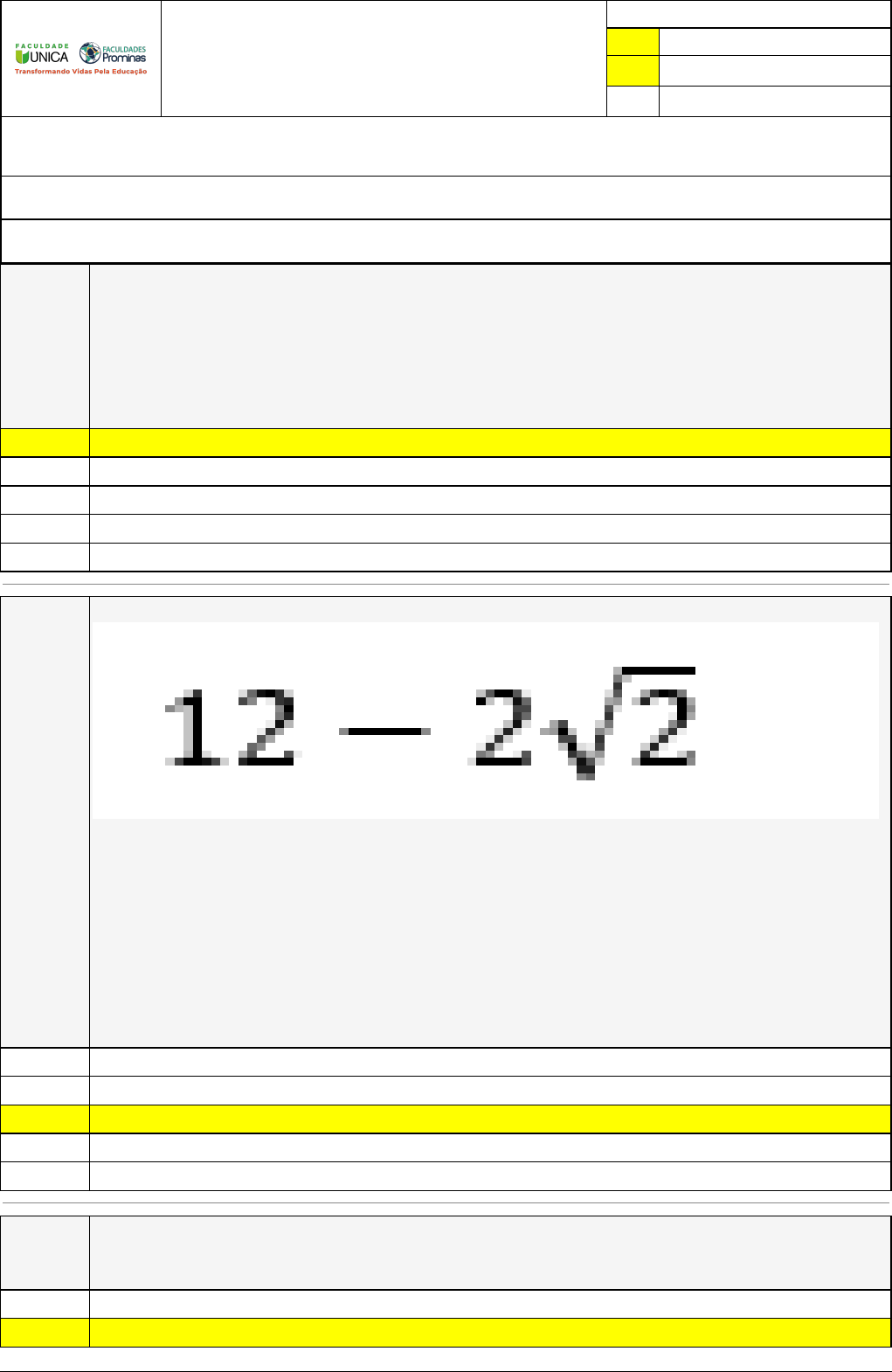 Pincel Atômico - 26/10/2022 17:02:22 1/3 Exercício Caminho do Conhecimento - Etapa 24 (20049) Atividade finalizada em 26/10/2022 17:02:03 (519400 / 1) LEGENDA Resposta correta na questão # Resposta correta - Questão Anulada X Resposta selecionada pelo Aluno Disciplina: PRÁTICA PEDAGÓGICA INTERDISCIPLINAR: FUNDAMENTOS E METODOLOGIA DE BIOLOGIA CELULAR, TECIDUAL E GENÉTICA [512147] - Avaliação com 8 questões, com o peso total de 1,67 pontos [capítulos - 6] Turma: Segunda Graduação: Segunda Graduação 6 meses - Licenciatura em Ciências Biológicas - Grupo: NOVEMBRO/2022 - SGegu0A210922 [73666] Aluno(a): 91361502 - BRUNO MASSARELLI GARRIDO - Respondeu 3 questões corretas, obtendo um total de 0,63 pontos como nota [358934_12274 3] Questão 001 Considere as seguintes afirmativas sobre os OGMs e transgênicos: (I) Organismos geneticamente modificados e transgênicos são sinônimos. (II) Organismos geneticamente modificados são aqueles que tiveram alteração em seu material genético. (III) Organismos transgênicos são aqueles em que foi introduzido um ou mais segmentos de DNA, oriundos de um outro organismo, em seu material genético. Assinale a alternativa correta. X Somente II e III estão corretas. Somente II está correta. Todas as afirmativas estão incorretas. Somente I e II são corretas. Todas as afirmativas estão corretas. [358934_12274 5] Questão 002 (UFSM-2000) Associe as colunas: COLUNA 1 1- genoma 2- gene 3- cromossomo 4- cariótipo COLUNA 2 ( ) segmento de DNA que contém instrução para a formação de uma proteína. ( ) estrutura formada por uma única molécula de DNA, muito longa, associada a proteínas, visível durante a divisão celular. ( ) conjunto de genes de uma espécie. A sequência correta é 2 - 4 - 1. 3 - 4 -1. X 2 - 3 - 1. 3 - 2 - 4. 1 - 2 - 3. [358934_12125 0] Questão 003 (UFSJ- 2004 – adaptado) O genoma humano foi sequenciado em 2003. Não se sabe ainda a função de todos os genes, mas a variabilidade genética dentro da espécie é determinada pelo (a) número das bases. sequência das bases. Pincel Atômico - 26/10/2022 17:02:22 2/3 nenhuma das alternativas anteriores. X número e sequência das bases. local do gene no cromossomo. [358936_12123 8] Questão 004 Considere as seguintes afirmativas a seguir: Visualização: 1- eletroforese; 2- uso de laser e armazenamento em banco de dados. Didesoxinucleotídeos: I- presente 10; II- ausente. Objetivo: a) conhecer a sequência de DNA; b) amplificar o fragmento de DNA em boas quantidades. São características da técnica de PCR: II-1-b I-1-a II-1-a II – 2 – a X I-2-b [358936_12123 9] Questão 005 A ausência da hidroxila na posição 3’ do carbono dos ddNTPs (didesoxinucleotídeos) utilizados em um sequenciamento permite que a DNA polimerase seja impedida de adicionar uma nova base à cadeia e que a polimerização termine em posições aleatórias X haja a inserção de uma nova base nucleotídica por meio de uma ligação fosfodiéster a DNA polimerase dê prosseguimento à polimerização da cadeia os primers se anelem à molécula de DNA. haja o melhor funcionamento da DNA polimerase [358934_12274 9] Questão 006 Sobre o Genoma é possível inferir que equivale as sequências dos éxons dos organismos. equivale as sequências dos íntrons dos organismos equivale as sequências gênicas dos organismos X equivale as sequências gênicas e não gênicas dos organismos. equivale as sequências não gênicas dos organismos [358934_12274 6] Questão 007 Sobre o método de sequenciamento assinale a opção correta. Baseia-se em uma reação com utilização de terminadores de cadeia (didesoxinucleotídeos, ddNTPs) marcados com fluorescência, além de nucleotídeos naturais (dNTPs). Nenhuma das alternativas. Baseia-se em uma reação com utilização de terminadores de cadeia (deoxinucleotídeos, dNTPs) não marcados, além de nucleotídeos naturais (ddNTPs). Baseia-se em uma reação com utilização de terminadores de cadeia (didesoxinucleotídeos, ddNTPs) não marcados, além de nucleotídeos naturais (dNTPs). X Baseia-se em uma reação com utilização de terminadores de cadeia (deoxinucleotídeos, dNTPs) marcados com fluorescência, além de nucleotídeos naturais (ddNTPs). Pincel Atômico - 26/10/2022 17:02:22 3/3 [358936_12123 6] Questão 008 Considere as seguintes afirmativas a seguir: Visualização: 1- eletroforese; 2- uso de laser e armazenamento em banco de dados. Didesoxinucleotídeos: I- presente 10; II- ausente. Objetivo: a) conhecer a sequência de DNA; b) amplificar o fragmento de DNA em boas quantidades. São características da técnica de PCR: II-1-b II – 2 – a X I-2-b II-1-a I-1-a