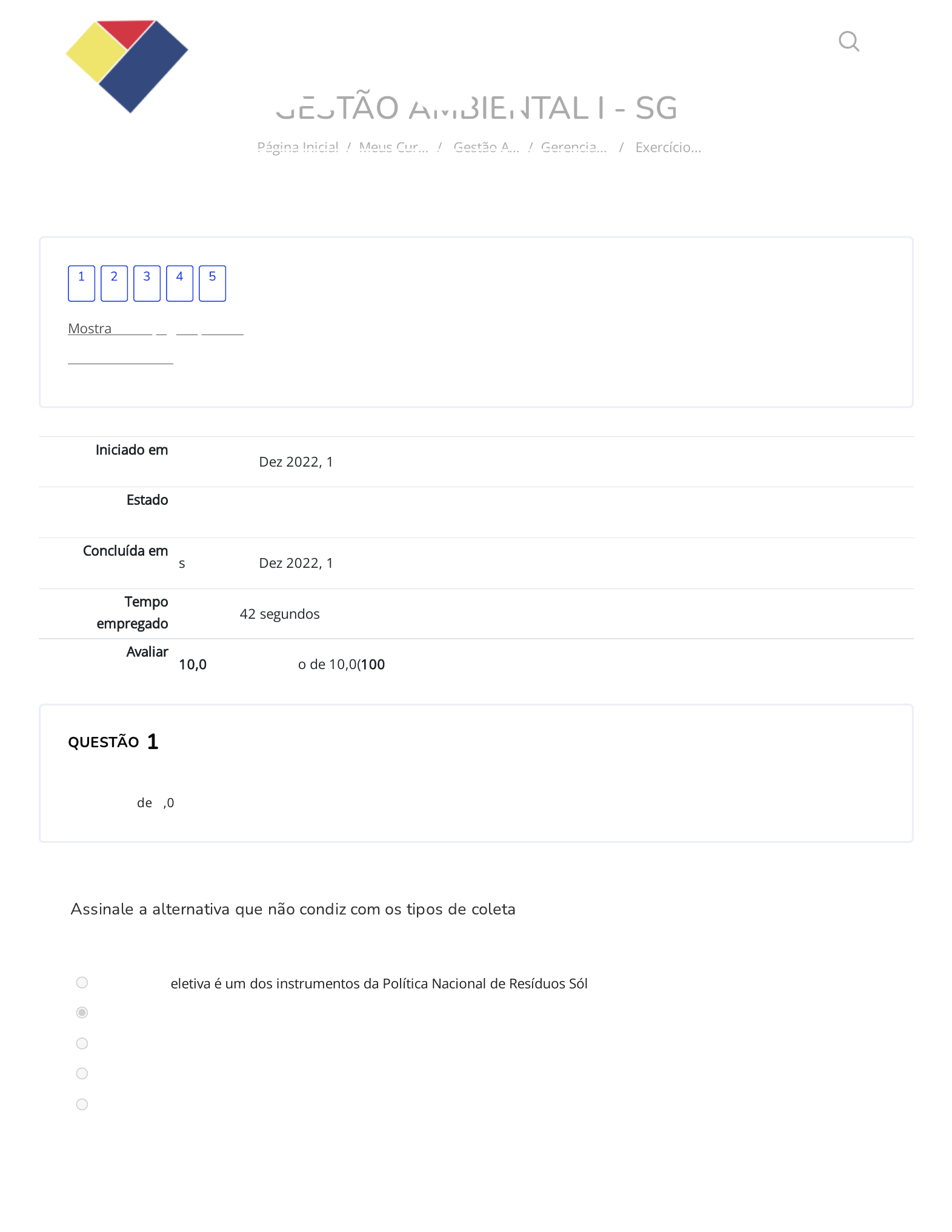 19/12/2022 10:41 Exercício de Fixação - Gerenciamento de Resíduos Sólidos: Revisão da tentativa https://cpetead.com.br/mod/quiz/review.php?attempt=3350773&cmid=47850 1/4 GESTÃO AMBIENTAL I - SG Página Inicial / Meus Cur… / Gestão A… / Gerencia… / Exercício… Iniciado em segunda, 19 Dez 2022, 10:39 Estado Finalizada Concluída em segunda, 19 Dez 2022, 10:40 Tempo empregado 1 minuto 42 segundos Avaliar 10,0 de um máximo de 10,0(100%) QUESTÃO Correto Atingiu 2,0 de 2,0 Mostrar uma página por vez Terminar revisão 1 2 3 4 5 1 Assinale a alternativa que não condiz com os tipos de coleta Escolha uma opção: a. A coleta seletiva é um dos instrumentos da Política Nacional de Resíduos Sólidos. b. O rejeito deve ser encaminhado juntamente com a coleta seletiva. c. Coleta seletiva é o termo utilizado para a coleta dos materiais que são possíveis de serem reciclados. d. A coleta convencional deve coletar apenas os rejeitos e o material orgânico. e. É necessária a segregação dos resíduos na origem. Sua resposta está correta. A resposta correta é: O rejeito deve ser encaminhado juntamente com a coleta seletiva. https://cpetead.com.br/ https://cpetead.com.br/course/view.php?id=2012 https://cpetead.com.br/mod/quiz/view.php?id=47850 https://cpetead.com.br/mod/quiz/review.php?attempt=3350773&cmid=47850&showall=0 https://cpetead.com.br/mod/quiz/view.php?id=47850 https://cpetead.com.br/ 19/12/2022 10:41 Exercício de Fixação - Gerenciamento de Resíduos Sólidos: Revisão da tentativa https://cpetead.com.br/mod/quiz/review.php?attempt=3350773&cmid=47850 2/4 QUESTÃO Correto Atingiu 2,0 de 2,0 QUESTÃO Correto Atingiu 2,0 de 2,0 2 A maioria das cidades brasileiras não adota soluções apropriadas para a destinação �nal dos resíduos sólidos, o que causa muitos problemas para a saúde da população e para o meio ambiente. Com relação aos diferentes métodos de tratamento de resíduos sólidos urbanos, é CORRETO a�rmar: Escolha uma opção: a. Os aterros sanitários podem ser um abrigo de transmissores de doenças, como ratos e moscas. b. A biodigestão anaeróbia é o processo de decomposição de matéria orgânica por bactérias em meio onde há ausência de oxigênio. c. A grande vantagem de um aterro sanitário é que o lixiviado percola no solo, evitando contaminação das águas. d. A decomposição aeróbia da matéria orgânica no aterro sanitário resulta em elevada produção de metano. e. Os aterros sanitários podem ser um abrigo de transmissores de doenças, como ratos e moscas. Sua resposta está correta. A resposta correta é: A biodigestão anaeróbia é o processo de decomposição de matéria orgânica por bactérias em meio onde há ausência de oxigênio. 3 No que tange aos resíduos sólidos, analise as alternativas e marque o item CORRETO. Escolha uma opção: a. O resíduo recebe classi�cação de acordo com sua fonte geradora e composição do material, havendo a necessidade de tratamento especí�co para cada tipologia. b. A população não deve se preocupar em reduzir a produção de resíduos, visto que esse material é reciclado. c. A maior parte dos resíduos produzidos pela população de alta renda é de origem orgânica. d. Os resíduos são caracterizados como tudo aquilo que não tem mais utilidade e não apresenta nenhum valor. e. A crescente produção de resíduos não é prejudicial ao meio ambiente, visto que ocorre a coleta desse material. Sua resposta está correta. A resposta correta é: O resíduo recebe classi�cação de acordo com sua fonte geradora e composição do material, havendo a necessidade de tratamento especí�co para cada tipologia. 19/12/2022 10:41 Exercício de Fixação - Gerenciamento de Resíduos Sólidos: Revisão da tentativa https://cpetead.com.br/mod/quiz/review.php?attempt=3350773&cmid=47850 3/4 QUESTÃO Correto Atingiu 2,0 de 2,0 QUESTÃO Correto Atingiu 2,0 de 2,0 4 A Política Nacional de Resíduos Sólidos classi�ca o resíduo sólido de acordo com sua origem e o tipo de material. Aponte a categoria de resíduos que está INCORRETA. Escolha uma opção: a. Resíduos de limpeza pública urbana são aqueles originados da varrição de ruas. b. Resíduos sólidos urbanos engloba apenas os resíduos domiciliares e de serviços de limpeza urbana. c. Resíduos de serviços de saúde são aqueles gerados em estabelecimentos prestadores de serviços de saúde. d. Resíduos de construção civil incluem os gerados em reformas e demolições. e. Resíduos sólidos industriais podem ser orgânicos ou inorgânicos. Sua resposta está correta. A resposta correta é: Resíduos sólidos urbanos engloba apenas os resíduos domiciliares e de serviços de limpeza urbana. 5 No artigo 33 da Política Nacional dos Resíduos Sólidos, �ca obrigatória a logística reversa para agrotóxicos, pilhas e baterias, pneus, óleos lubri�cantes, lâmpadas �uorescentes e eletroeletrônicos. Considerando as informações acima e o contexto da situação dos produtos após o uso pelo consumidor, a logística reversa recomenda, em relação a esses produtos, que se faça o: Escolha uma opção: a. Envio para aterros sanitários sem a participação dos fabricantes e comerciantes. b. Envio para o serviço público de limpeza urbana. c. Envio por parte dos consumidores para os comerciantes ou distribuidores, os quais deverão efetuar a devolução aos fabricantes ou aos importadores dos produtos e das embalagens. d. Envio para aterros sanitários sem a atuação do poder público. e. Encaminhamento para aterro de resíduos perigosos. Sua resposta está correta. A resposta correta é: Envio por parte dos consumidores para os comerciantes ou distribuidores, os quais deverão efetuar a devolução aos fabricantes ou aos importadores dos produtos e das embalagens. ◄ Conteúdo de Estudo - Gerenciamento de Resíduos Sólidos Seguir para... Conteúdo de Estudo - Gerenciamento e Tratamento de Resíduos Sólidos Indus