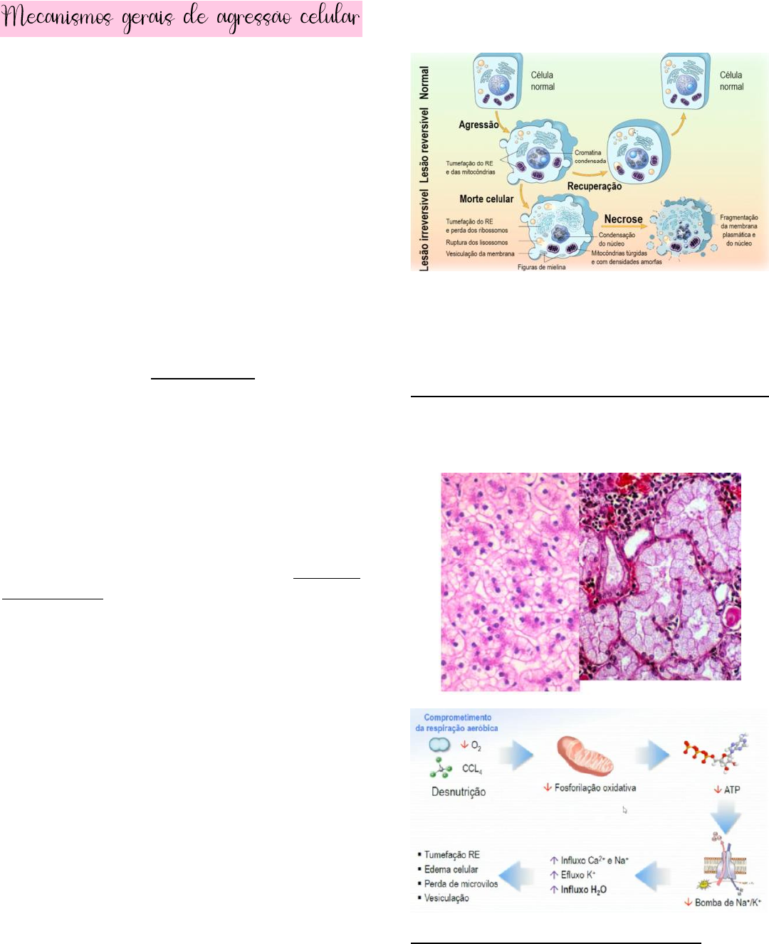 AGRESSÃO: agentes físicos, químicos, biológicos e falta de oxigênio, nutrição, genética e reações imunológicas. o Agressão: Características, duração e intensidade o Célula: tipo, propriedades e a situação metabólica. ✓ Agressão aguda – súbita, intensidade moderada a alta. ✓ Agressão crônica – persistente, intensidade mais baixa. Pode haver alterações genéticas > adaptações celulares. Lesões reversíveis > ponto de não retorno > lesão irreversível > morte celular > alterações macroscópicas. o Alterações moleculares e a morte celular ocorrem antes dos achados microscópicos histológicos. DEGENERAÇÃO HIDRÓPICA: lesão reversível, caracterizada pelo acúmulo de água em meio intracelular. ISQUEMIA: causada pela perfusão inadequada dos tecidos. Causa a redução da produção energética por fosforilação oxidativa pela hipóxia. Altera os processos metabólicos como bomba de sódio e potássio (efluxo de potássio e influxo de sódio e água). Consequentemente, causa tumefação das organelas e a vesiculação. A produção de energia fica sendo realizada por glicólise anaeróbica, porém produz menor energia e promove a queda dos estoques de glicogênio. Com menor disponibilidade de oxigênio, há aumento das concentrações intracelulares de ácido lático e queda de pH, alterando componentes da célula. Há também o desligamento dos ribossomos do RER - redução de síntese proteica > redução das enzimas > aumento do acúmulo de lipídeos. CÁLCIO: Armazenado em mitocôndrias e retículo endoplasmático. Agressão pode causar aumento dos níveis de cálcio citoplasmático pela permeabilidade alterada, dessa forma, o cálcio pode promover ativação de enzimas no meio intracelular, levando à menor disposição de energia e alterações na integridade celular. LESÕES REVERSÍVEIS E ACÚMULOS CELULARES E TECIDUAIS: Metabolismo alterado, proteína defeituosa, deficiência enzimática, materiais pouco digeríveis. DEGENERAÇÃO HIDRÓPICA/EDEMA CELULAR: acúmulo intracelular de água. [agressão tóxica e hipóxia/anóxia]. Pode promover também acúmulo de gordura e morte celular. DEGENERAÇÕES GORDUROSAS: acúmulo intracelular de lipídios. [agressão tóxica, nutrição, diabetes, distúrbios genéticos e nutricionais, lesões de membrana e obesidade]. o Hepatócitos [triglicérides e ácidos graxos] - esteatose macrovesicular e microvesicular o Macrófagos [ésteres de colesterol] - células xantomatosas (aterosclerose). Esteatose hepática: acúmulo de triglicérides e ácidos graxos nos hepatócitos. | Fígado fica aumentado, amarelado, gorduroso e amolecido, histologicamente há vesículas, aspecto vacuolizado. Esteatose cardíaca: acúmulo de gordura nos cardiomiócitos. Casos de hipóxia transitória. | Coração fica com coloração de aspecto amarelado intercalado à coloração normal, histologicamente o meio intracelular fica mais rarefeito. Aterosclerose: acúmulo de gordura no endotélio das artérias. Início com acúmulo de ésteres de colesterol em macrófagos. DEGENERAÇÕES HIALINAS: acúmulo intracelular de proteínas [agressão tóxica, amiloidoses, distúrbios imunológicos, doenças glomerulares, infecções virais]. o Corpúsculos de Mallory, Corpúsculos de Russel e Inclusões Virais. AMILOIDOSE: amiloides são fragmentos de proteínas fibrilares em conformação beta – AA (hepática - inflamações crônicas); AL (imunoglobulinas – mieloma múltiplo); AB2 (B2- microglobulina – hemodiálise); AB (amiloide-B – Alzheimer). DEGENERAÇÃO GLICOGÊNICA: acúmulo intracelular de carboidratos. [desnutrição, diabetes, glicogenoses, obesidade]. | Histologicamente – membrana espessada e vacuolização do citoplasma. DEGENERAÇÃO MUCÓIDE: acúmulo intracelular de glicosaminoglicanos. [distúrbios genéticos, inflamação, neoplasias]. | Núcleo confinado na periferia da célula. CALCIFICAÇÕES PATOLÓGICAS: acumulação de cálcio, gerando calcificações em tecidos mole. Calcificação distrófica: deposição de sais de cálcio sobre restos celulares após processo de morte celular [necrose] – esteatonecroses. Calcificação metastática: secundária a aumento sistêmico de cálcio ou fosfatos – cânceres. ACÚMULOS DE PIGMENTO: o Endógenos: bilirrubina, hemossiderina, lipofuscina e melanina. o Exógenos: antracnose (carvão), tatuagens, silicose (sílica). Bilirrubina: doenças hemolíticas e hemorragias graves, doenças hepáticas e doenças obstrutivas. – Icterícia e coletase. Hemossiderina: ferritina; eventos hemolíticos e hemorragias. – Hemocromatose (distúrbios na metabolização e absorção do ferro). Lipofuscina: origem pela oxidação de lipídeos – pigmento de desgaste (envelhecimento e necrose); neurônios e miocárdio. Antracose: derivados do carvão - fagocitados por macrófagos alveolares. ATROFIA: diminuição do tamanho da célula pela perda de substâncias. [Formação de vacúolos autofágicos]. Em resposta, órgãos colaterais podem sofrer hipertrofia. o Atrofia simples – redução do volume e substâncias, sem alteração do nº de células por morte celular. [atrofia de fibras musculares esqueléticas]. o Atrofia numérica: redução do nº de células [atrofia na senilidade] o Atrofia por desuso, devido à perda de inervação, insuficiência nutricional, envelhecimento, compressão. HIPERPLASIA: aumento do nº de células, em consequência do aumento do ritmo da divisão celular. O aumento do tecido acompanha um aumento do fluxo sanguíneo para o órgão. o Hiperplasia fisiológica: fatores hormonais ou de forma compensatória. o Hiperplasia patológica: estimulação excessiva de hormônios, reacional ou congênita. HIPERTROFIA: aumento do volume das células – maior síntese proteica. o Hipertrofia fisiológica: útero na gravidez. o Hipertrofia patológica: miocárdio hipertrófico METAPLASIA: transformação total de um tecido adulto e diferenciado em um outr