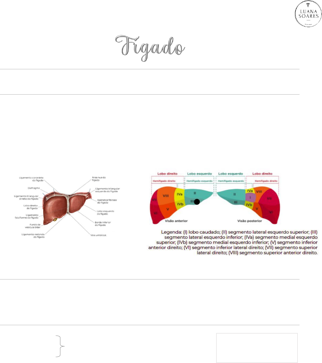 Anatomia • É uma glândula do corpo secretiva • Se localiza no HD • É a maior glândula no corpo humano, pesando aproximadamente 1,5 quilogramas • É completamente recoberto por peritônio visceral, exceto por sua área nua, que é onde o órgão encontra- se em contato com o diafragma • Fica meio que acobertado pelas costelas flutuantes FUNÇÃO • Órgão acessório do trato gastrointestinal, desintoxicação (limpeza), síntese de proteínas, produção bioquímica, armazenamento de nutrientes... ANATOMIA • LOBOS o Direito o Esquerdo o Caudado o Quadrado • DIVISÃO MORFOFUNCIONAL o Funcionalmente, o fígado é dividido em dois hemifígados, conhecidos como fígados direito e esquerdo, os quais, por sua vez, são divididos em setores e segmentos, tendo como elementos de definição os pedículos portais e as veias hepáticas. o Os fígados direito e esquerdo são separados pela cisura portal principal, também conhecida como LINHA DE CANTLIE, é uma linha imaginária que passa medialmente à vesícula biliar e vai até a veia hepática média dividindo o fígado em lobos direito e esquerdo. Portanto, tal divisão anatômica tem como limite essa linha, e não o ligamento falciforme. são separados pela fissura umbilical na face inferior e pelo ligamento falciforme na face ântero-superior O lobo D por ser maior e receber um maior suprimento é o local que mais se desenvolver mais problemas (abcesso, neoplasia) - Na intimidade do parênquima, esta linha corresponde ao curso da veia hepática média - Importante na hepatectomia • LIGAMENTOS: coronário, triangular esquerdo, falciforme, redondo e venoso • Fissuras e recessos: porta hepatis (fissura central - contém veia porta, artéria hepática, plexo nervoso hepático, ductos hepáticos e vasos linfáticos), recesso subfrênico (divisão entre o fígado e o diafragma), recesso hepatorrenal (separa o fígado do rim e da glândula suprarrenal direita) • DRENAGEM LINFÁTICA o Linfonodos hepáticos -> linfonodos celíacos -> cisterna do quilo • SUPRIMENTO VENOSO o Veia porta (processamento metabólico de substâncias absorvidas no intestino) – esplênica + mesentérica superior o Adentra no fígado (já a veia cava passa posterior ao fígado) o 75-80% do fluxo sanguíneo hepático são provenientes da veia porta, o restante é atribuído à artéria hepática o 50% do O2 vem da veia porta e os outros 50% da artéria hepática o A veia porta joga nas supra-hepáticas (caso elas trombose causa a síndrome de Budd-Chiari (SBC) primária é uma doença vascular hepática extremamente rara, decorrente da obstrução do fluxo venoso de saída hepático, geralmente ao nível da veia hepática (VH) ou da veia cava inferior (VCI)) • SUPRIMENTO ARTERIAL o Artéria hepática (suprimento do tecido hepático com oxigêncio e nutrientes) o 20-25% do fluxo arterial • DRENAGEM o veia hepática -> veia cava inferior -> átrio direito • INERVAÇÃO o Plexo hepático, plexo celíaco TIPOS DE RESSECÇÕES • Em cunha: biopsia (deve ser feita na margem da lesão) • Hepatectomia: o Muito usada em transplante o 70-80% pode-se retirar do figado INCISÕES MANOBRAS • MANOBRA DE PRINGLE o Para minimizar a perda sanguínea na ressecção hepática, uma oclusão coincidente da estrutura vascular portal (manobra de Pringle) pode ser feita colocando-se um grampo através do ligamento hepatoduodenal. o A oclusão seletiva do fluxo é associada a menor injúria hepática. OBSERVAÇÕES • A percussão do fígado é maciça o Sinal de Jobert: Hipertimpanismo em região hepática, que indica a presença de perfuração de víscera oca em peritônio livre o Sinal de Kudelec. o ar acumulado entre o fígado e diafragma no RX • Pneumoperitonio o Solicitar RX em PA CHEVRON MERCEDES-BENZ J invertido • O pâncreas é uma glândula retroperitoneal que é dividida anatomicamente em diferentes estruturas: a cabeça, corpo e cauda. • Esse órgão é dividido funcionalmente em exócrino e endócrino. • A cabeça do pâncreas encontra-se em íntimo contato com o duodeno, enquanto a cauda faz contato com o hilo esplênico e flexura cólica esquerda. • O corpo e a cauda do pâncreas se estendem pelo retroperitônio em direção ao baço. • O colo é marcado anatomicamente pela relação com os vasos mesentéricos superiores que passam posteriormente ao colo pancreático. À direita do colo do pâncreas, localiza-se a cabeça e sua projeção mais inferior, denominada processo uncinado. • O canal de Winsurg é um ducto excretório, o qual acompanha toda a extensão do pâncreas. Conecta-se ao duodeno através da ampola de Vater, onde se junta ao ducto biliar. • O esfíncter de Oddi, juntamente com a ampola de Vater, regula a secreção pancreática no trato gastrointestinal. DRENAGEM BILIAR • Ductos hepáticos D e E • Ducto hepático comum • Ducto cístico • Ducto colédoco • Termina na 2ª porção do duodeno • VB → armazena a bile • Papila duodenal maior • Ducto pancreático principal • Ducto pancreático acessório → papila menor do duodeno Cálculos Bil iares • Exame de escolha a USG, servindo como opções CPRE e CRNM. • TC não é o exame adequado para estudo de vesícula biliar • Incisão subcostal D e abertura por planos é abertura de escolha para tratamento de vias biliares • Os cálculos assintomáticos o tratamento é conservador FORMAÇÃO DOS CÁLCULOS • A grande maioria se origina na vesícula FATORES DE RISCO • Sobrepeso ou obesidade • Sexo feminino • Idade fértil (multípara) • 40 ou mais anos de idade SINTOMAS • Epigastralgia (dor na parte superior do abdome ou epigástrio) • A dor normalmente aparece meia hora após uma refeição, atinge um pico de intensidade e diminui depois • Dispepsia • Pode vir ou não acompanhada de febre, náuseas e vômitos. • Os sintomas intermitentes COLELITÍASE • Inflamação da vesícula • 2/3 assintomáticos • Queixa principal –