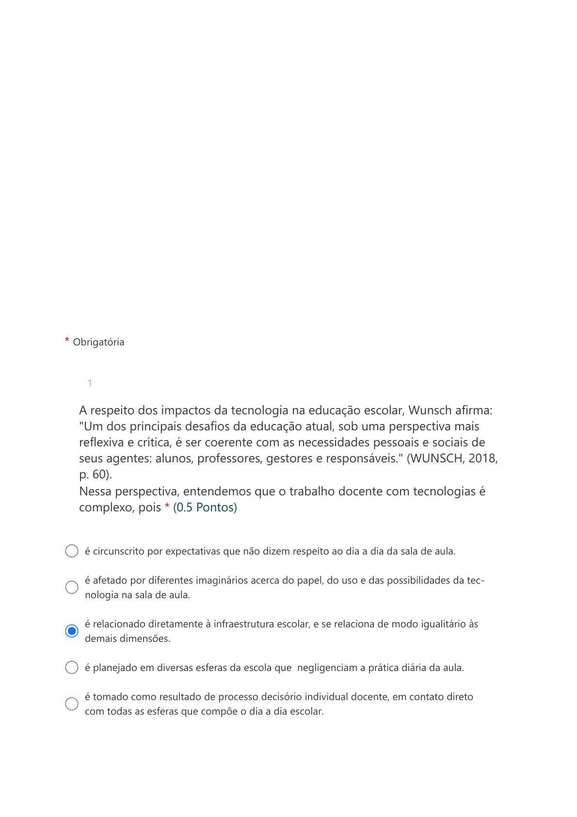 07/12/22, 22:03 N2- Tecnologia na Educação// S000246- Quarta-feira noturno https://forms.office.com/pages/responsepage.aspx?id=7YcHb1Qwg0uKGxogJNpi1hgcxbSrcnpGtnhVW9jVaxFUQ0swOVlUUU9QTEM0UkU1Tjh… 1/17 N2- Tecnologia na Educação// S000246- Quarta-feira noturno Atenção: após o término da avaliação, clique com o botão direito de seu mouse para "imprimir" o formulário e faça um download de suas respostas para você. Publique o arquivo gerado no AVA, como registro de evidência de realização da prova. * Obrigatória 1 A respeito dos impactos da tecnologia na educação escolar, Wunsch afirma: "Um dos principais desafios da educação atual, sob uma perspectiva mais reflexiva e crítica, é ser coerente com as necessidades pessoais e sociais de seus agentes: alunos, professores, gestores e responsáveis." (WUNSCH, 2018, p. 60). Nessa perspectiva, entendemos que o trabalho docente com tecnologias é complexo, pois * (0.5 Pontos) é circunscrito por expectativas que não dizem respeito ao dia a dia da sala de aula. é afetado por diferentes imaginários acerca do papel, do uso e das possibilidades da tec- nologia na sala de aula. é relacionado diretamente à infraestrutura escolar, e se relaciona de modo igualitário às demais dimensões. é planejado em diversas esferas da escola que negligenciam a prática diária da aula. é tomado como resultado de processo decisório individual docente, em contato direto com todas as esferas que compõe o dia a dia escolar. 07/12/22, 22:03 N2- Tecnologia na Educação// S000246- Quarta-feira noturno https://forms.office.com/pages/responsepage.aspx?id=7YcHb1Qwg0uKGxogJNpi1hgcxbSrcnpGtnhVW9jVaxFUQ0swOVlUUU9QTEM0UkU1Tjh… 2/17 2 Curso matemática 3 E-mail: gabrielavitelli@gmail.com 4 Analise as afirmações a seguir: I- A autonomia discente na sociedade da informação construída junto ao professor se dá no senso crítico de diferenciar fatos de opiniões. II- A qualidade do ensino mediado pela tecnologia está na participação ativa discente por meio de estratégias de metodologia ativa. III- Compreender o objeto de conhecimento por meio da Internet e trazer práticas de comunicação e produção discente são efeitos benéficos do uso da tecnologia na educação. É correto o que se afirma em: * (0.5 Pontos) I e II, somente. I, II e III. I e III, somente. III, somente. II, somente. 07/12/22, 22:03 N2- Tecnologia na Educação// S000246- Quarta-feira noturno https://forms.office.com/pages/responsepage.aspx?id=7YcHb1Qwg0uKGxogJNpi1hgcxbSrcnpGtnhVW9jVaxFUQ0swOVlUUU9QTEM0UkU1Tjh… 3/17 5 Sobre a abordagem STEAM, é correto afirmar que: * (0.5 Pontos) aborda as áreas de Tecnologia, Ciências e Engenharia e propõe uma série fixa de procedi- mentos a serem seguidos em aula. Tem um olhar interdisciplinar, que utiliza as artes como forma de expressão do desenvolvi- mento e conhecimento humano. Resolve problemas abstratos com os estudantes a partir de etapa de rotina do pensamento. Contempla o pensamento científico sem atrelar à resolução de problemas ao longo da execução das atividades. Determina a produção de protótipos desenvolvidos por meio da estratégia de "World Café". 07/12/22, 22:03 N2- Tecnologia na Educação// S000246- Quarta-feira noturno https://forms.office.com/pages/responsepage.aspx?id=7YcHb1Qwg0uKGxogJNpi1hgcxbSrcnpGtnhVW9jVaxFUQ0swOVlUUU9QTEM0UkU1Tjh… 4/17 6 Analise as asserções abaixo: I- O docente na era 3.0 tem o olhar voltado para a tecnologia (plugada ou desplugada) desde o planejamento até a avaliação de suas aulas. PORQUE II- A cibercultura produz uma inteligência coletiva, que se manifesta por meio do consumo e da produção coletiva de informações, e que permeia o modo de ensino e aprendizagem no século 21. A respeito dessas asserções, assinale a opção correta. * (0.5 Pontos) As asserções I e II são proposições verdadeiras, e a II é justificativa da I. As asserções I e II são proposições verdadeiras, mas a II não é justificativa da I. A asserção I é uma proposição verdadeira, e a II é uma proposição falsa. A asserção I é uma proposição falsa, e a II é uma proposição verdadeira. As asserções I e II são proposições falsas. 07/12/22, 22:03 N2- Tecnologia na Educação// S000246- Quarta-feira noturno https://forms.office.com/pages/responsepage.aspx?id=7YcHb1Qwg0uKGxogJNpi1hgcxbSrcnpGtnhVW9jVaxFUQ0swOVlUUU9QTEM0UkU1Tjh… 5/17 7 A respeito da relação entre recursos digitais e suas aplicações pedagógicas, analise as seguintes colunas. Assinale a alternativa que apresenta a associação correta entre as colunas A e B: * (0.5 Pontos) I-3, II- 4, III- 2, IV-1, V- 5 I-2, II- 1, III- 4, IV-5, V- 3 I-3, II- 5, III- 4, IV-1, V- 2 I-5, II- 2, III- 3, IV-1, V- 4 I-3, II- 5, III- 2, IV-1, V- 1 07/12/22, 22:03 N2- Tecnologia na Educação// S000246- Quarta-feira noturno https://forms.office.com/pages/responsepage.aspx?id=7YcHb1Qwg0uKGxogJNpi1hgcxbSrcnpGtnhVW9jVaxFUQ0swOVlUUU9QTEM0UkU1Tjh… 6/17 8 Analise as asserções abaixo: I- À educação do século XXI, no que tange à tecnologia, compete o uso tecnológico e o desenvolvimento do letramento digital, enquanto competências gerais a serem trabalhadas. PORQUE II- Conforme Freire (2010), o sentido do letramento é o desenvolvimento da leitura no sujeito e sua consequente ação e autonomia no mundo. A respeito dessas asserções, assinale a opção correta. * (0.5 Pontos) As asserções I e II são proposições verdadeiras, e a II é justificativa da I. As asserções I e II são proposições verdadeiras, mas a II não é justificativa da I. A asserção I é uma proposição verdadeira, e a II é uma proposição falsa. A asserção I é uma proposição falsa, e a II é uma proposição verdadeira. As asserções I e II são proposições falsas. 07/12/22, 22:03 N2- Tecnologia na Educação// S000246- Quarta-feira noturno https://forms.office.com/pages/responsepage.aspx?id=7YcHb1Qwg0uKGxogJNpi1hgcxbSrcnpGtnhV