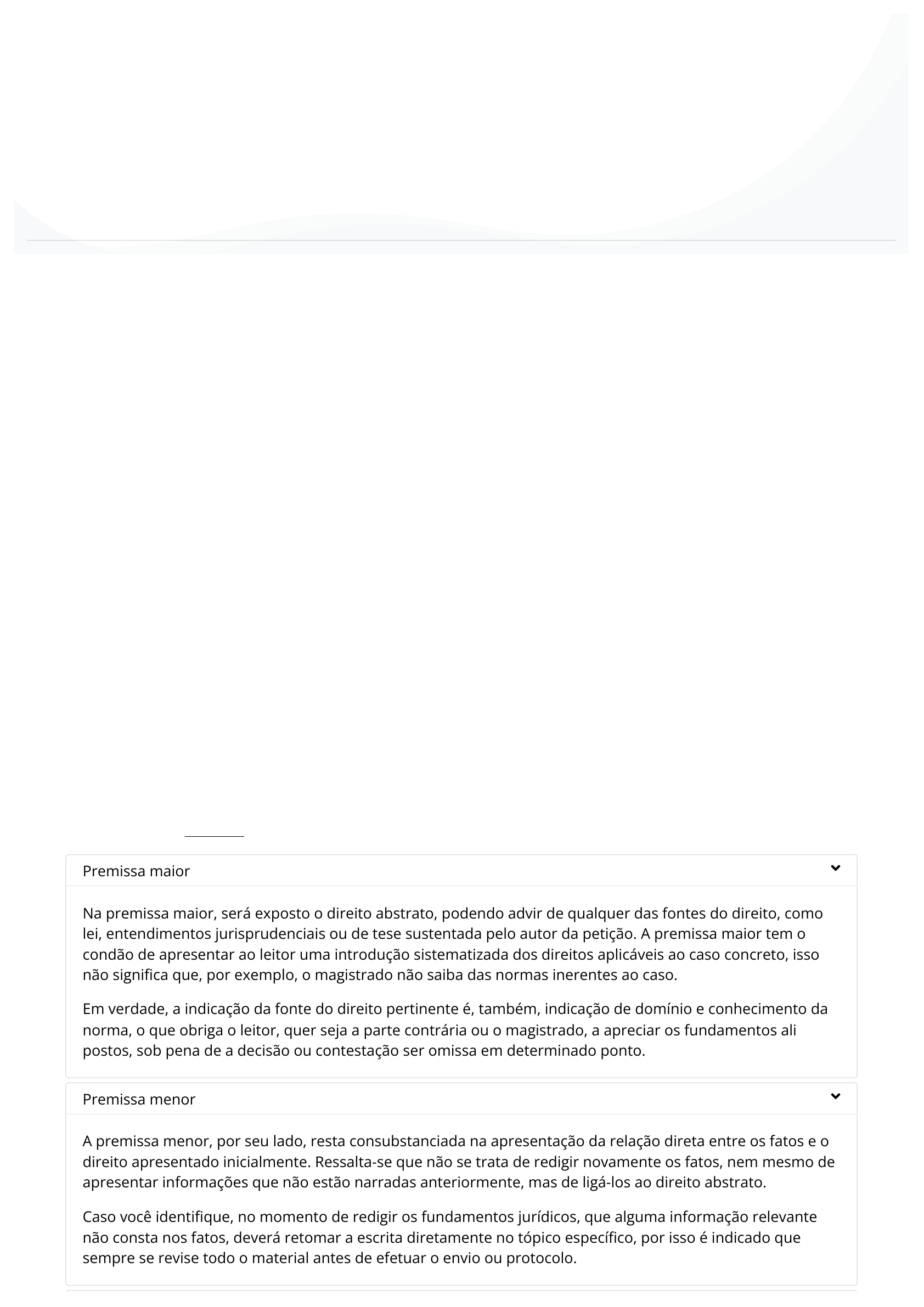 Apesar das manifestações exigirem cada vez mais uma linguagem menos rebuscada, para facilitar a compreensão e comunicação dentro do processo, a argumentação jurídica jamais caiu em desuso, mas adaptou-se e adapta-se ao momento histórico, conservando sua base. Nesta webaula, você conhecerá os fundamentos de peças e instrumentos jurídicos. Fundamentos de Peças e Instrumentos Jurídicos É comum ouvir, logo nos primeiros semestres do curso, o brocardo “os juízes conhecem o direito” que deriva do latim “iura novit curia”. Todavia, no que tange aos requisitos essenciais da petição, conforme a segunda parte do inciso III do art. 319 do CPC, não é possível se furtar a indicar na petição os fundamentos jurídicos em que se baseiam os pedidos. Em outras palavras, esse tópico não é dispensável e serve para que o autor justi�que, por meio das fontes do direito, o motivo pelo qual os pedidos realizados na petição devem ser atendidos pelo juízo, ou seja, é a exposição do direito abstrato inerente aos fatos na petição ou instrumento jurídico. Características essenciais Os fundamentos jurídicos são articulados de modo que �que evidente ao leitor a existência de norma regulamentadora para o resultado de uma ação ou omissão produzida na sociedade e suportada por uma ou mais pessoas que necessitam de amparo e não encontram, nos meios de autocomposição, resolução razoável para o problema. É comum que, ao argumentar juridicamente, os fundamentos sejam apresentados na seguinte ordem de ideias: premissa maior, premissa menor e linha de convencimento (CAMPESTRINI; FLORENCE, 2019). Premissa maior Na premissa maior, será exposto o direito abstrato, podendo advir de qualquer das fontes do direito, como lei, entendimentos jurisprudenciais ou de tese sustentada pelo autor da petição. A premissa maior tem o condão de apresentar ao leitor uma introdução sistematizada dos direitos aplicáveis ao caso concreto, isso não signi�ca que, por exemplo, o magistrado não saiba das normas inerentes ao caso. Em verdade, a indicação da fonte do direito pertinente é, também, indicação de domínio e conhecimento da norma, o que obriga o leitor, quer seja a parte contrária ou o magistrado, a apreciar os fundamentos ali postos, sob pena de a decisão ou contestação ser omissa em determinado ponto. Premissa menor A premissa menor, por seu lado, resta consubstanciada na apresentação da relação direta entre os fatos e o direito apresentado inicialmente. Ressalta-se que não se trata de redigir novamente os fatos, nem mesmo de apresentar informações que não estão narradas anteriormente, mas de ligá-los ao direito abstrato. Caso você identi�que, no momento de redigir os fundamentos jurídicos, que alguma informação relevante não consta nos fatos, deverá retomar a escrita diretamente no tópico especí�co, por isso é indicado que sempre se revise todo o material antes de efetuar o envio ou protocolo. Teoria da Argumentação Jurídica Técnicas para exposição de fatos, relatórios e descrições, além de exposição de fundamentos Você sabia que seu material didático é interativo e multimídia? Isso signi�ca que você pode interagir com o conteúdo de diversas formas, a qualquer hora e lugar. Na versão impressa, porém, alguns conteúdos interativos �cam desabilitados. Por essa razão, �que atento: sempre que possível, opte pela versão digital. Bons estudos! Linha de convencimento A linha de convencimento é o momento indicado para a�rmar o direito inerente ao cliente, em decorrência do resultado de ação ou omissão regulados pela norma brasileira, com a indicação das provas do fato. Como redigir os fundamentos utilizando a argumentação jurídica É sabido que a legislação defende o consumidor contra vícios e defeitos dos produtos, conforme inteligência dos art. 12 e 13 do Código de Defesa do Consumidor, que preconizam ser os comerciantes responsáveis por reparar o dano sofrido pelo consumidor, quando o fabricante não puder ser identi�cado. (Premissa maior) Bem como, considerando a redação do art. 186 do Código Civil, que determina a obrigação de ter reparados os danos sofridos em decorrência de ação ou omissão de outrem, mesmo que estes sejam exclusivamente morais. (Premissa maior) Veri�ca-se, Excelência, no caso concreto, que o Autor teve o seu direito suprimido, pois, ao comprar um produto novo, com apenas 01 (um) dia de uso, identi�cou defeitos que lhe reduzem as funções e lhe diminuem o valor, tornando o produto impróprio para o uso em sua totalidade. (Premissa menor) Além do dano material, há que se falar em dano moral, tendo em vista que o produto em questão foi comprado com enorme expectativa, mas tornou-se um verdadeiro transtorno na vida do Autor. (Premissa menor) Portanto, considerando a qualidade de consumidor em que se apresenta o Autor (nota �scal de compra anexa), bem como a proteção legal contra os danos causados pelo Réu e sua respectiva obrigação de repará-los, é que se pleiteia a indenização por danos materiais e morais na presente ação. (Linha de Convencimento) Perceba como é fácil concatenar a argumentação jurídica através desse simples raciocínio. Inicia-se com a premissa maior (o consumidor que sofre um dano ilícito tem direito à reparação), segue-se para a premissa menor (o autor é consumidor e sofreu um dano) e �naliza-se na linha de convencimento (portanto, a situação suportada pelo autor enquadra-se na norma e este tem o direito à reparação do dano sofrido). As citações de normas, doutrinas e jurisprudências são indicadas conforme o caso, mas você deve estar atento para introduzi-los no contexto da ação, em conexão direta com o parágrafo imediatamente anterior à citação, incluindo, de preferência, um parágrafo de fechamento após a citação para encerrar aquele raciocínio, caso ainda não tenha exposto a sua interpre