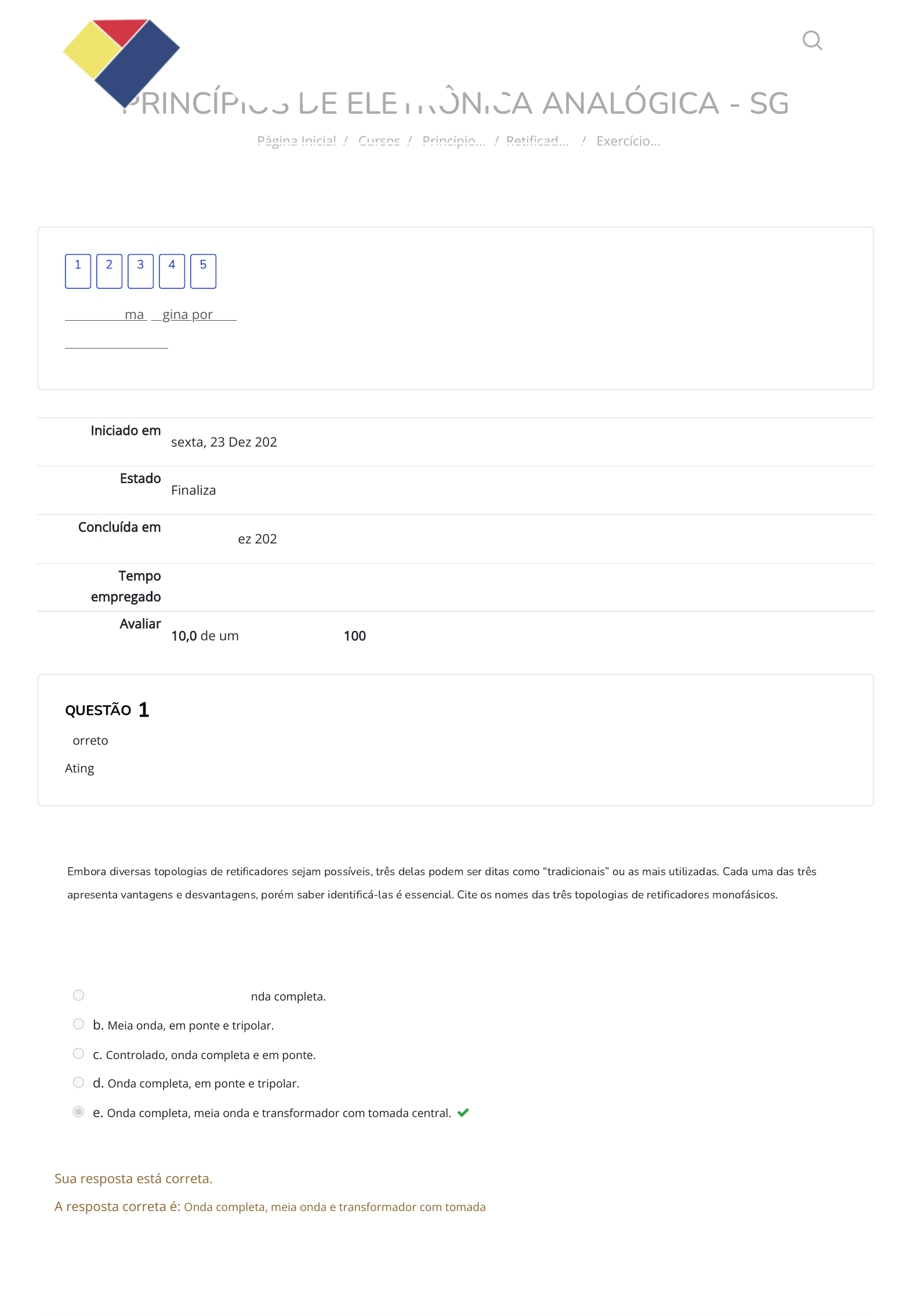23/12/2022 12:43 Exercício de Fixação - Retificadores monofásicos a diodo: Revisão da tentativa https://cpetead.com.br/mod/quiz/review.php?attempt=3366607&cmid=52154 1/4 PRINCÍPIOS DE ELETRÔNICA ANALÓGICA - SG Página Inicial / Cursos / Princípio… / Reti�cad… / Exercício… Iniciado em sexta, 23 Dez 2022, 13:30 Estado Finalizada Concluída em sexta, 23 Dez 2022, 13:40 Tempo empregado 9 minutos 53 segundos Avaliar 10,0 de um máximo de 10,0(100%) QUESTÃO Correto Atingiu 2,0 de 2,0 Mostrar uma página por vez Terminar revisão 1 2 3 4 5 1 Embora diversas topologias de reti�cadores sejam possíveis, três delas podem ser ditas como “tradicionais” ou as mais utilizadas. Cada uma das três apresenta vantagens e desvantagens, porém saber identi�cá-las é essencial. Cite os nomes das três topologias de reti�cadores monofásicos. Escolha uma opção: a. Controlado, meia ponte e onda completa. b. Meia onda, em ponte e tripolar. c. Controlado, onda completa e em ponte. d. Onda completa, em ponte e tripolar. e. Onda completa, meia onda e transformador com tomada central. Sua resposta está correta. A resposta correta é: Onda completa, meia onda e transformador com tomada central. https://cpetead.com.br/ https://cpetead.com.br/course/index.php https://cpetead.com.br/course/view.php?id=2000 https://cpetead.com.br/mod/quiz/view.php?id=52154 https://cpetead.com.br/mod/quiz/review.php?attempt=3366607&cmid=52154&showall=0 https://cpetead.com.br/mod/quiz/view.php?id=52154 https://cpetead.com.br/ 23/12/2022 12:43 Exercício de Fixação - Retificadores monofásicos a diodo: Revisão da tentativa https://cpetead.com.br/mod/quiz/review.php?attempt=3366607&cmid=52154 2/4 QUESTÃO Correto Atingiu 2,0 de 2,0 QUESTÃO Correto Atingiu 2,0 de 2,0 2 O uso de reti�cadores de onda completa é de ampla utilização na indústria e, quando se enseja o emprego deles, há uma consequente preocupação com a oscilação na tensão de saída, sendo uma solução a adoção de um �ltro RC. Dimensione um capacitor que apresente uma tensão de ripple máxima de 1% para um reti�cador de onda completa alimentado por uma fonte de tensão de 120 V/60Hz e que tem um resistor em paralelo de 500Ω. Escolha uma opção: a. 16700µF b. 1670µF c. 1,67µF d. 167µF e. 16,7µF Sua resposta está correta. A resposta correta é: 1670µF 3 Ao determinar que um reti�cador será empregado, uma das principais preocupações que você, como engenheiro projetista, deverá ter é como a operação de uma carga in�uenciará na operação como um todo.Para uma carga do tipo RLC, quais informações devem ser assumidas pelo projetista e como o capacitor in�uencia no circuito e na oscilação da tensão? Escolha uma opção: a. O comportamento do circuito é de um �ltro passa-baixa. b. Não há nenhum tipo particular de comportamento, a menos que seja instada uma resistência variável. c. Não há nenhum efeito perceptivo, pois o circuito RLC não é adequado para um reti�cador monofásico a diodo. d. O comportamento do circuito refere-se ao de um �ltro passa-faixa. e. A carga RLC deve ser analisada adequadamente; o comportamento de cada componente in�uenciará nos per�s de tensão e corrente. Sua resposta está correta. A resposta correta é: A carga RLC deve ser analisada adequadamente; o comportamento de cada componente in�uenciará nos per�s de tensão e corrente. 23/12/2022 12:43 Exercício de Fixação - Retificadores monofásicos a diodo: Revisão da tentativa https://cpetead.com.br/mod/quiz/review.php?attempt=3366607&cmid=52154 3/4 QUESTÃO Correto Atingiu 2,0 de 2,0 QUESTÃO Correto Atingiu 2,0 de 2,0 4 O projeto de reti�cadores deve levar em conta o tipo de carga, a potência da carga e o regime de operação. Ao construir um reti�cador monofásico, você percebe que a carga que ele terá apresenta um comportamento de grande oscilação da corrente. Nessa situação, o reti�cador não controlado deve adotar quais premissas? Escolha uma opção: a. O projeto desse reti�cador deve ignorar, ainda, as particularidades presentes na carga, de modo a assegurar que a oscilação da tensão não seja danosa para o circuito. b. Deve garantir que a corrente de trabalho seja su�ciente para operar em regime intermitente e que as oscilações não dani�quem os componentes. c. Deve impedir as oscilações por meio de um circuito LC para que, dessa forma, quaisquer movimentos abruptos da carga sejam amortecidos, resultando em melhor comportamento. d. Deve garantir que a corrente de trabalho seja su�ciente para aguentar, ao menos, 80% da carga total. e. Deve empregar técnicas de projeto que considerem essa oscilação, impedindo a formação de loops de corrente e aumento da tensão quando submetida às oscilações. Sua resposta está correta. A resposta correta é: Deve garantir que a corrente de trabalho seja su�ciente para operar em regime intermitente e que as oscilações não dani�quem os componentes. 5 De forma geral, todos os reti�cadores – não somente os monofásicos – apresentam um elemento capacitivo em sua saída DC. O objetivo de incluir um capacitor no circuito é: Escolha uma opção: a. aumentar a e�ciência térmica. b. reduzir a oscilação da tensão de saída. c. aumentar a oscilação da tensão de saída. d. aumentar a e�ciência global do reti�cador. e. servir como �ltro passa-alta. Sua resposta está correta. A resposta correta é: reduzir a oscilação da tensão de saída.