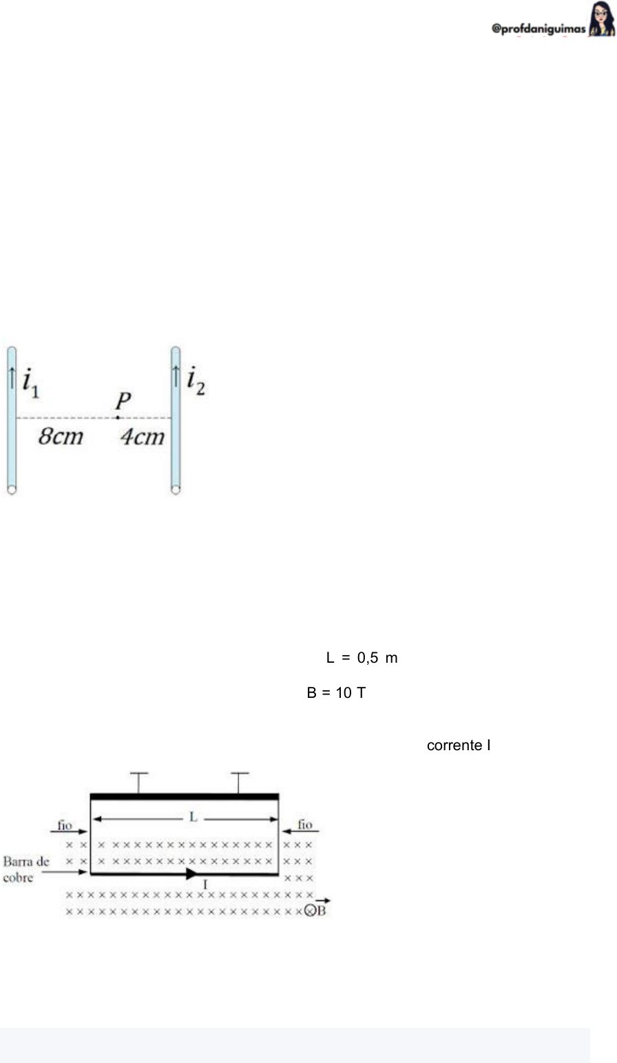 REVISÃO 2.0 • FORÇA MAGNÉTICA SOBRE O FIO 1) As primeiras observações experimentais de fenômenos magnéticos foram realizadas pelos gregos em uma região da Ásia Menor denominada de Magnésia. Eles verificaram que certo tipo de pedra denominada de magnetita (ou ímã natural) era capaz de atrair pedaços de ferro. Em 1820, o dinamarquês Hans Christian Oersted (1777-1851) observou que uma corrente elétrica percorrendo um fio condutor também produz campo magnético. Essa descoberta deu início à unificação dos fenômenos elétricos e magnéticos, originando o ramo da física denominado de eletromagnetismo. Para o caso de um fio condutor retilíneo percorrido por uma corrente elétrica, o campo magnético produzido em um ponto P, em torno do fio condutor, depende da permeabilidade magnética do meio, da intensidade da corrente elétrica e da distância do fio condutor ao ponto P. Considere a situação em que dois condutores retilíneos e paralelos são percorridos por corrente elétrica de intensidades i1 = 2A e i2 = 4A, conforme mostra a figura a seguir: Podemos afirmar que a razão entre as intensidades dos campos magnéticos B1/B2, produzidos pelos dois condutores retilíneos no ponto P, vale: a) 0,25 b) 0,5 c) 1 d) 2 e) 4 2) Uma barra fina de cobre, de comprimento L = 0,5 m e massa m = 100 g, está inicialmente suspensa por dois fios de massa desprezível. A barra está imersa em campo magnético uniforme e de intensidade B = 10 T, cuja orientação é perpendicular e entrando no plano da folha. A gravidade no local possui módulo g = 10 m/s². Para anular a tensão nos fios que suportam a barra de cobre, é necessário que uma corrente I seja aplicada no sentido indicado na figura abaixo. O valor da corrente I, em ampères, deve ser a) 0,2. b) 0,4. c) 0,3. d) 0,5. 3) Um fio condutor retilíneo tem comprimento L = 20 metros e transporta uma corrente elétrica contínua, igual a I = 0,7 A, em um local onde existe um campo magnético perpendicular e uniforme, cujo módulo vale B = 0,25 Tesla, conforme indica a figura abaixo. O módulo da força magnética exercida pelo campo magnético sobre o fio será: • INDUÇÃO ELETROMAGNÉTICA 1) Suponha que uma espira retangular de área igual a 2,4 x 10-1 m2 imersa em uma região onde existe um campo de indução magnética B, cuja intensidade é igual a 5 x 10- 2 T, perpendicular ao plano da espira. De acordo com as informações, determine o fluxo magnético através da espira. 2) Suponha que uma espira quadrada de lado igual a 2 cm seja colocada em um campo magnético uniforme cuja intensidade vale 2 T. Determine o fluxo magnético nessa espira quando ela for colocada perpendicularmente às linhas de campo magnético. a) Ф= 2,0008 Wb b) Ф= 3,0018 Wb c) Ф= 0,0048 Wb d) Ф= 0,0028 Wb e) Ф= 0,0008 Wb 3) Marque a alternativa correta a respeito da Lei de Lenz: a) A Lei de Lenz determina a relação entre a variação do fluxo magnético e a variação do tempo. b) Pela Lei de Lenz, pode-se determinar a força eletromotriz induzida em um circuito. c) A Lei de Lenz diz que a corrente elétrica induzida em um circuito é tal que sempre gera um campo magnético no mesmo sentido do campo externo. d) A Lei de Lenz diz que a corrente elétrica induzida em uma espira sempre gera um campo magnético oposto ao campo magnético variável que lhe deu origem. e) A Lei de Lenz é o motivo do sinal positivo da Lei de Faraday. Fluxo magnético: Força Eletromotriz: Transformadores da indução: Tensão N° de enrolamentos A lei de Lenz enuncia que, quando houver uma variação de fluxo magnético sobre um condutor fechado, surgirá, nesse condutor, um campo magnético que se oporá a tal variação. • TRANSFORMADORES 1) Marque a alternativa ERRADA. a) Transformadores são dispositivos eletromagnéticos que transformam o valor da tensão elétrica alternada, aplicada em sua entrada, para uma tensão alternada diferente na saída. b) Os transformadores podem ser usados tanto para aumentar quanto para diminuir o valor da tensão. c) Um transformador consiste em duas bobinas enroladas no mesmo núcleo de ferro. d) Um transformador consiste em uma bobina enrolada em dois núcleos de ferro. e) Em transformadores com dois enrolamentos, é comum denominá-los de enrolamento primário e enrolamento secundário. 2) Entre os dispositivos elétricos citados nas alternativas, qual o que só pode funcionar com corrente elétrica alternada? a) Rádio b) Transformador c) Lâmpada incandescente d) Chuveiro e) Ferro de passar roupa 3) Uma máquina de solda elétrica precisa operar com uma corrente elétrica de 400 A para que haja potência dissipada suficiente para fundir as peças metálicas. A potência necessária é dada por P =R.i2, onde R é a resistência dos eletrodos de solda. Com a intenção de obter esse valor de corrente elétrica, utiliza-se um transformador, que está ligado a uma rede elétrica cuja tensão vale 110 V, e pode fornecer um máximo de 40 A. Qual deve ser a razão do número de espiras entre o enrolamento primário e o secundário do transformador, e qual a tensão de saída? a) N1/N2 = 5; V = 9 b) N1/N2 = 10; V = 11 c) N1/N2 = 15; V = 15 d) N1/N2 = 20; V = 20 e) N1/N2 = 25; V = 22 4) A tensão elétrica fornecida pelas empresas energéticas em alguns estados do Brasil é 220V, porém muitos aparelhos domésticos trabalham com tensões bem inferiores e já possuem transformadores integrados. Supondo que um aparelho funcione com tensão elétrica de 20V e possua um transformador integrado com 1500 espiras no enrolamento primário. Quantas espiras são necessárias no enrolamento secundário para que a tensão não supere os 20V? Transformadores são dispositivos usados para abaixar ou aumentar a tensão e a corrente elétricas. Correntes tensão • GASES 1) Um cilindro com dilatação térmica desprezível possui volume de 25 litros. Nele estava contido um gás sob pressão de 4 atmosferas e temperatura de 227 ºC. Uma válvula de