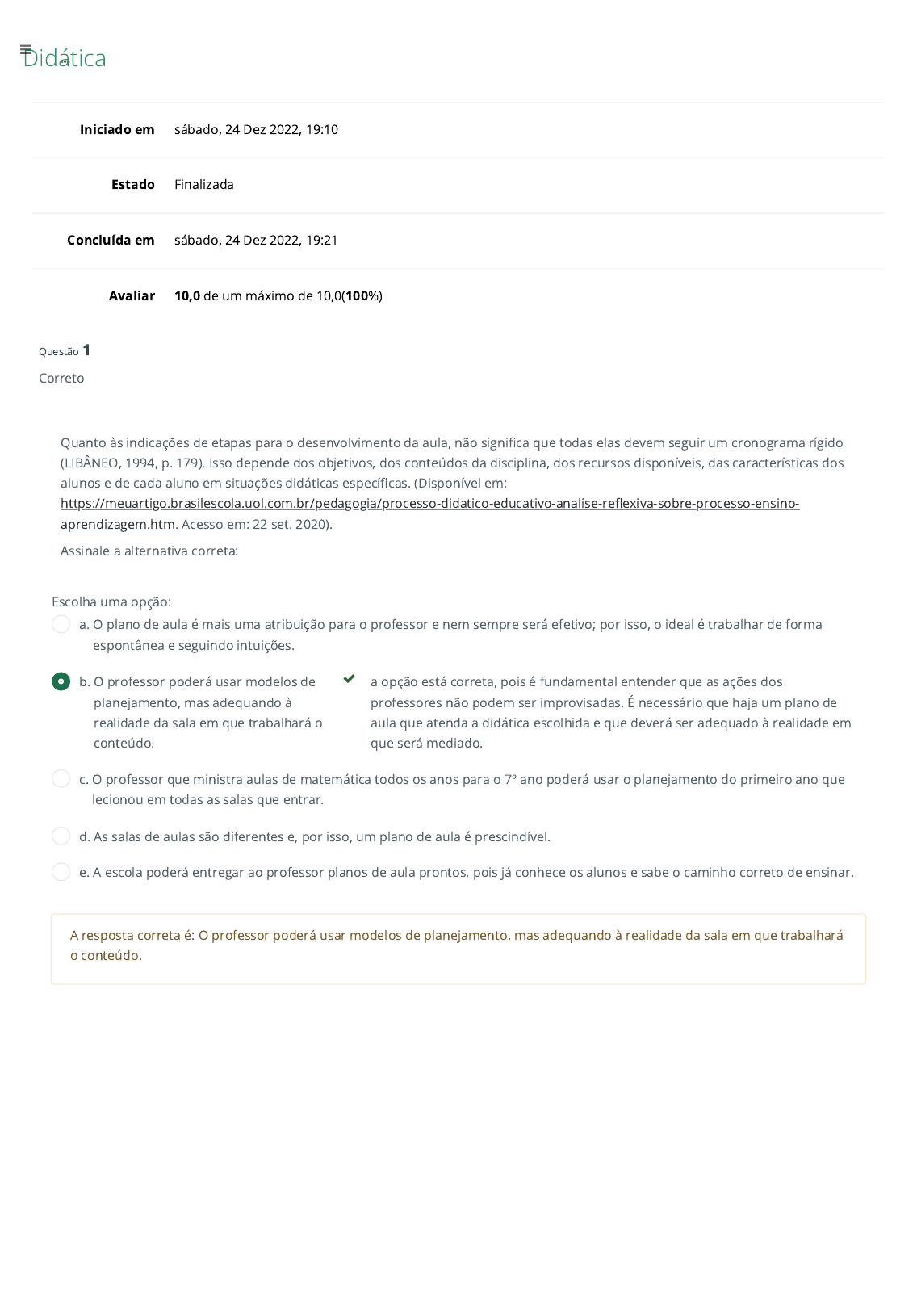 Didática Iniciado em sábado, 24 Dez 2022, 19:10 Estado Finalizada Concluída em sábado, 24 Dez 2022, 19:21 Avaliar 10,0 de um máximo de 10,0(100%) Questão 1 Correto Quanto às indicações de etapas para o desenvolvimento da aula, não signi�ca que todas elas devem seguir um cronograma rígido (LIBÂNEO, 1994, p. 179). Isso depende dos objetivos, dos conteúdos da disciplina, dos recursos disponíveis, das características dos alunos e de cada aluno em situações didáticas especí�cas. (Disponível em: https://meuartigo.brasilescola.uol.com.br/pedagogia/processo-didatico-educativo-analise-re�exiva-sobre-processo-ensino- aprendizagem.htm. Acesso em: 22 set. 2020). Assinale a alternativa correta: Escolha uma opção: a. O plano de aula é mais uma atribuição para o professor e nem sempre será efetivo; por isso, o ideal é trabalhar de forma espontânea e seguindo intuições. b. O professor poderá usar modelos de planejamento, mas adequando à realidade da sala em que trabalhará o conteúdo. a opção está correta, pois é fundamental entender que as ações dos professores não podem ser improvisadas. É necessário que haja um plano de aula que atenda a didática escolhida e que deverá ser adequado à realidade em que será mediado. c. O professor que ministra aulas de matemática todos os anos para o 7º ano poderá usar o planejamento do primeiro ano que lecionou em todas as salas que entrar. d. As salas de aulas são diferentes e, por isso, um plano de aula é prescindível. e. A escola poderá entregar ao professor planos de aula prontos, pois já conhece os alunos e sabe o caminho correto de ensinar. A resposta correta é: O professor poderá usar modelos de planejamento, mas adequando à realidade da sala em que trabalhará o conteúdo. https://meuartigo.brasilescola.uol.com.br/pedagogia/processo-didatico-educativo-analise-reflexiva-sobre-processo-ensino-aprendizagem.htm https://aula.fael.edu.br/ Questão 2 Correto É na Carta da Transdisciplinaridade, produzida no I Congresso Mundial de Transdisciplinaridade, em 1994, realizado em Arrábida, Portugal – com fundamental colaboração do Centro de Pesquisa Internacional sobre Pesquisas de Tendência Econômica (Ciret) e apoio da Organização das Nações Unidas para a Educação, a Ciência e a Cultura (Unesco) – em que a de�nição de conceito transdisciplinar é apresentada: “Artigo 3º: […] A Transdisciplinaridade não procura a dominação de várias disciplinas, mas a abertura de todas as disciplinas ao que as atravessa e as ultrapassa. […] Artigo 7º: A Transdisciplinaridade não constitui nem uma nova religião, nem uma nova �loso�a, nem uma nova metafísica, nem uma ciência das ciências.” (Disponível em: http://www.helioteixeira.org/ciencias-da-aprendizagem/o-que-e-transdisciplinaridade/. Acesso em: 22 set. 2020.). Podemos a�rmar que a transdisciplinaridade consiste em: Escolha uma opção: a. No mesmo que interdisciplinaridade. b. Ensinar e aprender conhecendo o que os demais professores farão. c. Ensinar e aprender partindo das partes para o todo. d. Ensinar e aprender partindo do todo para as partes. a opção está correta, pois na transdisciplinaridade os conhecimentos atualmente fragmentados são articulados com o objetivo de entender os fenômenos como parte de um todo. Dessa forma, várias disciplinas se unem para um exercício amplo de cognição. e. Entender as disciplinas como parte da gama de saberes que devem ser subdivididos. A resposta correta é: Ensinar e aprender partindo do todo para as partes. http://www.helioteixeira.org/ciencias-da-aprendizagem/o-que-e-transdisciplinaridade/ https://aula.fael.edu.br/ Questão 3 Correto “A verdadeira escuta não diminui em nada a capacidade de exercer o direito de discordar, de se opor ou se posicionar. Pelo contrário, é escutando bem que me preparo para melhor colocar-me, ou melhor, situar-me do ponto de vista das ideias.” (Disponível em: http://pepsic.bvsalud.org/scielo.php?script=sci_arttext&pid=S1676-73142006000100005. Acesso em: 22 set. 2020.). A citação sinaliza: I – A importância do diálogo na educação. II – Que só existe uma forma de trabalhar bem: escutando. III –Que o diálogo entre o professor o e aluno abre espaço para melhor compreensão dos dois lados sobre diversos assuntos. Marque a alternativa que apresenta a resposta correta: Escolha uma opção: a. I. b. III. c. II. a opção está correta, pois somente o item II está errado, de modo que existem formas variadas para trabalhar bem; depende do objetivo e caracterização do aluno. Os itens I e III estão corretos, pois é fundamental o diálogo na educação, sobretudo na didática. d. I, II e III. e. I e III. A resposta correta é: II. http://pepsic.bvsalud.org/scielo.php?script=sci_arttext&pid=S1676-73142006000100005 https://aula.fael.edu.br/ Questão 4 Correto Questão 5 Correto Normalmente, a avaliação – um dos conteúdos operacionais da didática – é vista como uma forma de repressão, em que caso o aluno não atinja a nota estabelecida como boa, será rotulado como ine�ciente, preguiçoso, desinteressado e que não estuda. Em relação à avaliação, podemos considerar como verdadeira ou falsa as seguintes a�rmativas: ( ) Toda avaliação deve estar diretamente ligada ao objetivo de aprendizagem e nortear o trabalho do professor. ( ) A avaliação mais difícil é aquela que atribui uma nota ao aluno ao �nal de um período de tempo. Essa nota deve dar um veredito sobre o aluno. ( ) As questões de uma avaliação devem estar claras e organizadas, sem a intenção de confundir os alunos. Caso sejam feitas perguntas sujeitas à opinião, deverão ser aceita quaisquer respostas. Considerando essas a�rmações, pode-se a�rmar que a sequência seria verdadeira (V) ou falsa (F) na seguinte ordem: Escolha uma opção: a. V, V, F. b. V, F, V. a opção está correta, pois a sequência correta é V, F, V. A primeira é verda