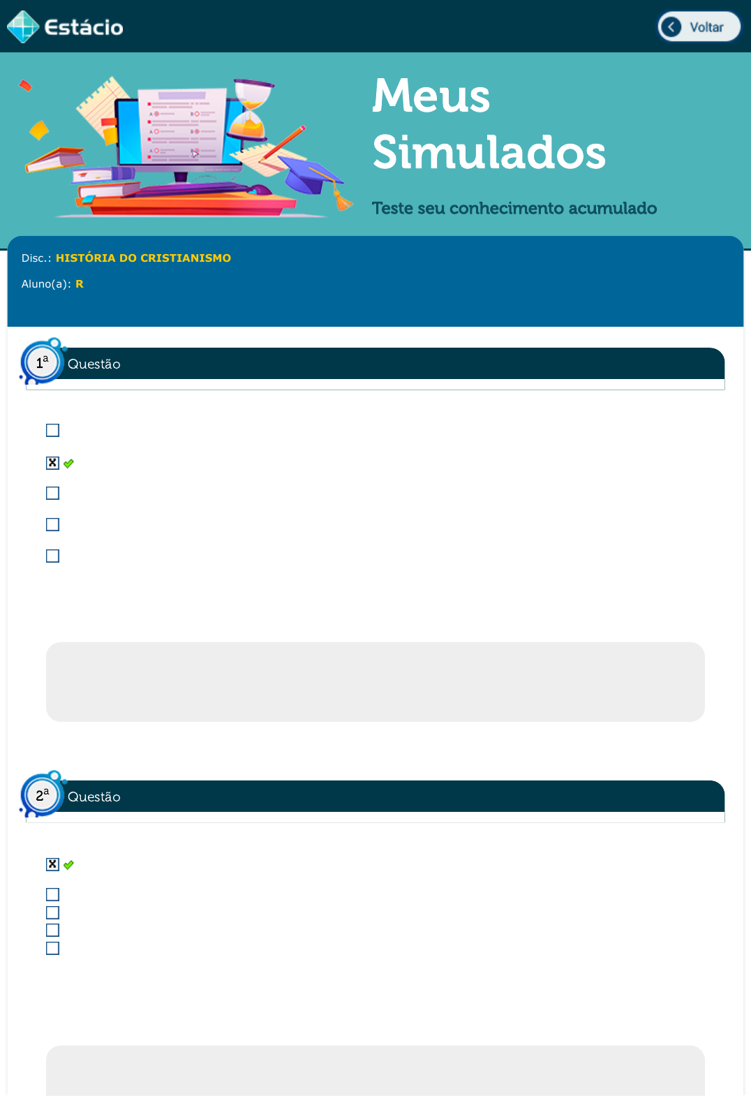 Meus Simulados Teste seu conhecimento acumulado Disc.: HISTÓRIA DO CRISTIANISMO Aluno(a): REINALDO DIAS PEREIRA 202111188414 Acertos: 10,0 de 10,0 17/12/2022 Acerto: 1,0 / 1,0 Os estudos relativos à religião ganharam um forte impulso no âmbito acadêmico: No século XV, com a descoberta da América, que fez com que os europeus tivessem contato com outras religiões além do Cristianismo. No século XIX, quando o colonialismo colocou os europeus em contato com sociedades na África, na Ásia e na América, cujas formas de religiosidade nelas presentes passaram a ser estudadas. No século XVIII, com a Revolução Industrial, que inaugurou uma perspectiva mais racionalista acerca da religião. No século XXI, com o desenvolvimento do neoliberalismo e de uma perspectiva globalizante para o entendimento das sociedades e das suas religiosidades. No século XII, com a Reforma Gregoriana, quando a Igreja Católica inaugurou uma visão teocrática de poder e uniu-se ao Estado monárquico. Respondido em 17/12/2022 20:57:03 Explicação: Os estudos relativos à religião ganharam um forte impulso no âmbito acadêmico no século XIX, quando o colonialismo colocou os europeus em contato com sociedades na África, na Ásia e na América, cujas formas de religiosidade nelas presentes Acerto: 1,0 / 1,0 A importância do Concílio de Nicéia, realizado em 325 a. C., é atribuída ao fato de: Poder ser considerado como a primeira tentativa oficial da igreja de estabelecer um consenso quanto às questões dogmáticas. Ter sido o primeiro concílio que contou com a participação exclusiva das autoridades episcopais. Ter sido o momento em que a Igreja decidiu não investir na formulação das leis canônicas. Ter permitido a introdução dos princípios do arianismo nos dogmas católicos. Ter sido palco da definição dogmática de que Cristo, ao humanizar-se, abandonou a sua natureza divina Respondido em 17/12/2022 20:57:45 Explicação: Questão1 a Questão2 a https://simulado.estacio.br/alunos/inicio.asp javascript:voltar(); A importância do Concílio de Nicéia, realizado em 325 a. C., é atribuída ao fato de poder ser considerado como a primeira tentativa oficial da igreja de estabelecer um consenso quanto às questões dogmáticas. Acerto: 1,0 / 1,0 Sobre reconhecimento do Cristianismo no contexto da história do Império Romano, é correto afirmar que o caráter público das reuniões mantidas pelos cristãos, seu apego às categorias sociais e honras terrenas, sua participação no culto imperial, a propaganda exaltada em defesa da vida militar e o apoio à escravidão, tudo isso levou o Cristianismo a ser reconhecido como a religião oficial do Império Romano. como nova religião, o Cristianismo gradualmente ganhou um caráter universal; a defesa da igualdade e a promessa de salvação após a morte deram, de início, um novo sentido à vida de setores populares urbanos e logo se estenderam aos campos e às classes de proprietários. Aos poucos, o Cristianismo adotou uma organização hierárquica, nos moldes do sistema administrativo imperial, até que, em 313, pelo Edito de Milão, o Estado romano reconheceu oficialmente a religião cristã. após a morte de Jesus, rapidamente o Cristianismo se propagou em Roma, até ser, em 46, declarado como religião oficial do Império, tendo à frente Pedro, o pescador da Galileia, como o primeiro papa da Igreja Católica Apostólica Romana. após ter sido batizado por Paulo III, em 275, o imperador Constantino I declarou o Cristianismo como religião oficial do Império Romano. temendo que os cristãos pudessem estimular ainda mais as rebeliões de escravos e, com isso, aprofundar a crise do sistema econômico escravista, o Império reconheceu o Cristianismo como religião em 330, mas cuidou de transferir seus seguidores para Constantinopla, a recém-fundada capital do Império Romano do Oriente. Respondido em 17/12/2022 21:00:05 Explicação: como nova religião, o Cristianismo gradualmente ganhou um caráter universal; a defesa da igualdade e a promessa de salvação após a morte deram, de início, um novo sentido à vida de setores populares urbanos e logo se estenderam aos campos e às classes de proprietários. Aos poucos, o Cristianismo adotou uma organização hierárquica, nos moldes do sistema administrativo imperial, até que, em 313, pelo Edito de Milão, o Estado romano reconheceu oficialmente a religião cristã. Acerto: 1,0 / 1,0 No ano 313 d.C., o imperador Constantino reconheceu o cristianismo como a religião oficial do Império Romano, por meio do Édito de Milão. Sobre o cristianismo na Antiguidade, é INCORRETO afirmar: A partir do Édito de Milão, ficou estabelecido que somente autoridades religiosas poderiam determinar os rumos da Ig Por serem politeístas, os romanos inicialmente resistiram em aceitar o monoteísmo cristão. Os primeiros cristãos sofreram grandes perseguições por motivos políticos. Durante a Antiguidade, ocorreram conversões ao cristianismo de muitos povos chamados ¿bárbaros¿. No início de sua formação, a Igreja Cristã baseou sua estrutura na organização do Império Romano, reproduzindo também sua divisão de poder. Respondido em 17/12/2022 21:01:53 Explicação: A partir do Édito de Milão, ficou estabelecido que somente autoridades religiosas poderiam determinar os rumos da Ig Questão3 a Questão4 a Acerto: 1,0 / 1,0 As ordens mendicantes foram formadas no século XIII com o objetivo de: Difundir o espírito messiânico entre a população urbana. Difundir os princípios de uma religiosidade que atendesse às necessidades da população urbana, principalmente através das práticas caritativas. Estimular a prática mendicante entre os elementos da nobreza. Construir uma religiosidade própria para o campesinato. Oferecer aos monges a oportunidade de exercer a sua espiritualidade cada vez mais distante da sociedade. Respondido em 17/12/2022 21:21:28 Explicação: As ordens mendicantes fora