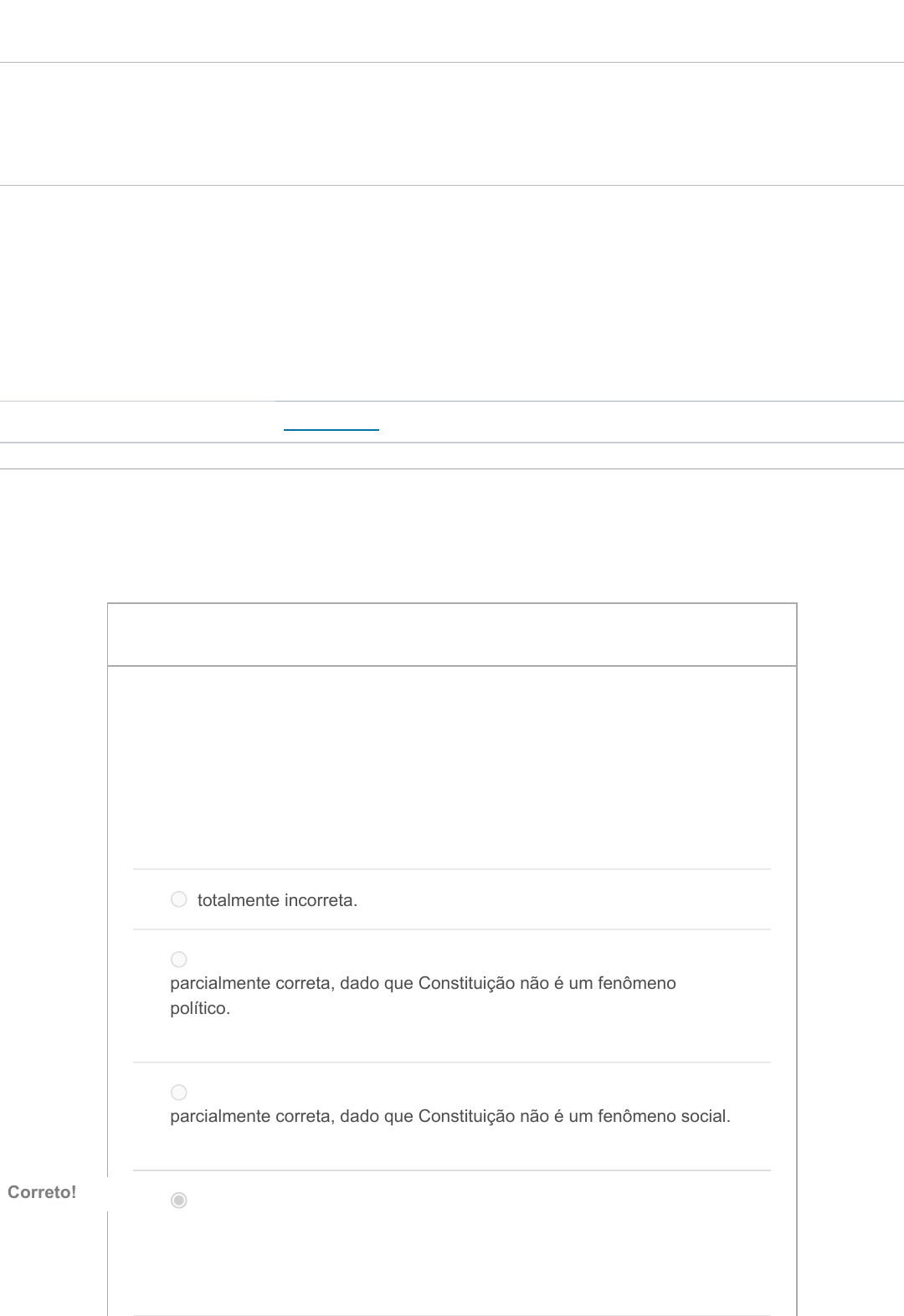 AS Geral Entrega Sem prazo Pontos 10 Perguntas 20 Disponível 20 set em 0:00 - 30 set em 23:59 Limite de tempo Nenhum Tentativas permitidas 3 Este teste foi travado 30 set em 23:59. Histórico de tentativas Tentativa Tempo Pontuação MAIS RECENTE Tentativa 1 165 minutos 8,5 de 10 Pontuação desta tentativa: 8,5 de 10 Enviado 29 set em 23:42 Esta tentativa levou 165 minutos. 0,5 / 0,5 ptsPergunta 1 Constituição é um fenômeno jurídico-político-social vital para o entendimento da sociedade moderna. A afirmação em foco está totalmente incorreta. parcialmente correta, dado que Constituição não é um fenômeno político. parcialmente correta, dado que Constituição não é um fenômeno social. totalmente correta. Correto!Correto! https://cruzeirodosul.instructure.com/courses/30016/quizzes/75393/history?version=1 parcialmente correta, dado que Constituição é importante para entender o Direito, apenas. A frase do enunciado está completamente correta. 0,5 / 0,5 ptsPergunta 2 Assinale a alternativa que traz uma afirmação INTEGRALMENTE CORRETA: Na Idade Média houve uma época chamada de grande codificação, com notável desenvolvimento do processo judicial como um todo. O processo na Idade Média era de fonte única, no que toca à aplicação do Direito. Havia um órgão estatal centralizado, similar ao atual Poder Judiciário, que cuidava dessa atividade. O processo judicial na Idade Média estava influenciado pela razão e intelectualidade, de modo que socialmente eram tempos de acentuado antropocentrismo. Na Idade Média houve um processo marcadamente religioso, mas cuja matriz era fundamentalmente greco-romana, inclusive com o emprego de mediações. O processo judicial na Idade Média estava ainda influenciado pela religião, de modo que socialmente eram tempos de acentuado teocentrismo. Correto!Correto! Apenas a alternativa correta traz elementos integralmente verdadeiros. 0,5 / 0,5 ptsPergunta 3 Os direitos fundamentais de primeira geração eram chamados de “negativos”, pois visavam negar tudo o que ofendesse a dignidade humana. negavam a possibilidade de qualquer coação estatal sobre o ser humano. funcionavam como verdadeiros limites à atuação do Estado. Correto!Correto! agiam no sentido de negar validade às ações arbitrárias. eram dispostos como respostas negativas a uma arbitrariedade positiva. Inicialmente, os chamados direitos fundamentais de primeira geração funcionavam como um verdadeiro anteparo à atuação do Estado em relação ao indivíduo. 0,5 / 0,5 ptsPergunta 4 Assinale a alternativa que menciona documentos considerados precursores das constituições modernas: Lei das Doze Tábuas e Dez Mandamentos. Habeas Corpus Act e Carta Sarracena. Petition of Rights e Bill of Rights. Correto!Correto! Lei das Doze Tábuas e Bill of Rights. Dez Mandamentos e Carta Sarracena. Somente a alternativa correta traz documentos precursores das constituições. As demais opções trazem documentos históricos, apenas, enquanto a Carta Sarracena não existe. 0,5 / 0,5 ptsPergunta 5 A partir do século XVIII, as constituições passaram a ser vistas como principal instrumento de organização social e política de um Estado e de uma sociedade. Esta afirmação está totalmente correta. Correto!Correto! parcialmente correta, pois o verdadeiro seria a partir do século XV. parcialmente correta, pois o verdadeiro seria a partir do século XVI. totalmente incorreta. parcialmente correta, pois a Constituição é importante apenas para organizar o Estado. A frase do enunciado está completamente correta. 0,5 / 0,5 ptsPergunta 6 Com relação às origens do processo judicial, é INCORRETO afirmar que vigorava, na Idade Média, o Direito Natural, de modo que o homem era um ser divino, uma criatura divina que fruía – gozava – seus direitos diretamente da natureza. havia um sistema processual com múltiplas fontes, de modo que uma mesma questão poderia ser resolvida pelo rei ou Papa de modos totalmente distintos, com procedimentos igualmente díspares. o homem era uma criatura divina que, não obstante, fruía seus direitos das leis canônicas e de éditos reais. Correto!Correto! na Idade Média vigorava ainda forte teocentrismo e isso influenciou os processos e procedimentos, de modo que era comum que as questões fossem submetidas aos chamados “julgamentos divinos”. os procedimentos processuais em geral adotados na Idade Média eram ainda muito marcados pela religião e moral. Sendo o homem uma criatura divina – segundo o Direito Natural – fruía ou deveria fruir seus direitos diretamente da natureza. 0,5 / 0,5 ptsPergunta 7 O grande mote agora é a busca do processo justo – e não de um processo que simplesmente atenda ou cumpra as exigências legais, no mais das vezes meramente formais ou procedimentais. A frase em foco está totalmente correta. Correto!Correto! parcialmente correta, pois o processo justo deve ser uma consequência – e não uma meta. parcialmente correta, pois a formalidade independe da busca de um processo justo. totalmente incorreta. parcialmente correta, pois o processo justo não é uma busca atual – mas já antiga. A frase do enunciado está completamente correta. 0,5 / 0,5 ptsPergunta 8 No campo do processo, o juiz “boca da Lei”, limitado por definição, passa a ser colocado em xeque, assim como o próprio Estado liberal, tido como excessivamente neutro, abstrato e indiferente às questões sociais. O presente raciocínio está parcialmente correto, pois não existe, doutrinariamente, a expressão juiz “boca da Lei”. totalmente incorreto. parcialmente correto, pois o Estado neutro e abstrato era o Estado socialista. parcialmente correto, pois o juiz “boca da Lei” era vinculado ao Estado social – e não liberal. totalmente correto. Correto!Correto! A frase do enunciado está completamente correta. 0,5 / 0,5 ptsPergunta 9 O processo civil em um Estado democrático de direito deve ser entendido como uma parceri