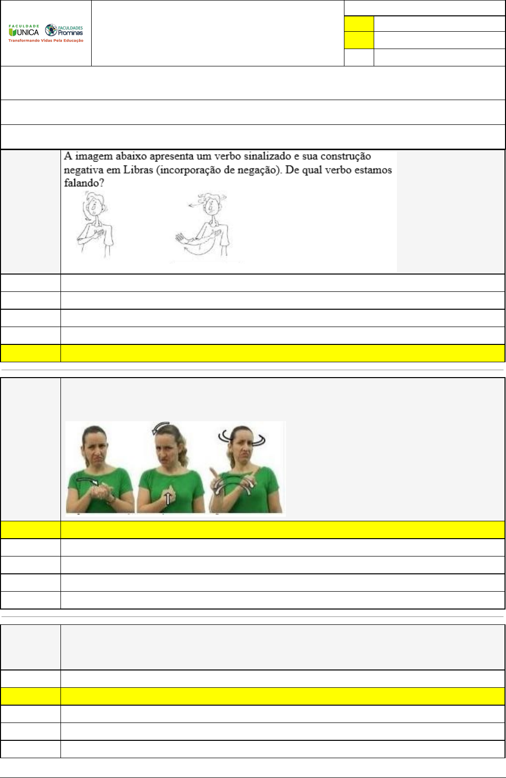 Pincel Atômico - 26/12/2022 20:15:40 1/3 Exercício Caminho do Conhecimento - Etapa 24 (21305) Atividade finalizada em 26/12/2022 20:15:19 (635915 / 1) LEGENDA Resposta correta na questão # Resposta correta - Questão Anulada X Resposta selecionada pelo Aluno Disciplina: PRÁTICA PEDAGÓGICA INTERDISCIPLINAR: DEFICIÊNCIA AUDITIVA - LIBRAS NA SALA DE AULA [779743] - Avaliação com 8 questões, com o peso total de 1,11 pontos [capítulos - 6] Turma: Segunda Graduação: Segunda Graduação 6 Meses - Licenciatura em Educação Especial - Grupo: FPD-FEV2022 - SGegu0A181222 [80112] Aluno(a): 91386855 - JARDIEL JOSÉ DE LIMA - Respondeu 1 questões corretas, obtendo um total de 0,14 pontos como nota [359305_132179] Questão 001 Falar. X Chamar. Querer. Conversar. Gostar. [359303_132963] Questão 002 (INSTITUTO MACHADO DE ASSIS -2018 - Adaptada) A Língua de Sinais utiliza as expressões faciais e corporais para estabelecer tipos de frases, como as entonações na língua portuguesa. A imagem abaixo trata de qual tipo de frase? Frase negativa. X Frase agramatical. Frase exclamativa. Frase afirmativa. Frase interrogativa. [359303_132968] Questão 003 (IFB -2017) A sintaxe da Libras, segundo Quadros & Karnopp (2004), possui particularidades em relação à modalidade linguística. Marque a alternativa que classifica CORRETAMENTE a organização sintática da Libras. Modalidade Linear. Modalidade Espacial. X Modalidade Cinética. Modalidade Locativa. Modalidade Vocal. Pincel Atômico - 26/12/2022 20:15:40 2/3 [359304_132169] Questão 004 X Frase negativa. Frase afirmativa Frase agramatical. Frase interrogativa. Frase exclamativa [359303_132970] Questão 005 (COPESE- UFPI – 2018) Sobre a ordem das frases na Língua Brasileira de Sinais, é possível afirmar que: 1. todas as frases com a estrutura SVO são gramaticais. 2. a estrutura OSV é a estrutura utilizada no processo de topicalização. 3. a estrutura SOV é utilizada para a construção de foco. 4. frases com a estrutura VOS são agramaticais. Estão CORRETAS as afirmações: X 1, 2, 3 e 4. Apenas 1, 2 e 3. Apenas 1, 2 e 4. Apenas 2, 3 e 4. Apenas 1, 3 e 4. [359303_132967] Questão 006 (IFCE - 2017) "Ordem das palavras é um conceito básico relacionado com a estrutura da frase de uma língua. O fato de que as línguas podem variar suas ordenações de palavras apresenta um papel significante nas análises linguísticas”. QUADROS, R.; KARNOPP, L. Língua de Sinais Brasileira: Estudos Linguísticos. Artmed, 2004. Sobre a sintaxe e a ordem das palavras na Libras, de acordo com Quadros e Karnopp (2004), é considerada a ordem mais básica: VENDER ANA BICICLETA. X BICICLETA VENDER ANA. <BICICLETA>top ANA VENDER. ANA VENDER BICICLETA. VENDER BICICLETA <ANA>foco. Pincel Atômico - 26/12/2022 20:15:40 3/3 [359303_132964] Questão 007 (UFMT 2017) A Libras possui diversas regras gramaticais, um aspecto dessa língua de modalidade visual-espacial é o fenômeno de incorporação. Um processo produtivo na língua de sinais brasileira é a incorporação da negação. Sobre esse processo, analise as afirmativas abaixo: I. Na Libras, pode ocorrer a incorporação da negação em alguns verbos, que, com um movimento contrário, caracteriza a negação incorporada, como nos verbos QUERER/QUERER-NÃO. II. Em todos os verbos na Libras, a incorporação de negação é feita pelo indicador movimentando-se de um lado para outro, representando o sinal de NÃO logo após o sinal a ser negado. III. Outra forma de incorporação de negação pode ocorrer simultaneamente ao movimento ou à expressão corporal, são exemplos TER e NÃO-TER, PODER e NÃO-PODER. Está correto o que se afirma em: II e III, apenas. II, apenas. I e III, apenas. X I, II e III. Nenhuma das afirmativas está correta. [359304_132172] Questão 008 “Eu dirijo bem” X “Nossa, susto!” “Que bonito!” “Que carro bonito!” “Carro feio!”