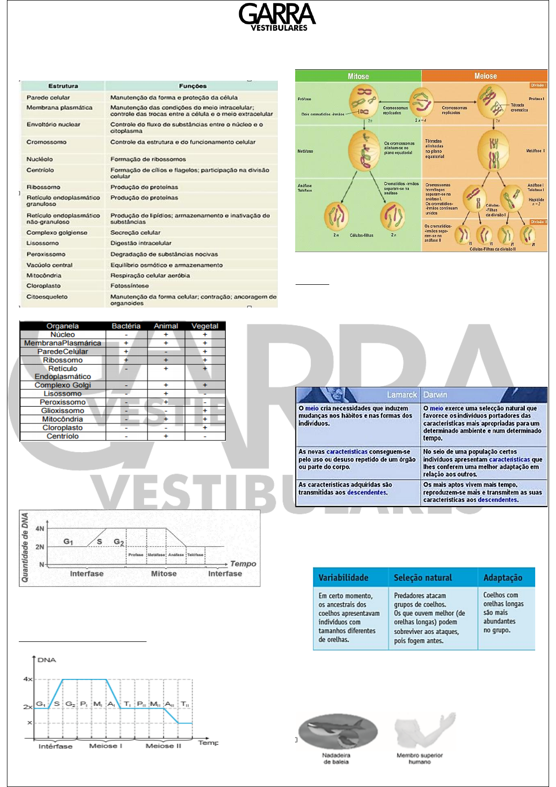 RESUMÃO DO WAGUIM BIOLOGIA Citologia Mitocôndria e cloroplastos: teoria da endossimbiose-autoduplicação, Ribossomos mais parecidos com os dos procariotos DNA mitocondrial de origem materna. Divisão celular Variação da quantidade de DNA mitose PRO ME to ANA TELEFO nar Pontos de checagem: Variação da quantidade de DNA meiose Na meiose 1- crossing-over: aumento de variabilidade Evolução: Evidências 1.Fixismo ou criacionismo 2.Evolução 3.Evidências da evolução biológica Fósseis ;Anatomia comparada ; Embriologia comparada;Bioquímica comparada;Órgãos vestigiais lamarckismo e darwinismo 1.Lamarckismo-Lei do uso e desuso;Lei da herança dos caracteres adquiridos 2.Darwinismo –Seleção natural 3. Neodarwinismo: Fontes de variabilidade (mutações e recombinação genética) Seleção natural Adaptação Isolamento geográfico Especiação: Irradiação adaptativa-homologia RESUMÃO DO WAGUIM BIOLOGIA Convergência adaptativa-analogia Metabolismo celular Comparação respiração aeróbica x fermentação Fotossíntese Fatores limitantes Ponto de compensação fótico- Fotossíntese=respiração Genética 1º Lei- Monohibridismo, pureza dos gametas Heredograma Dominância incompleta-planta margarida ( vermelho x branco=rosa) Codominância-vermelho x amarelo-planta com as duas cores Genes letais- acondroplasia (AA morre) Alelos múltiplos- C>cch>ch>ca Sistema AB0 Possíveis doadores Eritroblastose fetal: Mãe Rh-, filho Rh+, pai Rh+ 2º lei: Diibridíssimo, segregação independente RESUMÃO DO WAGUIM BIOLOGIA Herança quantitativa Herança ligada ao sexo Alterações cromossômicas 1.População em equilíbrio de Hardy-Weinberg População muito grande •População livre de mutações •População livre da ação da seleção natural •População em que não ocorrem migrações •População pan-mítica (acasalamentos ao acaso) 2.As frequências gênicas e genotípicas são constantes na população em equilíbrio Frequências gênicas: f(A) = p f(a) = q p + q = 1,0 Frequências genotípicas: f(AA) = p² f(Aa) = 2pq f(aa) = q² p² + 2pq + q² = 1,0 3.Frequência de um gene na população Genótipos No de indivíduos AA 3.600 Aa 6.000 Aa 2.400 Total 12.000 Clonagem reprodutiva Clonagem terapêutica Imunidade Defesa do organismo contra micro-organismos, substâncias tóxicas, células alteradas e tecidos estranhos. Anticorpo: proteína produzida pelos linfócitos (plasmócitos) para combater um antígeno. Antígeno: proteína ou polissacarídeo estranho que estimula a produção de anticorpos. Etapas da resposta imunológica Primeira etapa: entrada do agente infeccioso → migração dos leucócitos (diapedese) → fagocitose Segunda etapa: sensibilização dos linfócitos pelo antígeno → formação dos plasmócitos → produção de anticorpos → aquisição de memória imune Tipos de imunização Ativa: o próprio organismo produz os anticorpos na • presença do antígeno. Natural: cura de uma doença Artificial: vacina (função profilática, ação lenta e efeito duradouro) Resposta primária: pequena produção de anticorpos após a 1a dose de antigeno Resposta segundaria: grande produção de anticorpos após a 2a dose do antígeno, graças à presença das células de memória imune Passiva: os anticorpos prontos, produzidos em outro organismo, são fornecidos ao indivíduo. Natural: gestação (placenta) e amamentação (colostro e leite materno) Artificial: soro imune (função terapêutica, ação rápida e efeito passageiro) RESUMÃO DO WAGUIM BIOLOGIA Digestão Respiração Sistema nervoso RESUMÃO DO WAGUIM BIOLOGIA Circulação Sangue chega no átrio direito (AD) pelas veias cavas inferior e superior. Do AD, o sangue segue para o ventrículo direito (VD), passando pela válva tricúspide. Do VD, o sangue passa para as artérias pulmonares e o sangue, rico em CO2 (venoso), chega aos pulmões, onde ocorre hematose e o sangue rico em O2 (arterial) volta ao coração pelas veias pulmonares. As veias pulmonares desembocam no átrio esquerdo (AE) e o sangue passa pela válva mitral e chega ao ventrículo esquerde (VE), de onde é bombeado, através da artéria aorta, para todo o corpo. Glóbulos vermelhos: hemácias-transporte de gases Glóbulos brancos: leucócitos-imunidade e defesa Plaquetas: coagulação sanguínea Ciclo menstrual ECOLOGIA Organização da vida Átomo→molécula→organela→célula→tecido→órgão→ sistema→organismo→população→comunidade→ecossistema Ecossistema Comunidade ou biocenose: seres vivos Fatores abióticos ou biótopo: luz, temperatura, água, gases, sais Conceitos Hábitat: “endereço” da espécie (onde vive) Nicho: “profissão” da espécie (atividade que realiza) 1.Níveis tróficos Produtores: autótrofos. Ex.: plantas e algas Consumidores: heterótrofos. Ex.: animais Decompositores: heterótrofos que transformam moléculas orgânicas em inorgânicas. Ex.: bactérias e fungos Teia alimentar Fluxo de energia Unidirecional e acíclico A energia disponível diminui de um nível trófico para outro na cadeia alimentar Eutrofização Excesso de nutrientes na água → Proliferação de algas → Aumento da decomposição → Aumento da demanda bioquímica de oxigênio (DBO) → Redução do teor de O2 → Morte dos seres aeróbicos → Sobrevivem somente os seres anaeróbicos. Mercúrio Comum em áreas industriais e de garimpo, causa le-• sões ao sistema nervoso. Agrotóxicos (DDT) Contaminação de alimentos Morte de insetos úteis Destruição do húmus Seleção de linhagens resistentes dos insetos-alvo Magnificação trófica (efeito cumulativo) Aumento da concentração de substâncias não-biodegradáveis (DDT, mercúrio etc.) ao longo de uma cadeia alimentar Produtividade primária PPB (produtividade primária bruta): fotossíntese (total) R (respiração): consumo (atividades vitais) PPL (produtividade primária líquida): disponível para os consumidores (saldo) RESUMÃO DO WAGUIM BIOLOGIA