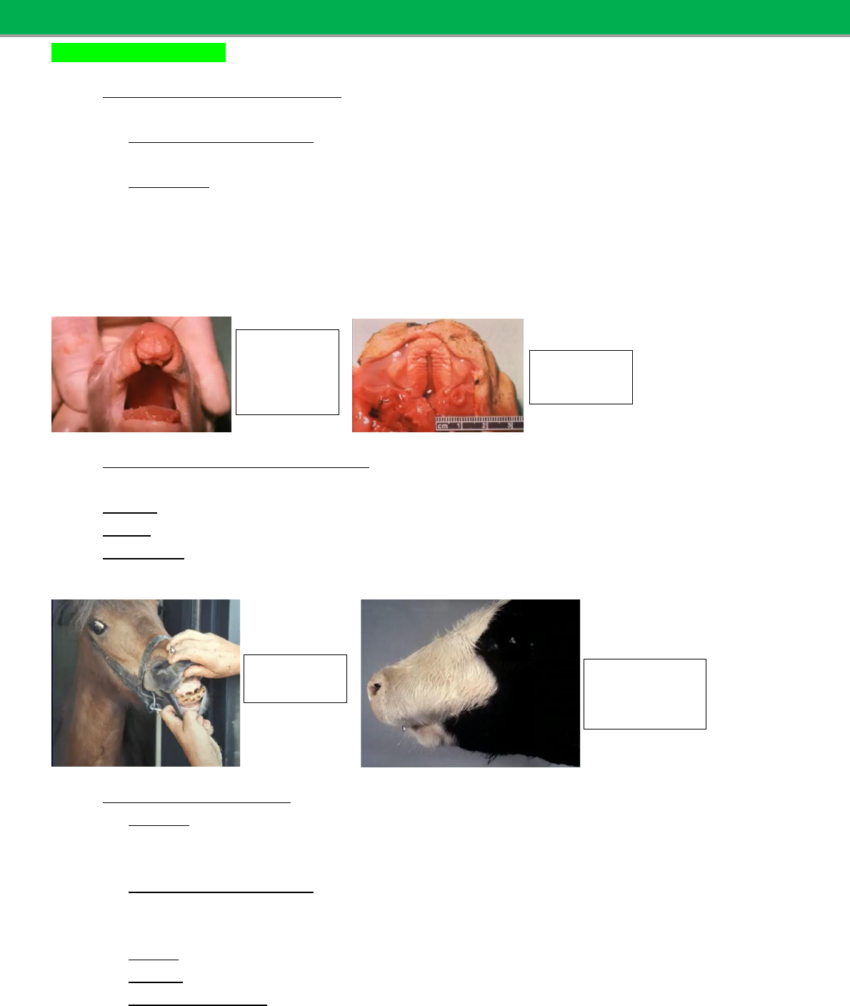 SISTEMA DIGESTÓRIO CAVIDADE ORAL ALTERAÇÕES CONGÊNITAS *quanto menos saliva mais viscosidade • LÁBIO LEPORINO E PALATO FUNDIDO: são encontrados com mais frequência nas raças de cães braquicefálicos Lábio leporino (queilosquise): tem origem idiopática, ou seja, muitas das vezes, a causa não é reconhecida, ou em alguns casos é de origem hereditária Palatosquise: tem origem hereditária, ou pode estar associada com ingestão de substancias toxicas ou drogas esteroidais durante a gestação da mãe. Possíveis sequelas: nela há uma comunicação das cavidades nasal e oral, então, durante o aleitamento os filhotes podem ter dificuldade de fazer sucção do leite ou até mesmo conseguirem, mas ao chegar na cavidade nasal ser aspirado, então uma das consequências seria uma inanição pela falta de alimentação ou um processo inflamatório nos pulmões chamado pneumonia aspirativa • BRAQUIGNATISMO SUPERIOR E INFERIOR: braqui = redução; gnatismo = mandíbula/maxila, sendo a superior da maxila e a inferior da mandíbula Superior: afeta em maior quantidade cães e suínos Inferior: também conhecido como micrognatia, afeta em maior quantidade bovinos e cães de nariz longo Prognatismo: há mandíbula aumentada, sendo que os incisivos inferiores se projetam além dos superiores, ocorrendo o contrário do braquignatismo • ALTERAÇÕES DE COLORAÇÃO Melanina: pode apresentar pontos enegrecidos/escurecidos na mucosa (focal ou difusa) e não tem relação com doenças, sendo comum em cães jovens com manchas que ao passar do tempo irão confluir e, quando mais velhas, sua cavidade oral está completamente enegrecida Pigmentos biliares (icterícia): há acumulo desses pigmentos na mucosa por essa doença hepática que não consegue conjugar os pigmentos, acumulando-se, ou por hemólise intravascular ou intracelular, além de o animal poder desenvolver uma obstrução do fluxo biliar por alteração intra ou extra-hepática Palidez: podendo o animal estar anêmico Cianose: mucosa mais azulada, podendo ser desenvolvida por uma insuficiência cardíaca Hiperemia/congestão: uma inflamação da cavidade oral pode levar ao 1º e uma insuficiência cardíaca ao 2º, que pode culminar em cianose Suíno: queilosquise – fenda bilateral Cão: palatosquise Equino: prognatismo o Bovino: braquignatismo inferior o Hemorragias: podem ser ocasionadas por inflamação, intoxicações, traumas, etc. • CORPOS ESTRANHOS Alimento: pode causar paralisia da deglutição ou um estado de semiconsciência, muito observado em equinos com encefalites e leucodermites, é importante diferenciar do refluxo post mortem, já que se a carcaça for muito manipulada isso pode ocorrer mais facilmente e o conteúdo estomacal pode eclodir Osso ou outros corpos estranhos: um animal com deficiência de fosforo pode ter uma alteração conhecida como “pica” (alotriofagia), na qual ele começa a ter predileção para ingerir outras substancias para minimizar os efeitos dessa deficiência, o que pode resultar em asfixia ou necrose da faringe. É mais comum em cães jovens, conhecida por estomatite granulomatosa (o corpo estranho nesse caso seria a fibra vegetal, ou seja, um fragmento de madeira por exemplo) ALTERAÇÕES INFLAMATÓRIAS Na mucosa oral (localização não específica): estomatites Localizadas (localização mais especifica): faringites, glossites e tonsilites Superficiais: atingem somente a mucosa Profundas: atingem também o tecido conjuntivo • ESTOMATITES SUPERFICIAIS (VESICULARES): doenças virais sistêmicas e autoimunes Febre aftosa: é uma doença de impacto econômico (em controle no Brasil graças a programas de vacinação) extremamente relevante para o mundo, causada por Aphthovírus, sendo o1º vírus de animal identificado (1897), afeta animais de casco fendido, sendo extremamente contagiosa e facilmente transportada (o veterinário é tido como um dos carreadores do vírus) e com alta morbidade e baixa mortalidade. Patogenia: replicação primaria na faringe e pulmão, após isso passa para as células sanguíneas (viremia) e chega aos tecidos espessos (porção dorsal língua, espelho nasal, gengiva, vulva, prepúcio e tetos), chega aos queratinócitos e inicia uma degeneração hidrópica e as células começam a acumular liquido (edema intracelular) e, à medida que vai progredindo, a célula aumenta de volume e “arrebenta” a membrana Equino: icterícia – mucosa oral amarelada Cão: corpo estranho – osso ingerido pelo animal que apresentava quadro neurológico Estomatite vesicular: manifesta-se de forma idêntica à febre aftosa, tanto na morfologia quanto na forma clinica, mas também afeta equinos (bovinos e suínos também) e é causada pelo vesiculovirus, surgindo nos meses quentes do ano e onde há precipitação pluviométrica maior (isso ocorre pois ela é uma arbovirose, transmitida por vetores artrópodes). Patogenia: pouco conhecida pois não faz viremia e sua transmissão se dá por insetos ou contato direto de animais, sendo que sua cura leva de 7-10 dias. O vírus chega apenas em linfonodos regionais e replica Gengivite erosiva e ulcerativa Porção dorsal da língua com áreas de úlcera e hemorragias Suíno: banda coronariana em linha onde o vírus prolifera muito bem – formação de ulceras logo acima do estojo córneo dos cascos “primo pobre” da febre aftosa - Calicivírus felino/herpesvírus felino: é um complexo respiratório com o animal apresentando vesículas nas narinas, na língua e na mucosa oral. As 2 ocorrem concomitantemente Pênfigo vulgar: doença autoimune na qual encontram-se bolhas na pele e mucosas, sendo que o animal enfrenta um quadro de acantólise, ou seja, os queratinócitos vão sofrer lise e levar a formação destas vesículas que podem inflamar e levar as pústulas intraepidérmicas, acometendo gatos, cães e o homem • ESTOMATITES SUPERFICIAIS EROSIVAS E ULCERATIVAS: são virais e inespecíficos Febre catarral maligna: 