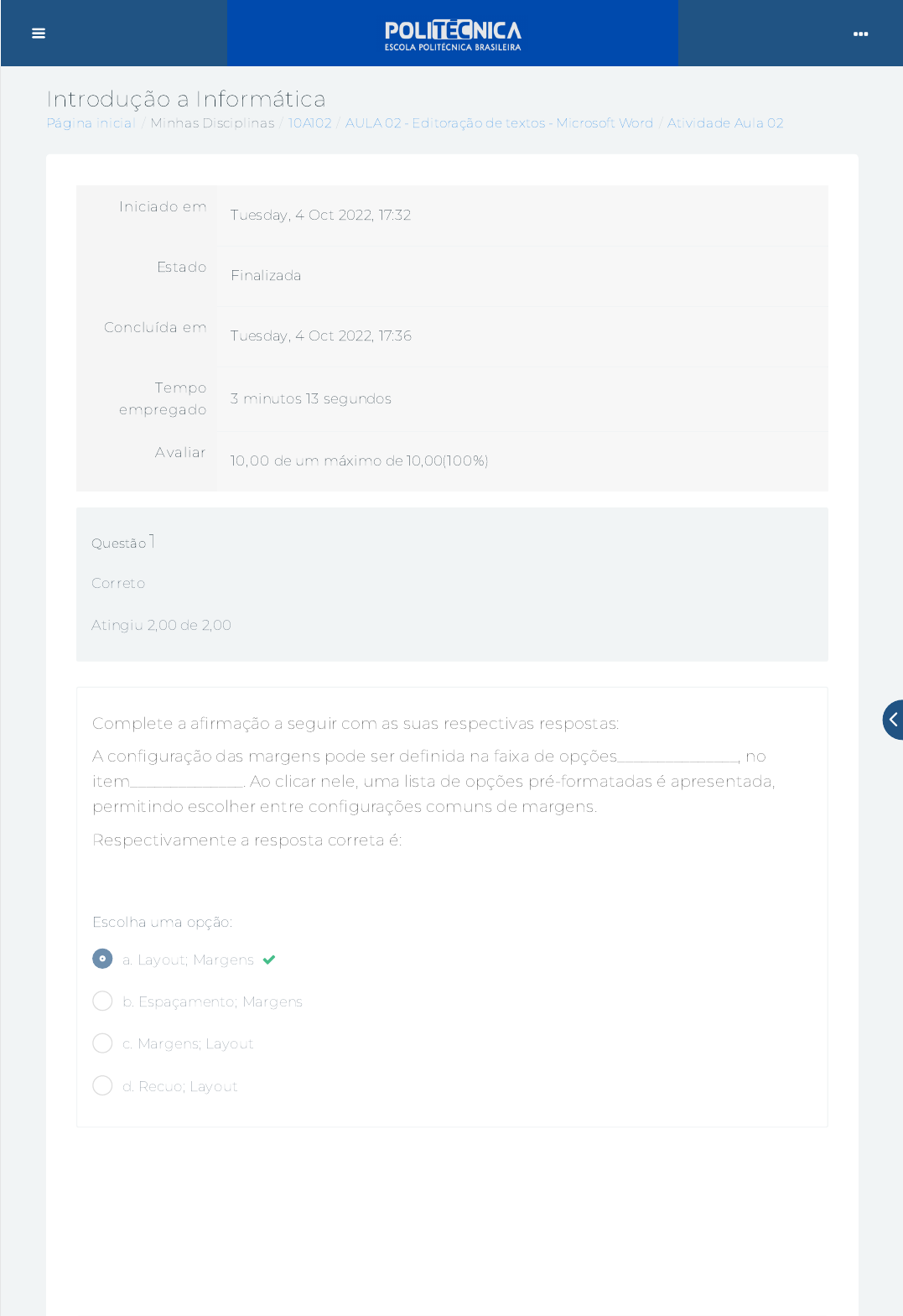 Página inicial / Minhas Disciplinas / 10A102 / AULA 02 - Editoração de textos - Microsoft Word / Atividade Aula 02 Introdução a Informática Iniciado em Tuesday, 4 Oct 2022, 17:32 Estado Finalizada Concluída em Tuesday, 4 Oct 2022, 17:36 Tempo empregado 3 minutos 13 segundos Avaliar 10,00 de um máximo de 10,00(100%) Questão 1 Correto Atingiu 2,00 de 2,00 Complete a a�rmação a seguir com as suas respectivas respostas: A con�guração das margens pode ser de�nida na faixa de opções_______________, no item______________. Ao clicar nele, uma lista de opções pré-formatadas é apresentada, permitindo escolher entre con�gurações comuns de margens. Respectivamente a resposta correta é: Escolha uma opção: a. Layout; Margens b. Espaçamento; Margens c. Margens; Layout d. Recuo; Layout https://ava.politecnicabr.com.br/ https://ava.politecnicabr.com.br/course/view.php?id=829 https://ava.politecnicabr.com.br/course/view.php?id=829#section-18 https://ava.politecnicabr.com.br/mod/quiz/view.php?id=38310 https://ava.politecnicabr.com.br/ Questão 2 Correto Atingiu 2,00 de 2,00 Para selecionar todo o texto de um documento, é possível usar qual atalho de teclado? Escolha uma opção: Questão 3 Correto Atingiu 1,50 de 1,50 Se as opções de margens disponibilizadas no Word não satisfazerem as necessidades do usuário, é possível ainda personalizar cada uma das margens individualmente, selecionando a opção: Escolha uma opção: a. Ctrl+F b. Ctrl+T c. Ctrl+V d. Ctrl+A e. Ctrl+X a. Margens Ajustáveis b. Margens Editáveis c. Margens Espelhadas d. Margens Personalizadas https://ava.politecnicabr.com.br/ Questão 4 Correto Atingiu 1,50 de 1,50 Também é possível abrir a janela Fonte usando o atalho de teclado. Marque a opção correspondente ao atalho. Escolha uma opção: Questão 5 Correto Atingiu 2,00 de 2,00 São quatro funcionalidades de formatação de parágrafos mais conhecidas e utilizadas do Word. Marque a única opção que não corresponde a formatação de parágrafos. Escolha uma opção: a. Ctrl+F quando o texto estiver selecionado b. Ctrl+X quando o texto estiver selecionado c. Ctrl+T quando o texto estiver selecionado d. Ctrl+V quando o texto estiver selecionado e. Ctrl+D quando o texto estiver selecionado a. Alinhar à esquerda b. Centralizar c. Alinhar em marcadores d. Alinhar à direita e. Justi�car https://ava.politecnicabr.com.br/ © 2022 - Escola Politécnica Brasileira Questão 6 Correto Atingiu 1,00 de 1,00 Inserir textos no Word não tem segredos. Basicamente, o texto sempre será inserido na posição em que se encontra o cursor na página. Caso uma parte de texto esteja selecionada, fazer uma inserção de caracteres irá substituir o texto selecionado pelo novo conteúdo digitado. Caso tenha substituído algum texto sem querer, não se preocupe, pois sempre é possível desfazer as últimas ações. Para tanto, qual o atalho de teclado pode ser utilizado? Escolha uma opção: a. Ctrl+X b. Ctrl+A c. Ctrl+V d. Ctrl+F e. Ctrl+Z Entre em Contato https: //www.politecnicabr.com.br 0800 084 2627 0800 084 2627 Links Úteis Dicas da nossa Diretora Acadêmica Planner de Estudos Declaração de Matrícula Orientações do AVA Abertura de Ticket Fale com o Tutor Cronograma de Estudos Manual de Estágio Manual de Competência Siga-nos nas redes sociais https://ava.politecnicabr.com.br/mod/quiz/0 https://www.politecnicabr.com.br/ https://soundcloud.com/user-501638417/sets/escola-politecnica-brasileira https://storage.googleapis.com/sirius-pubstore/semestre_plannerdeestudo%20poli.pdf https://storage.googleapis.com/sirius-pubstore/declaracao_matricula.pdf https://storage.googleapis.com/sirius-pubstore/orientacoes_ava.pdf https://storage.googleapis.com/sirius-pubstore/abertura_ticket.pdf https://storage.googleapis.com/sirius-pubstore/fale_com_tutor.pdf https://storage.googleapis.com/sirius-pubstore/cronograma_estudos.pdf https://storage.googleapis.com/sirius-pubstore/manual_estagio.pdf https://storage.googleapis.com/sirius-pubstore/manual_competencia.pdf https://www.facebook.com/politecnicabr https://www.instagram.com/politecnicabr_oficial https://ava.politecnicabr.com.br/